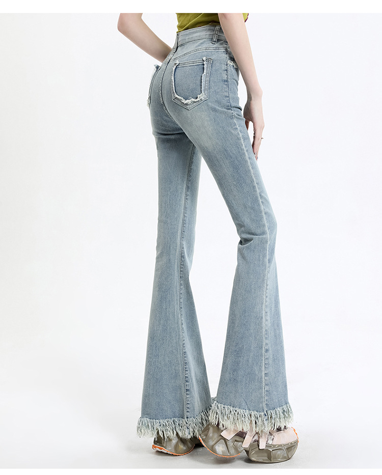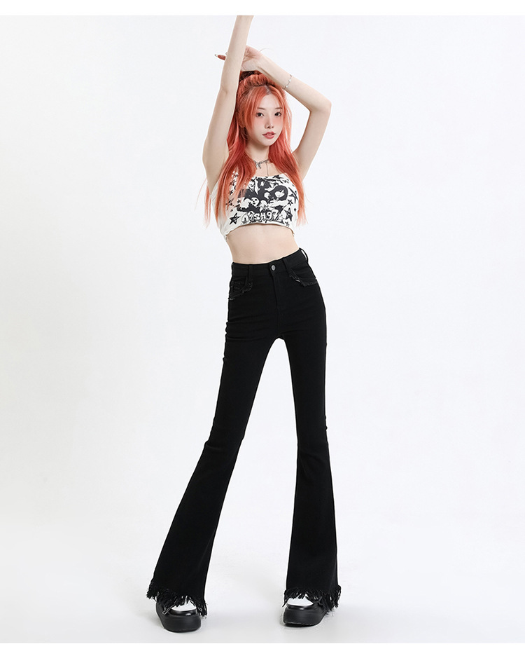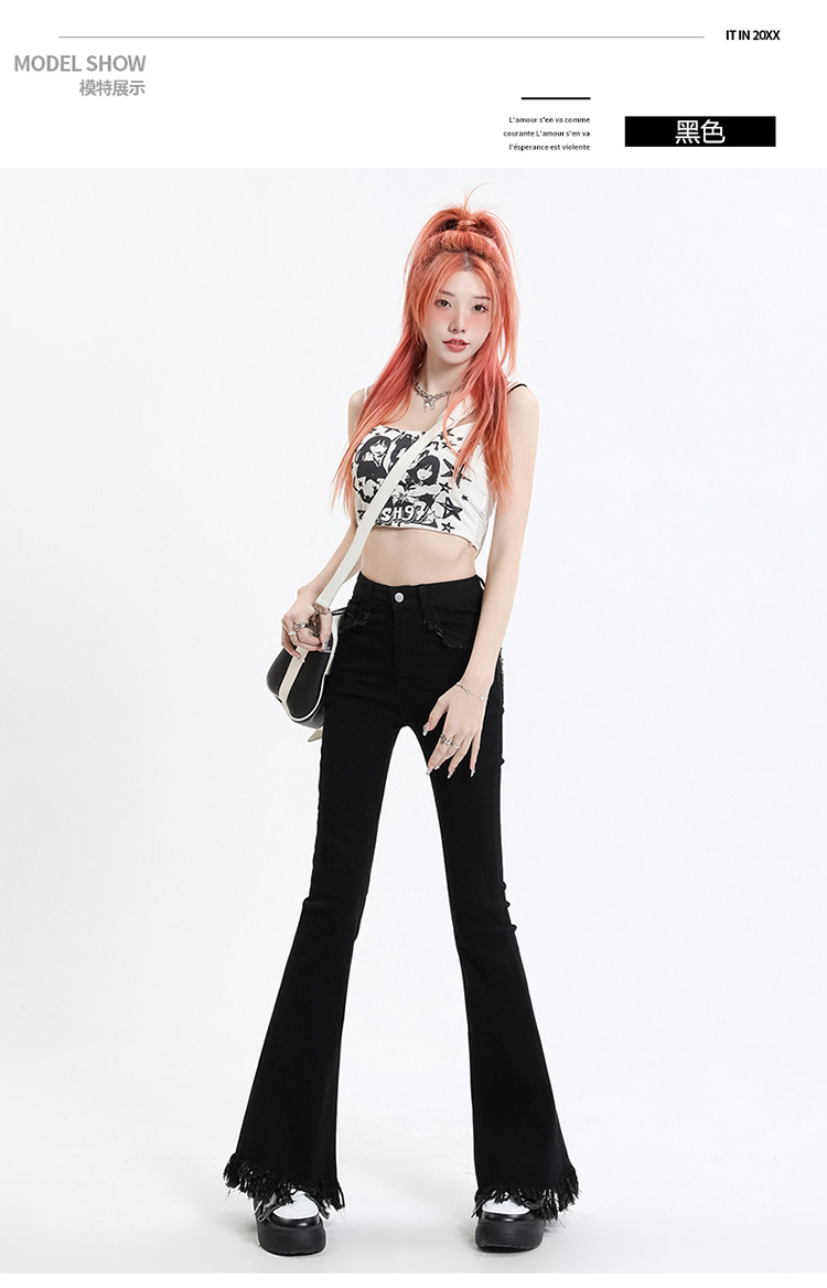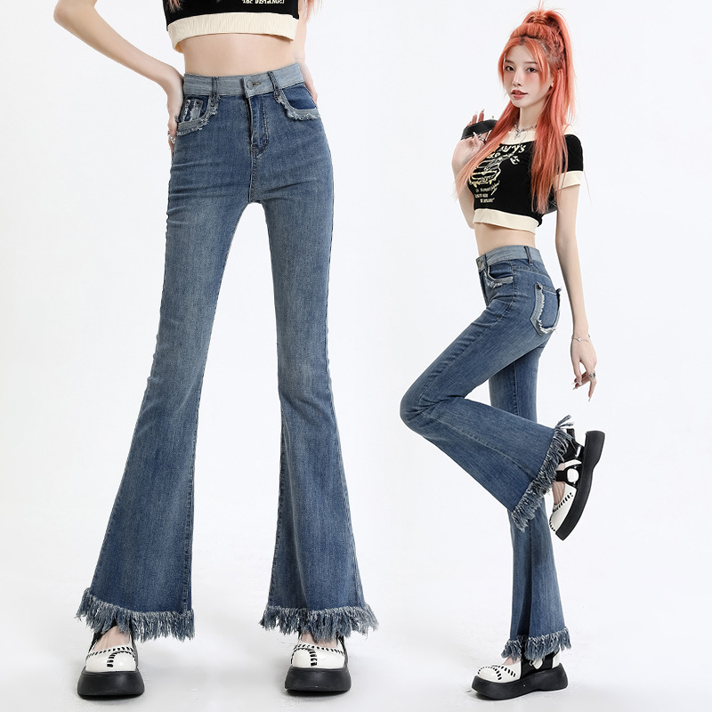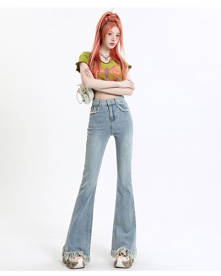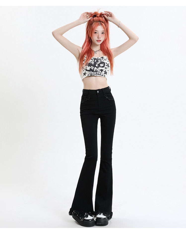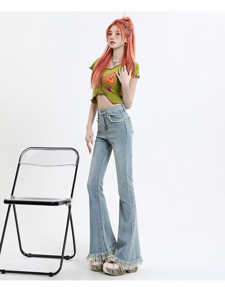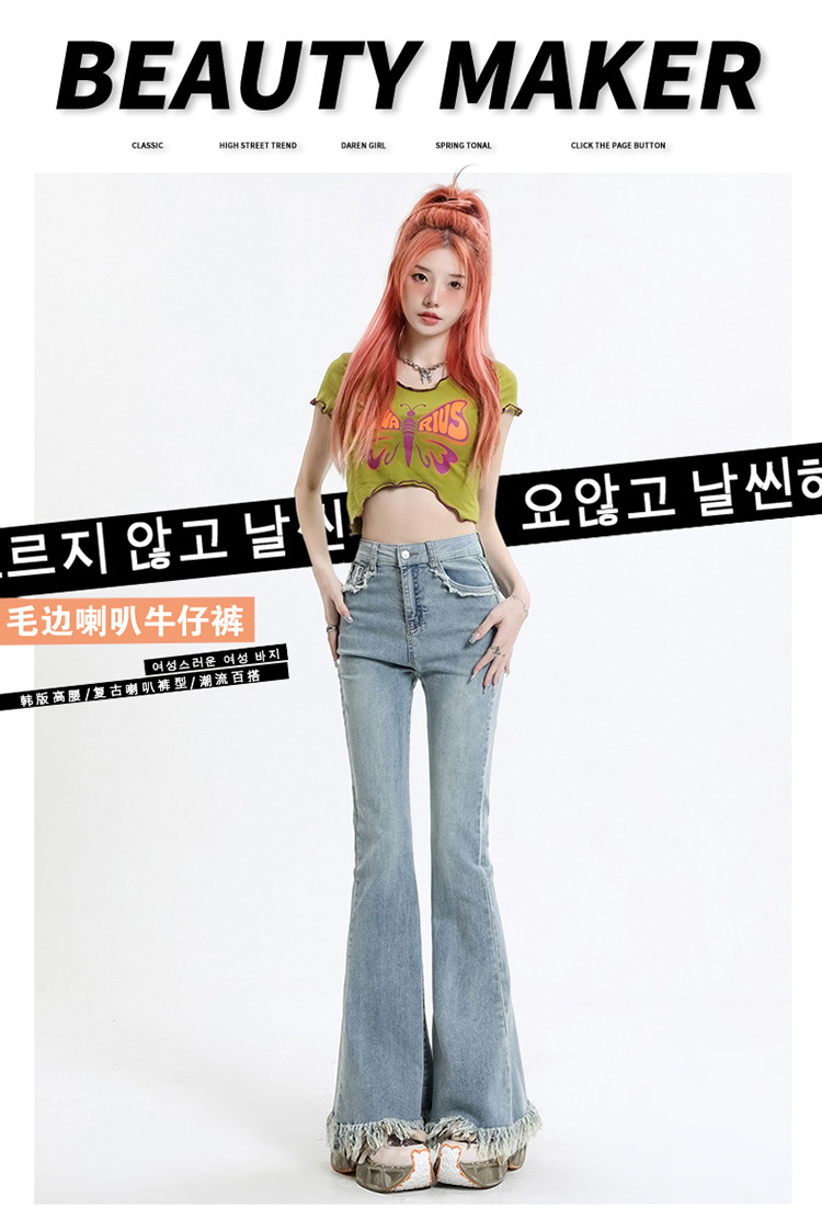빈티지 스파이스 소녀 술 마이크로 플레어 진 여성 여름 새로운 패션 슬리밍 높은 허리 프린지 말굽 바지스토어 가기