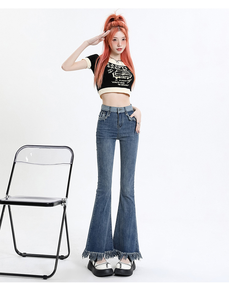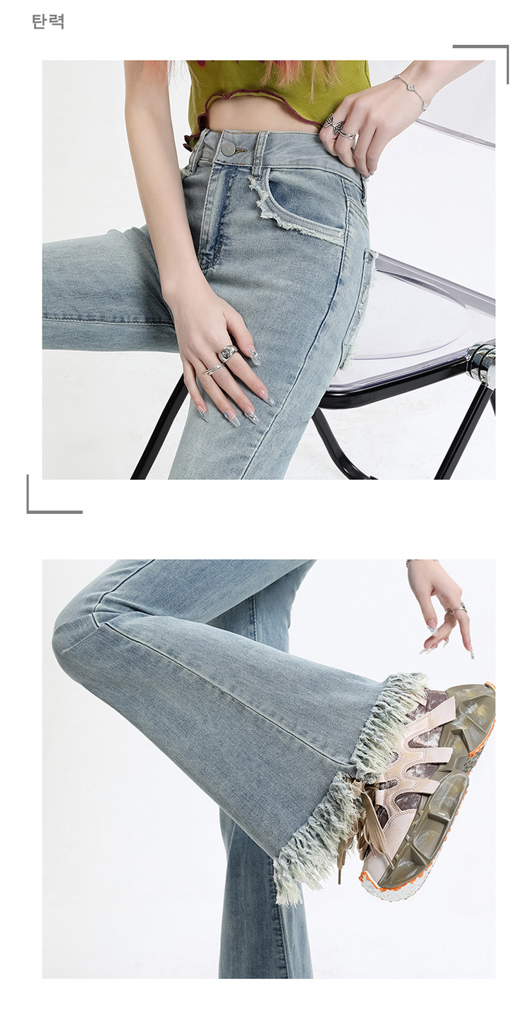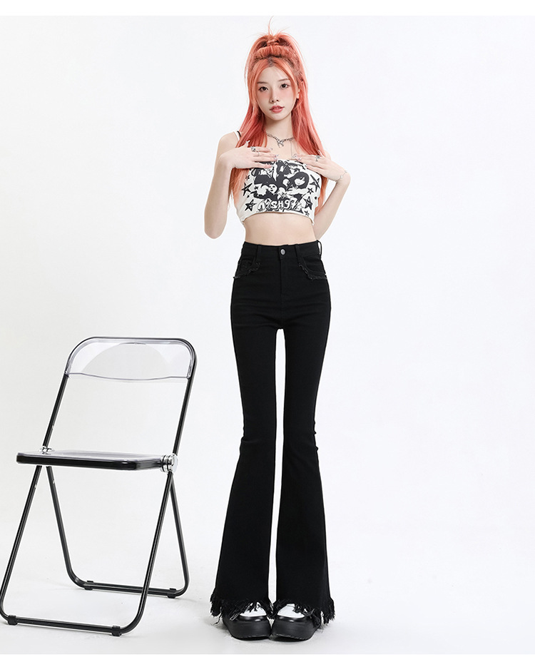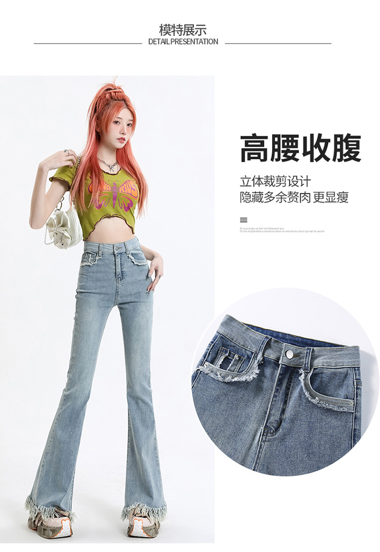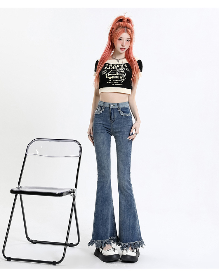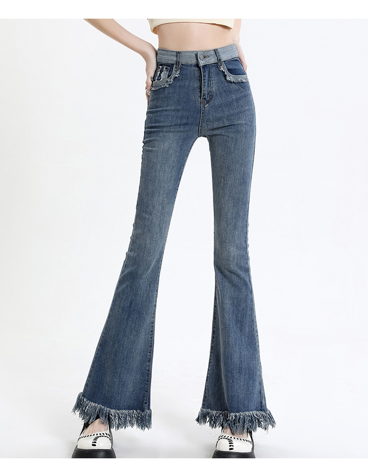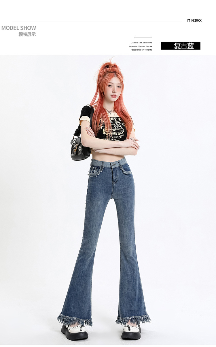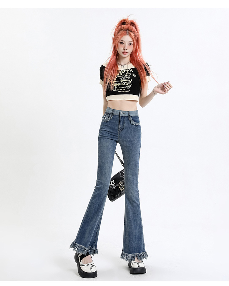 빈티지 스파이스 소녀 술 마이크로 플레어 진 여성 여름 새로운 패션 슬리밍 높은 허리 프린지 말굽 바지스토어 가기