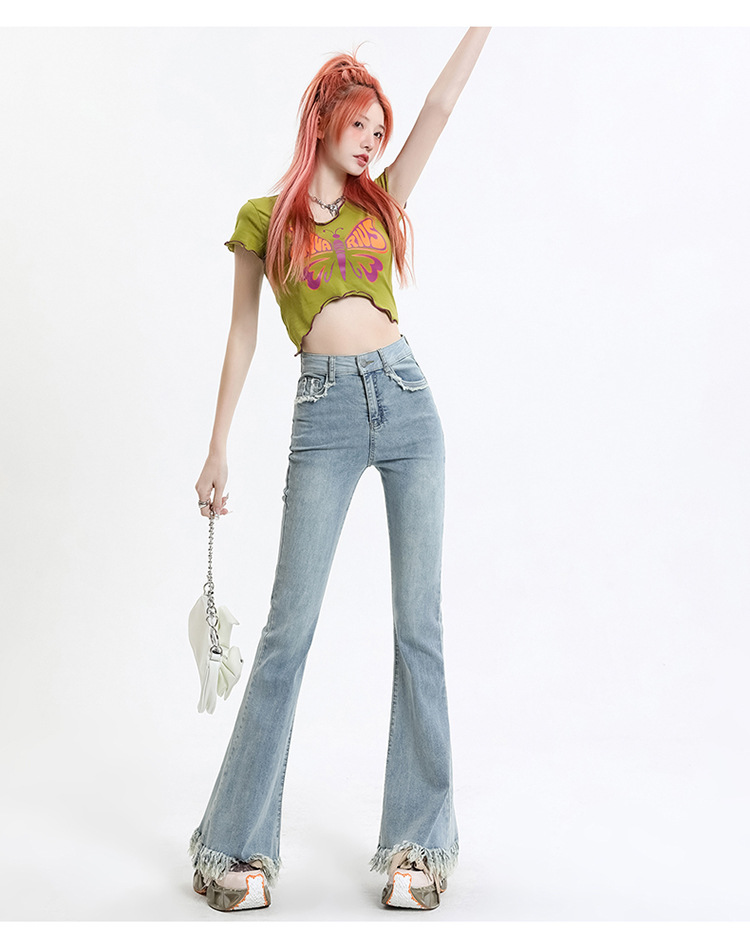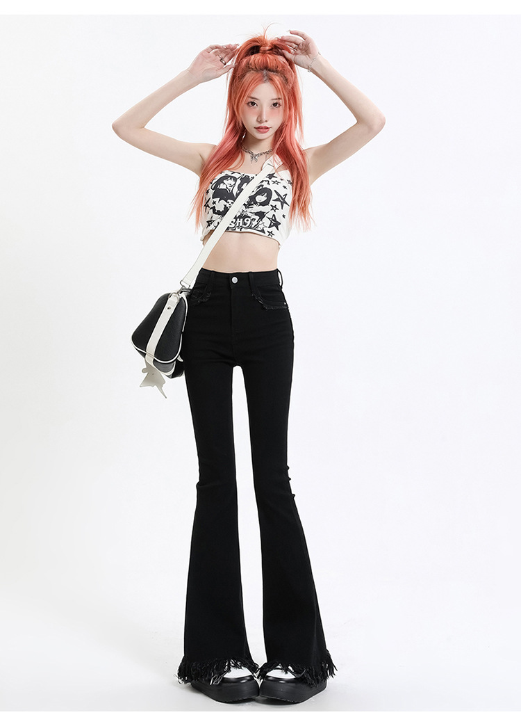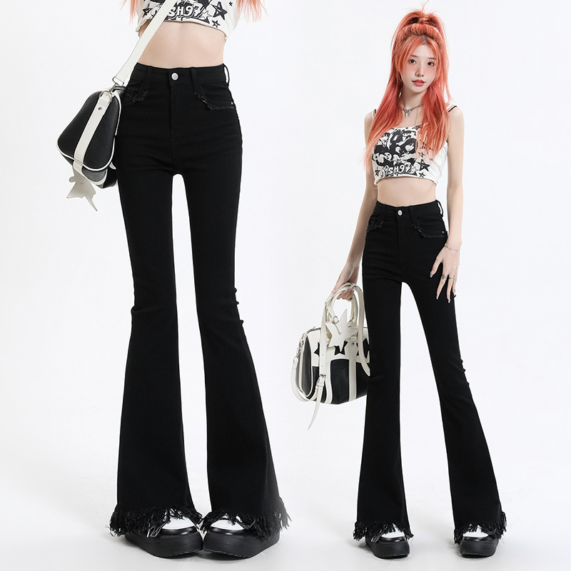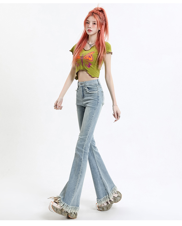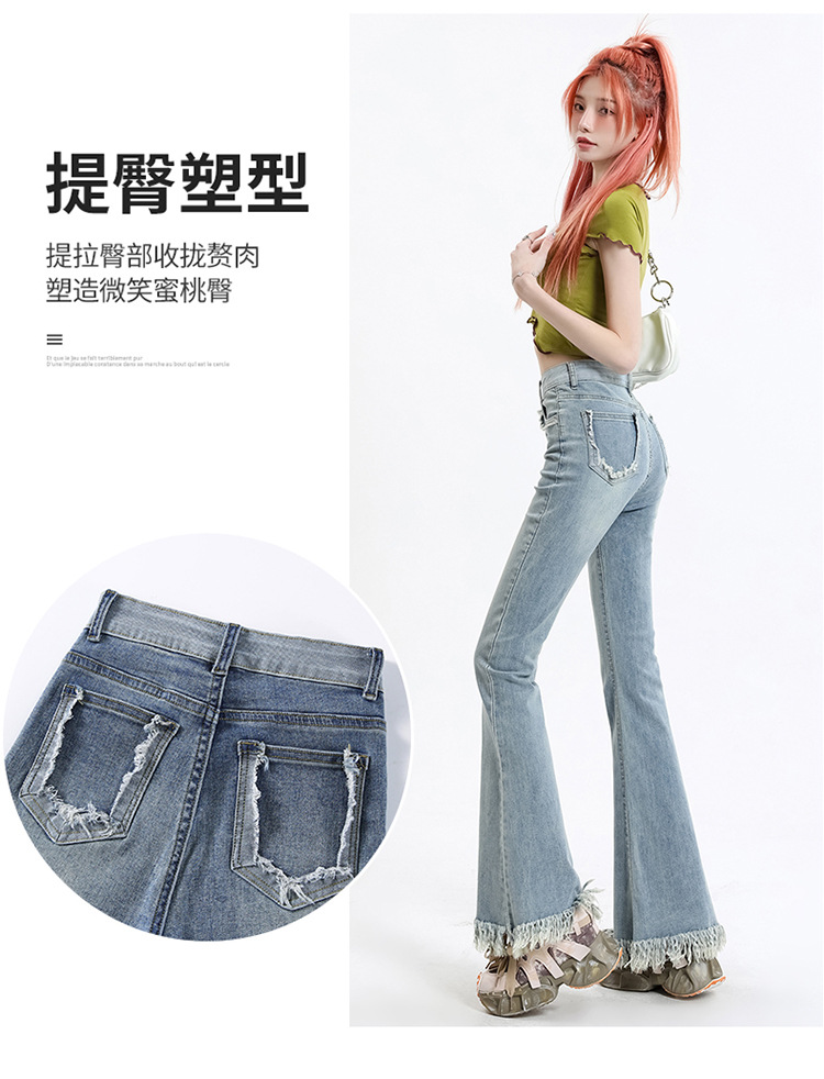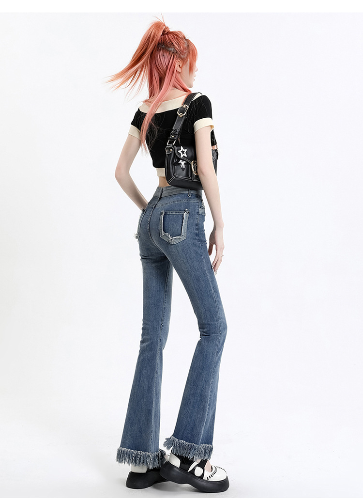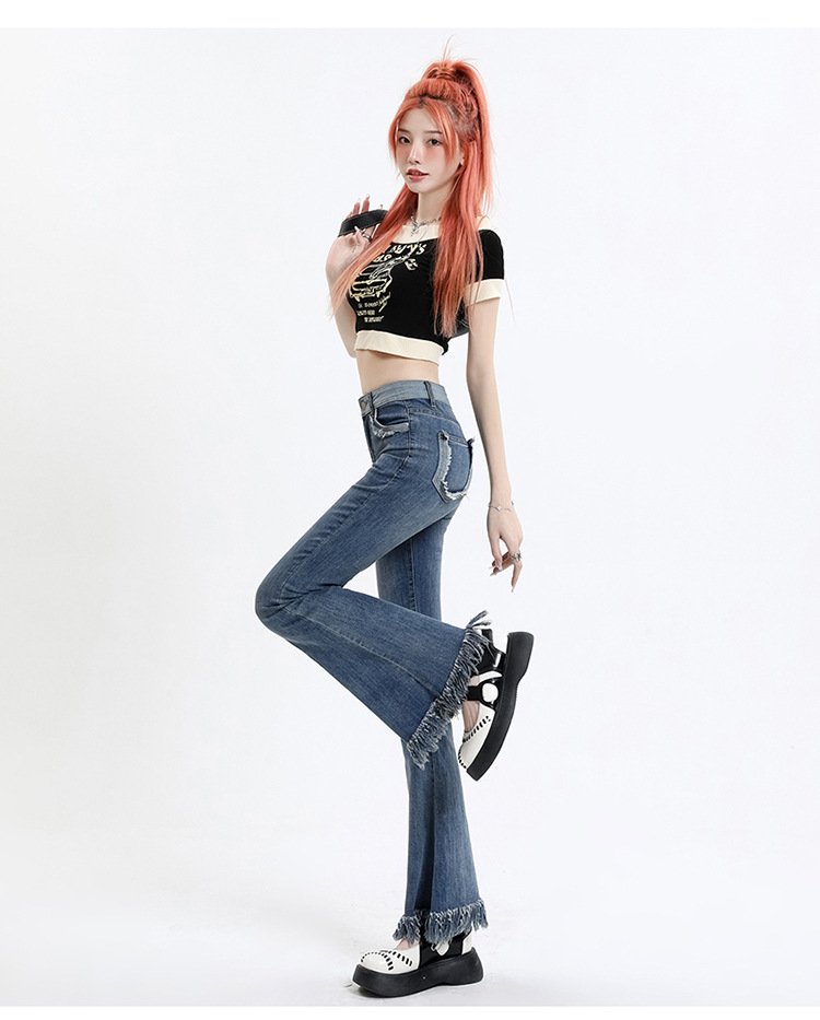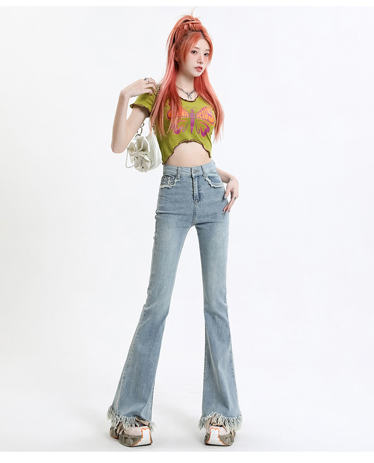 빈티지 스파이스 소녀 술 마이크로 플레어 진 여성 여름 새로운 패션 슬리밍 높은 허리 프린지 말굽 바지스토어 가기