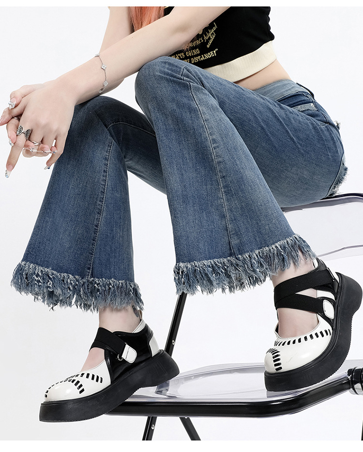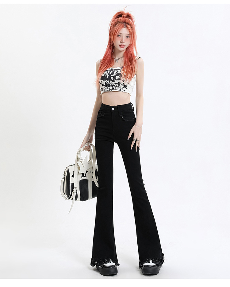 빈티지 스파이스 소녀 술 마이크로 플레어 진 여성 여름 새로운 패션 슬리밍 높은 허리 프린지 말굽 바지