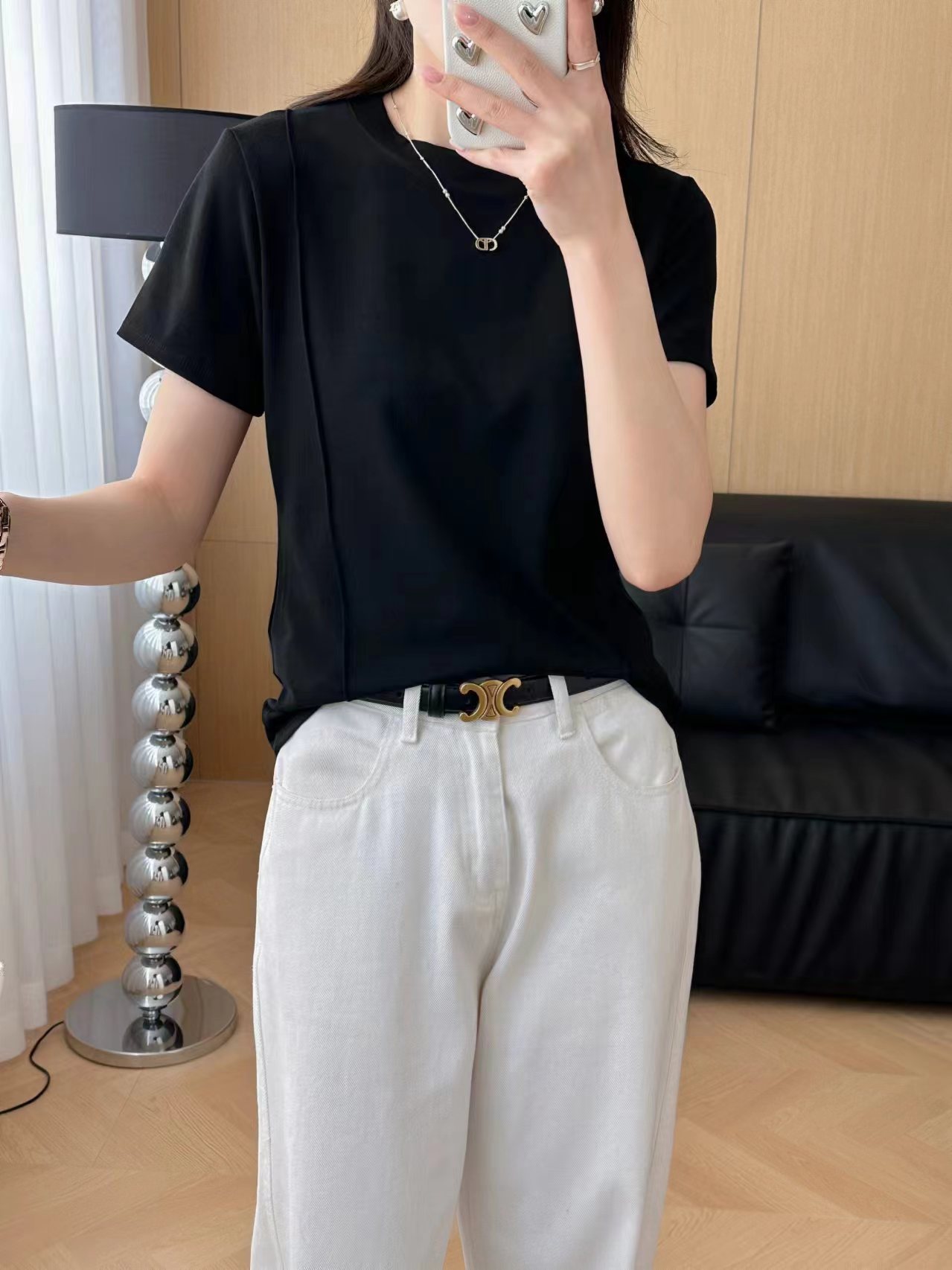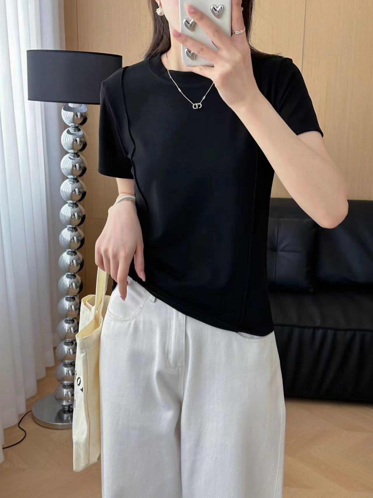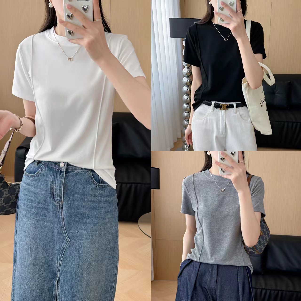 크루 넥 반팔 티셔츠 여성 여름 2024 새로운 T 디자인 센스 슬리밍 불규칙한 단색 피본 올매치 탑스토어 가기