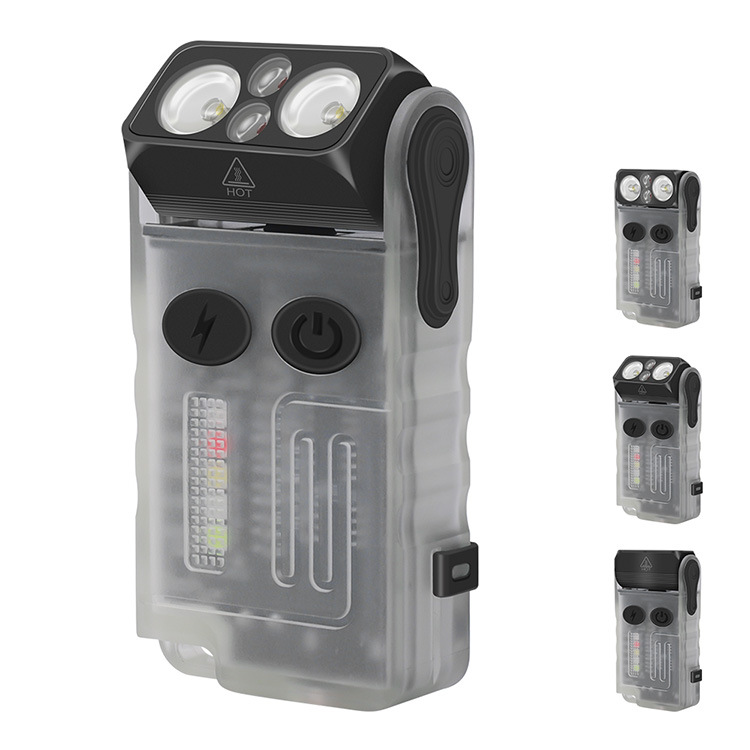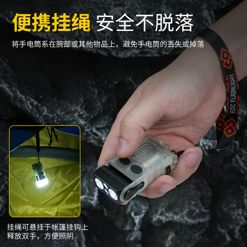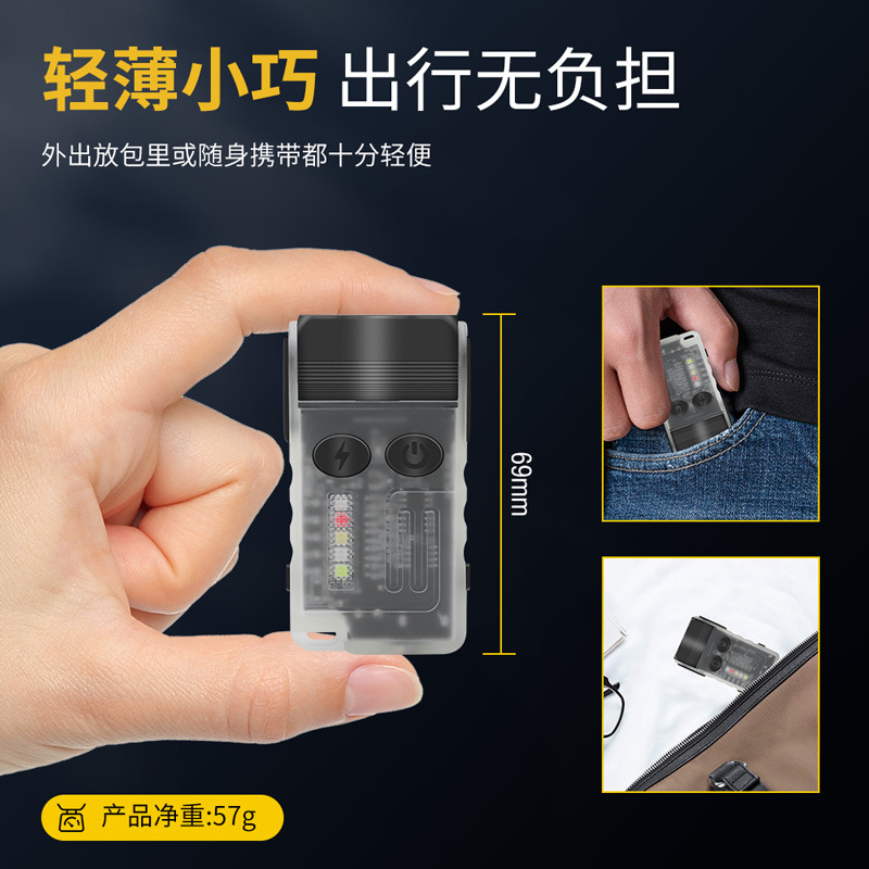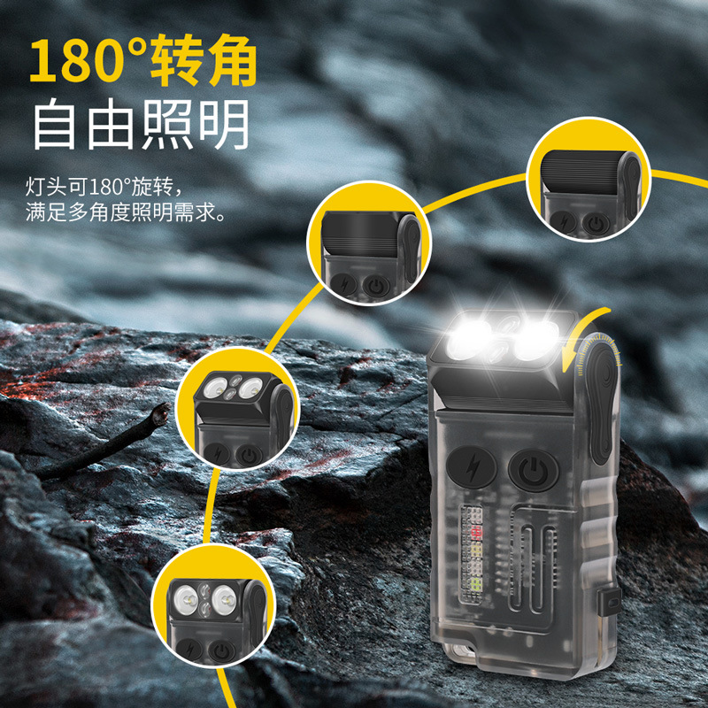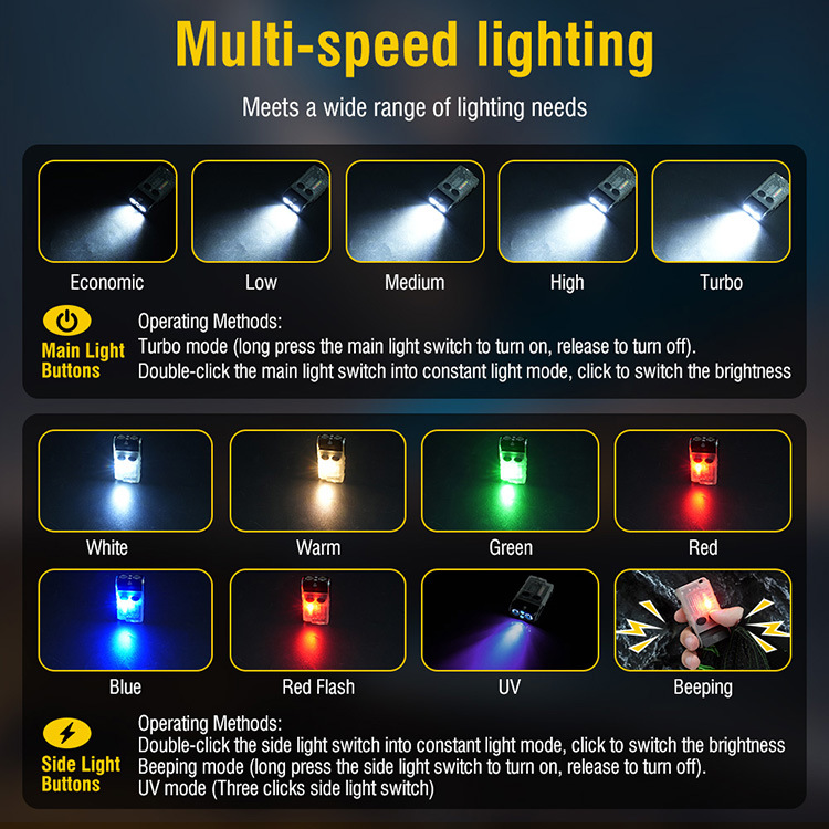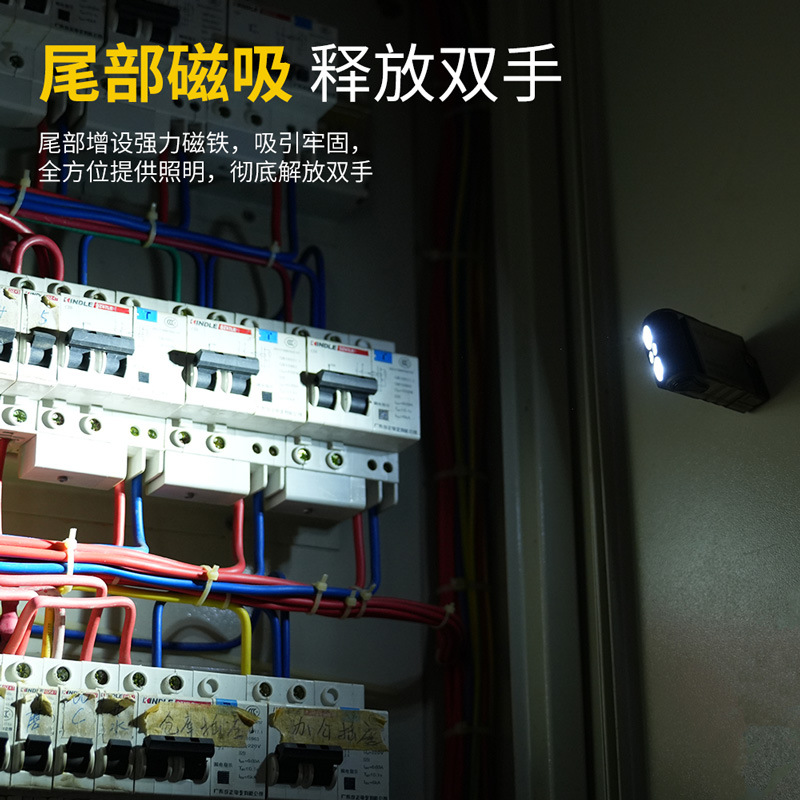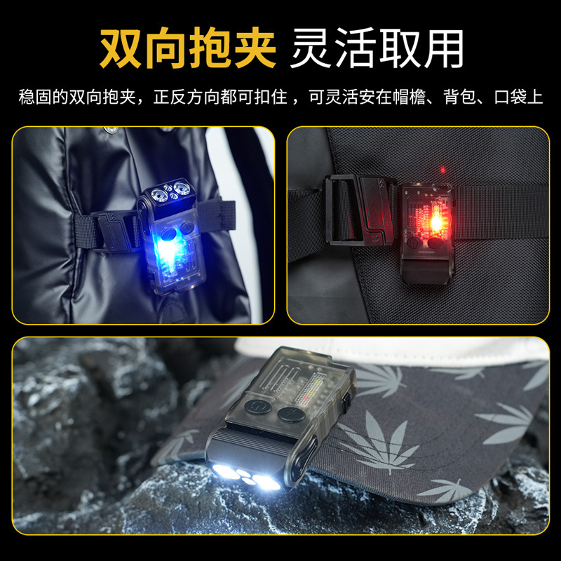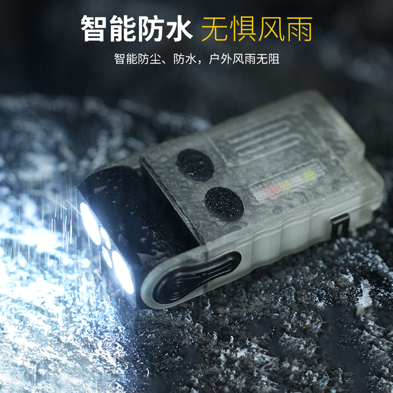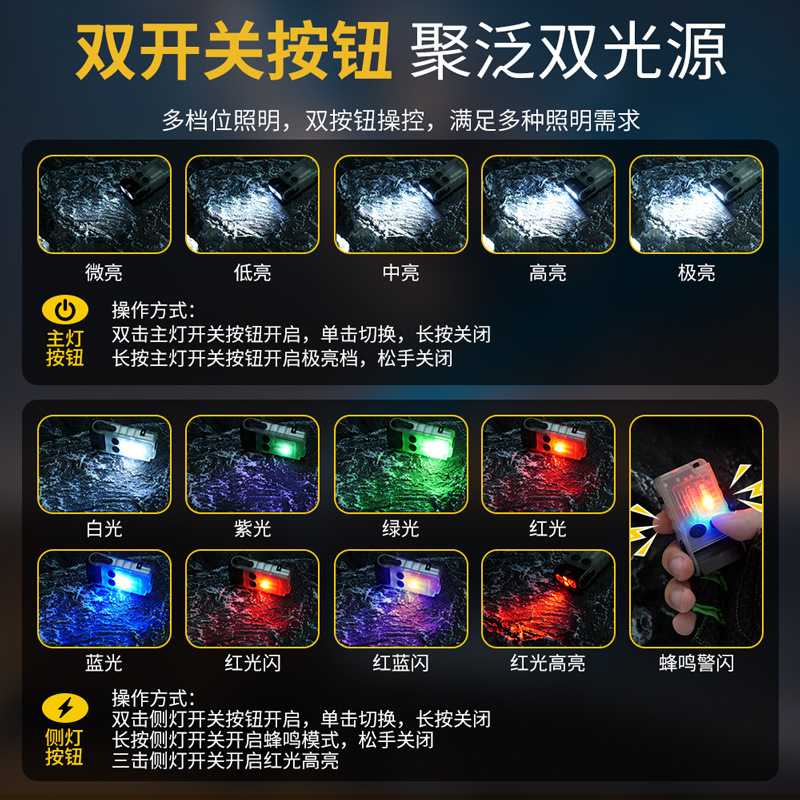 双击附灯开关:彩光亮:白光-紫光-绿光-红光-蓝光-红关闪-红蓝闪循环。 长按关机,带记忆.长按进入警报声 三击附灯开:红灯亮(50LM)