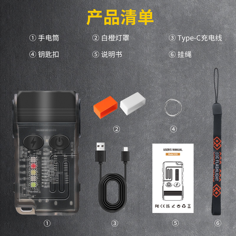 全套配置:手电筒+充电线+1个白色胶套+1个橙色胶套+挂绳+盒子+说明书