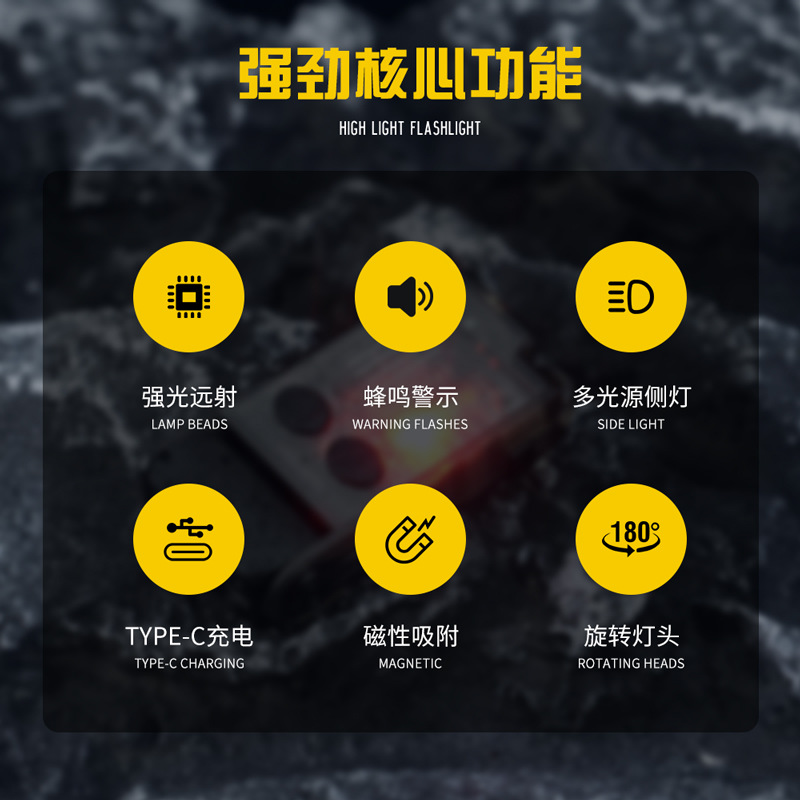 发光档位:双击主灯开关:进入主灯亮:微亮-低亮-中亮-高亮 循环(长按关机),带忆记。关机状态下长按进入极亮