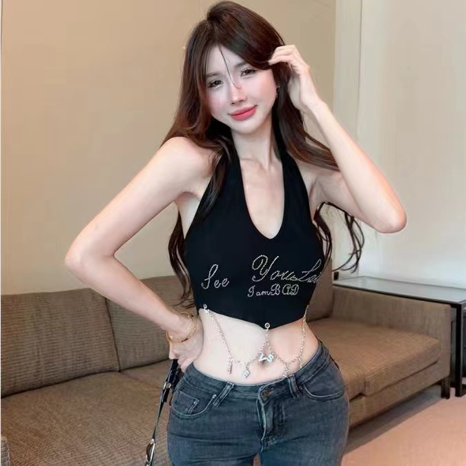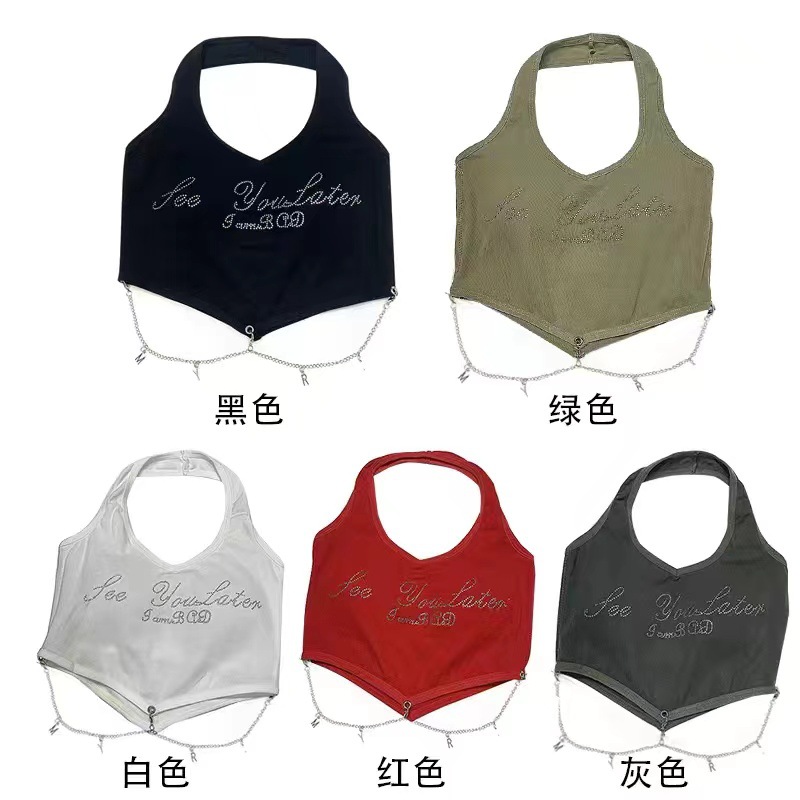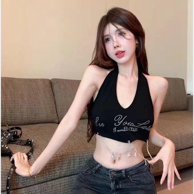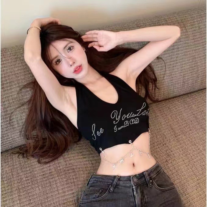 달콤하고 매운 핫 드릴링 레터 체인 넥 조끼 작은 슬링 슬림 내부 백리스 짧은 여성 탑스토어 가기