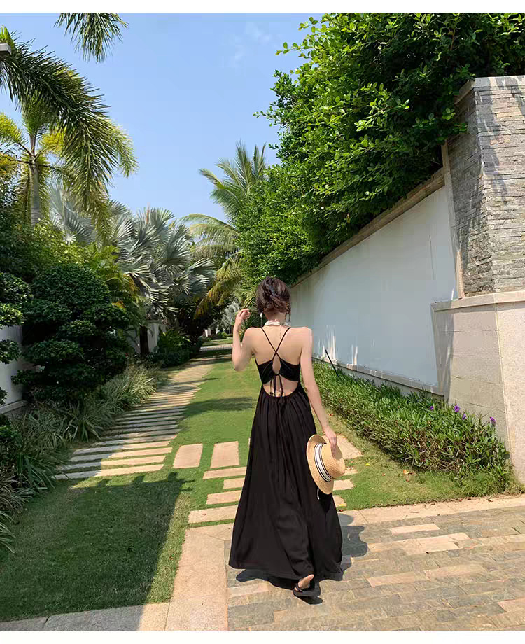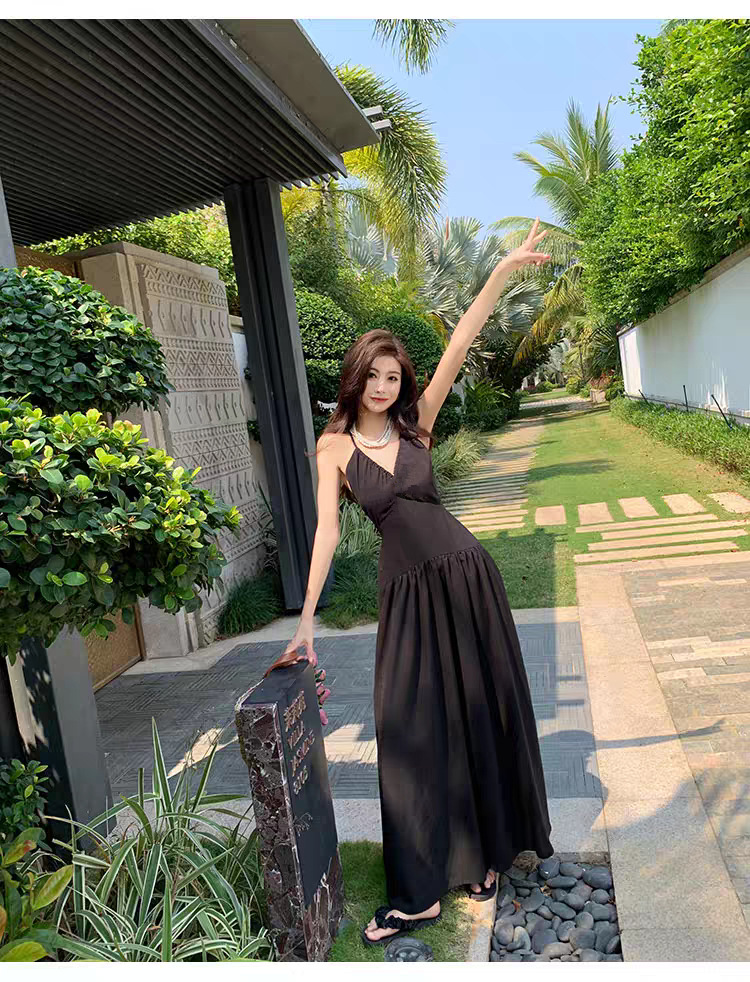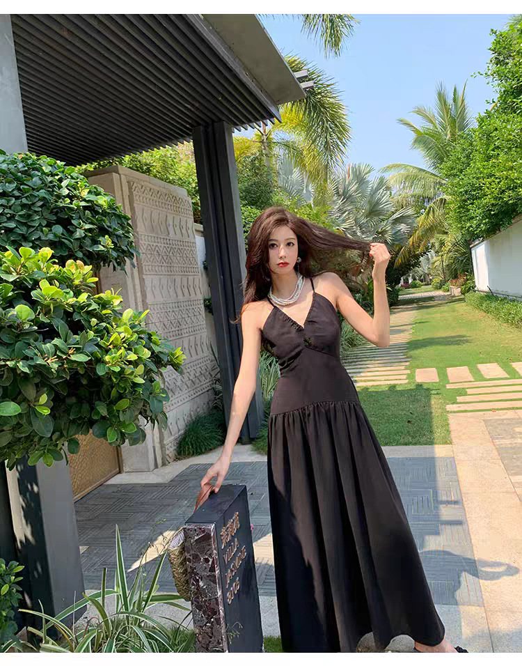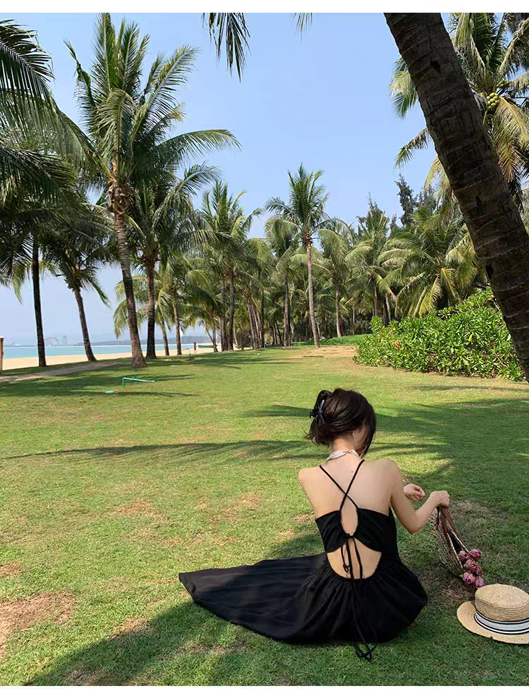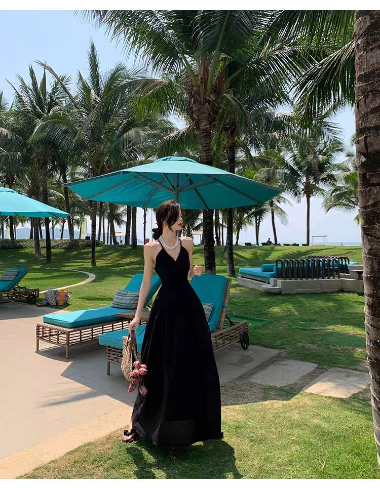 여름 새로운 해변 휴가 목 해변 스커트 질감 차 브레이크 학생 여성을위한 프랑스 헵번 스타일 원피스