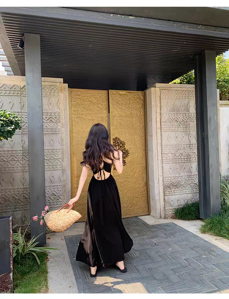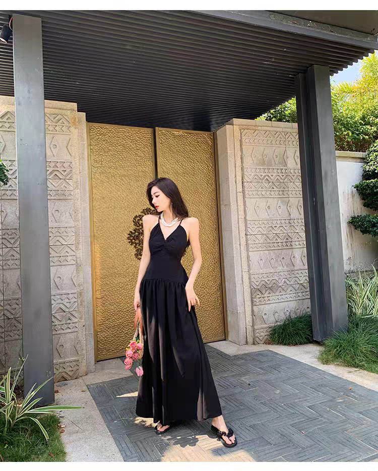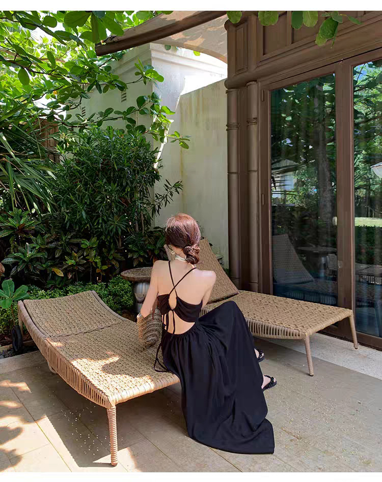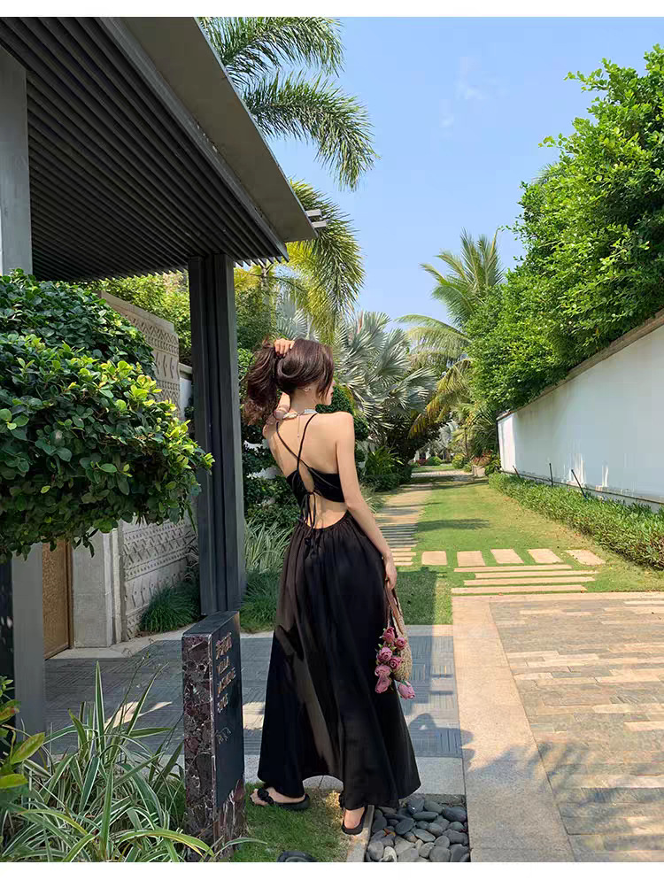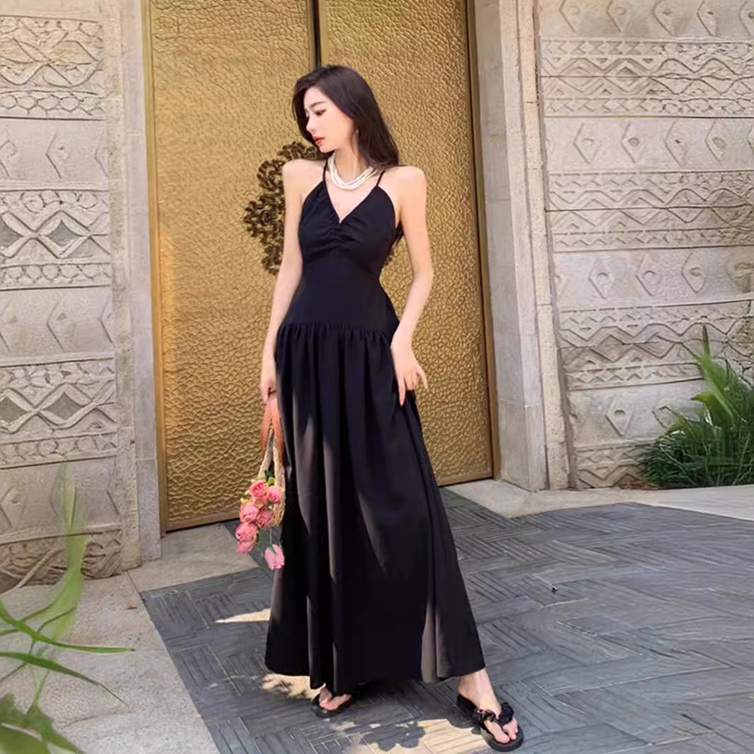 여름 새로운 해변 휴가 목 해변 스커트 질감 차 브레이크 학생 여성을위한 프랑스 헵번 스타일 원피스