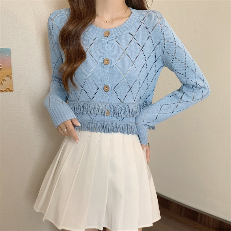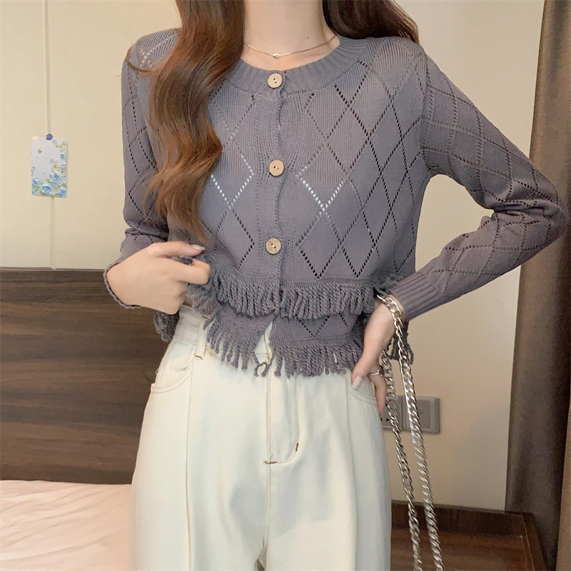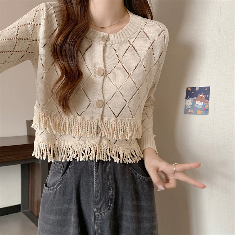 외국식 할로우 프린지 니트 카디건 여성용 긴소매 아우터웨어 2023 가을착용 레트로 더블레이어 쇼트 스웨터 코트스토어 가기