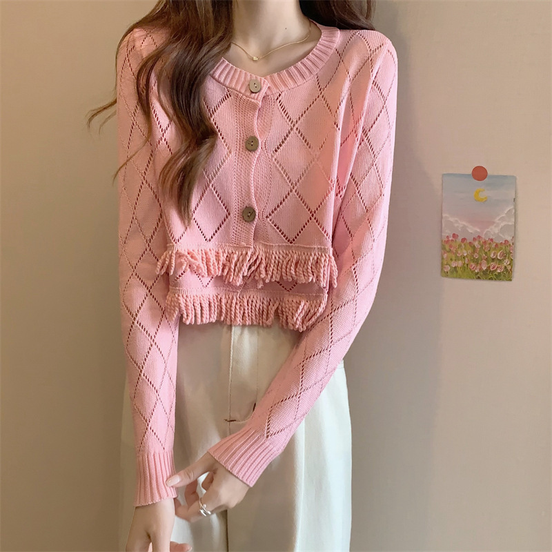 외국식 할로우 프린지 니트 카디건 여성용 긴소매 아우터웨어 2023 가을착용 레트로 더블레이어 쇼트 스웨터 코트