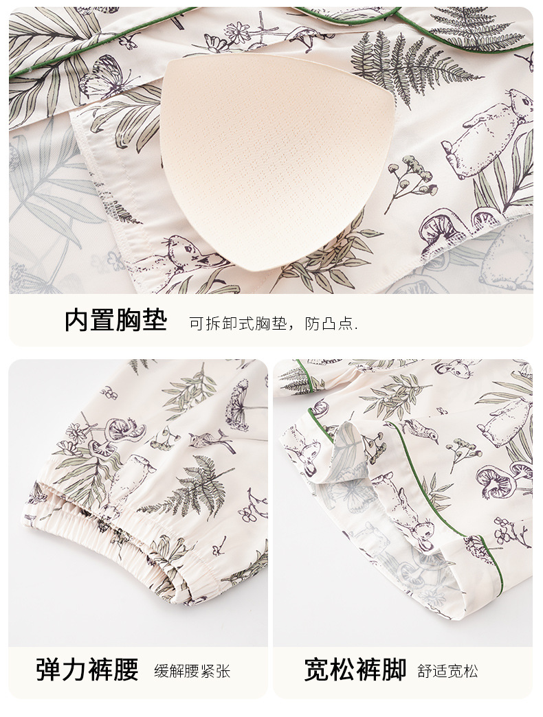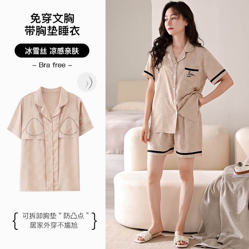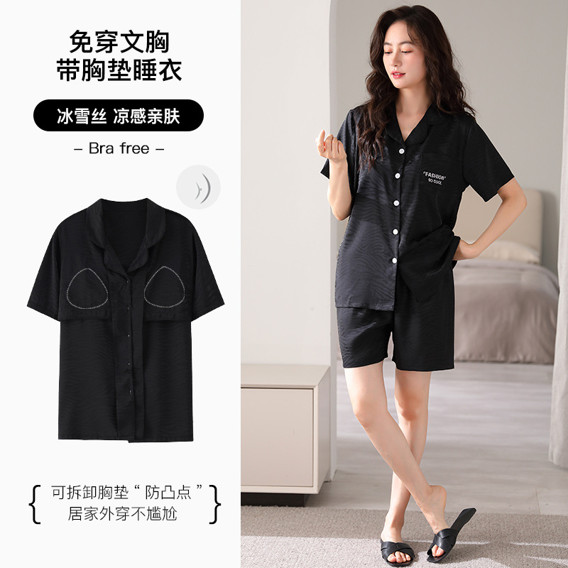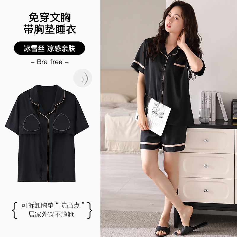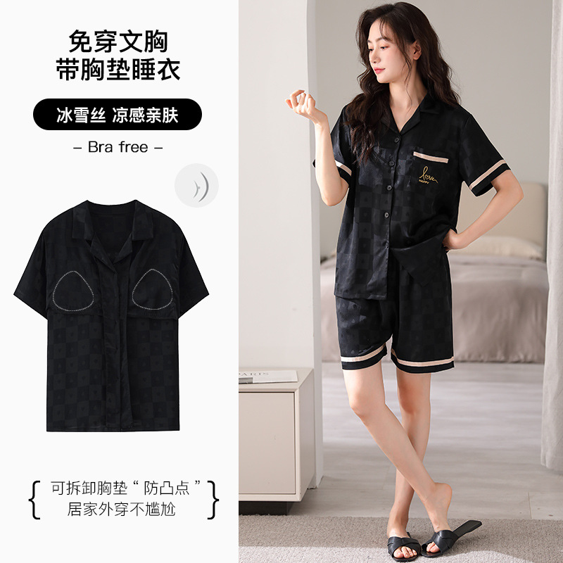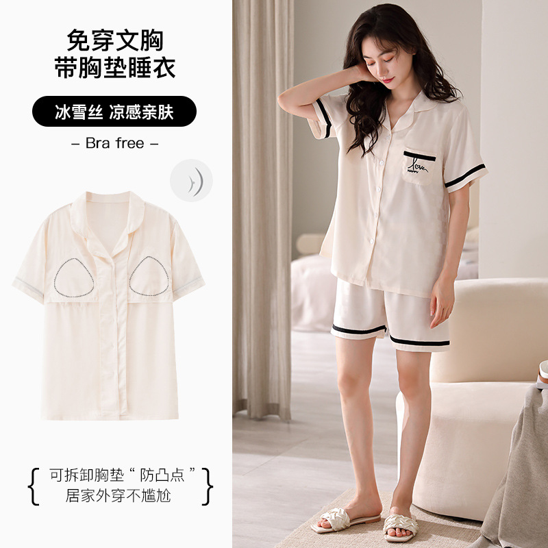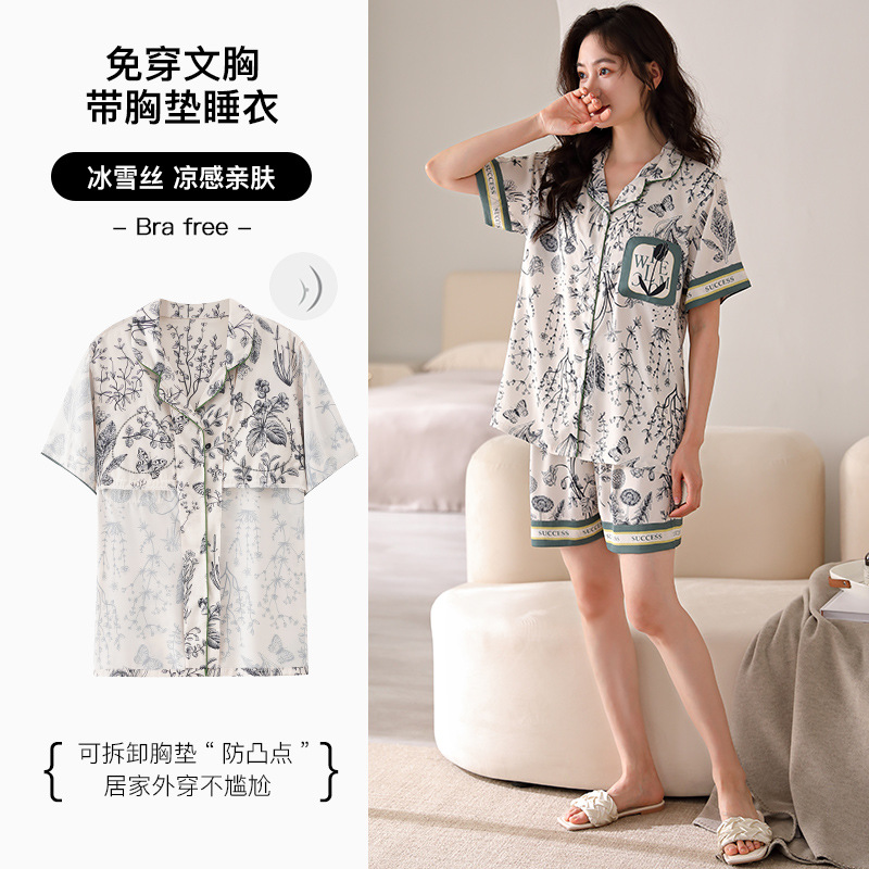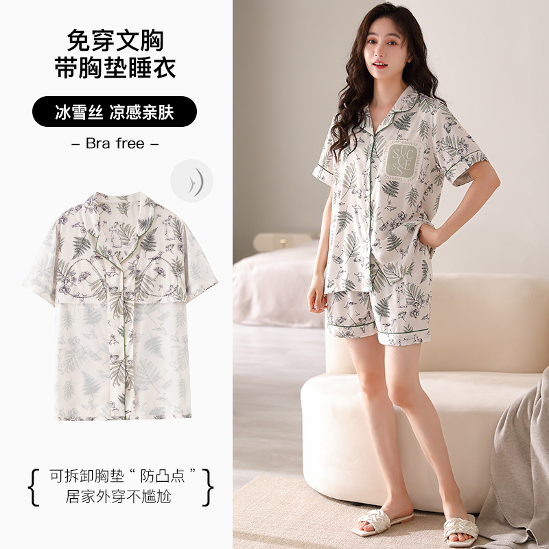 아이스 실크 잠옷 여성 여름 2024 새로운 도착 아웃웨어 짧은 소매 반바지 여름 얇은 여름 홈 의류 가슴 패드