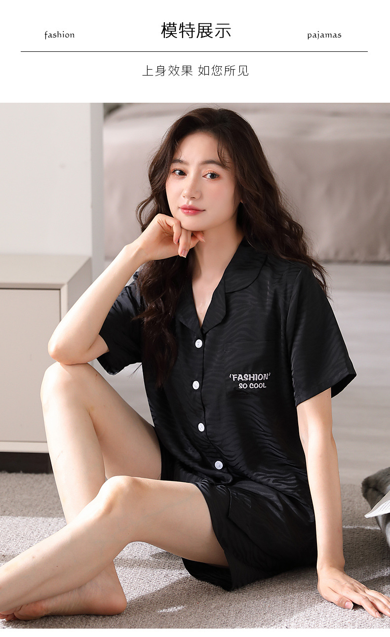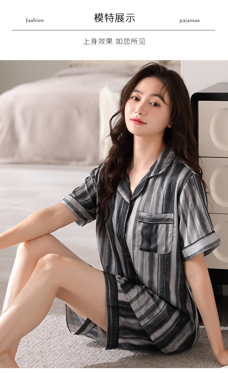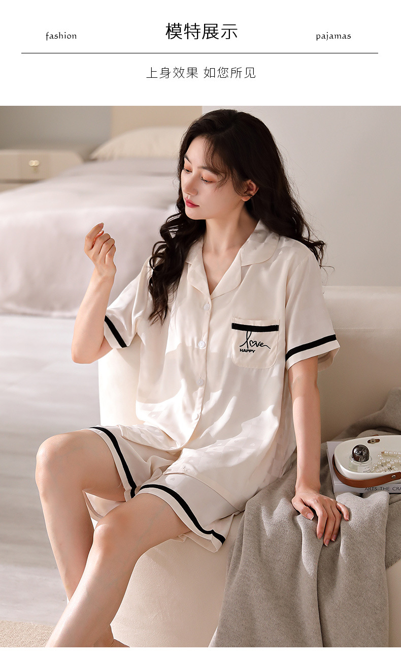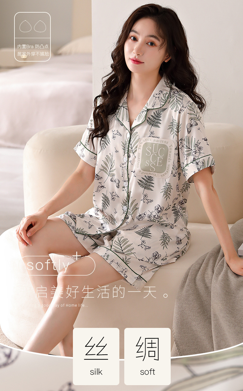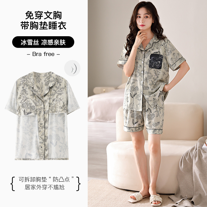 아이스 실크 잠옷 여성 여름 2024 새로운 도착 아웃웨어 짧은 소매 반바지 여름 얇은 여름 홈 의류 가슴 패드스토어 가기