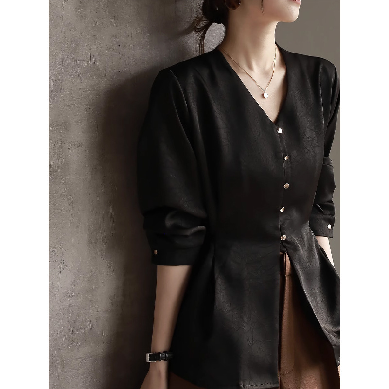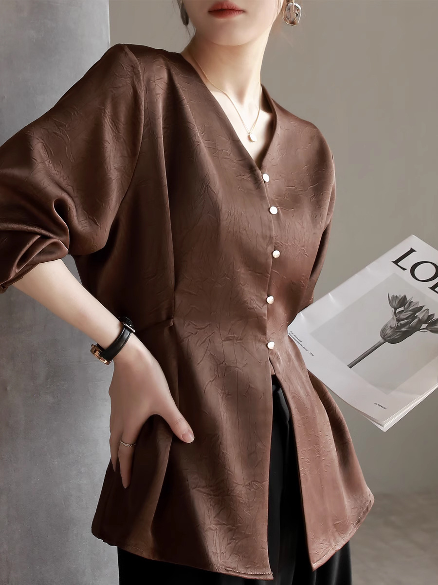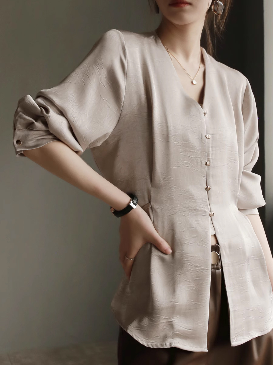 새틴 드레이프 광택 구겨진 2024 봄 새로운 V 넥 허리 우아한 셔츠 여성용 슬림 탑