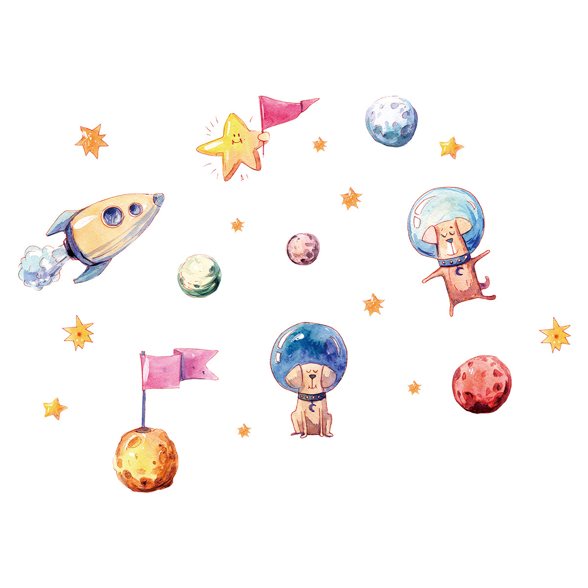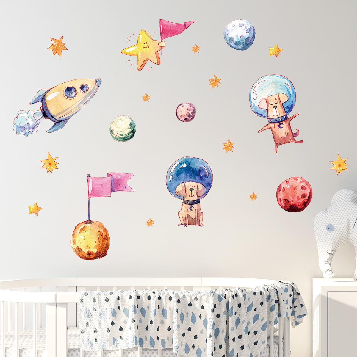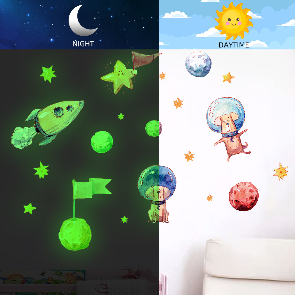 BR-YG013 빛나는 만화 우주 우주 판타지 귀여운 강아지 자기 접착 벽 스티커 어린이 방 장식 스티커스토어 가기