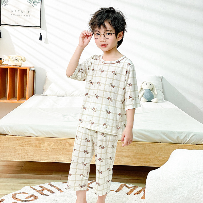2024 소년 소녀를위한 여름 새 어린이 홈 의류 세트 중소형 어린이 에어컨 세트 용 Lyocell 슬리브 파자마스토어 가기