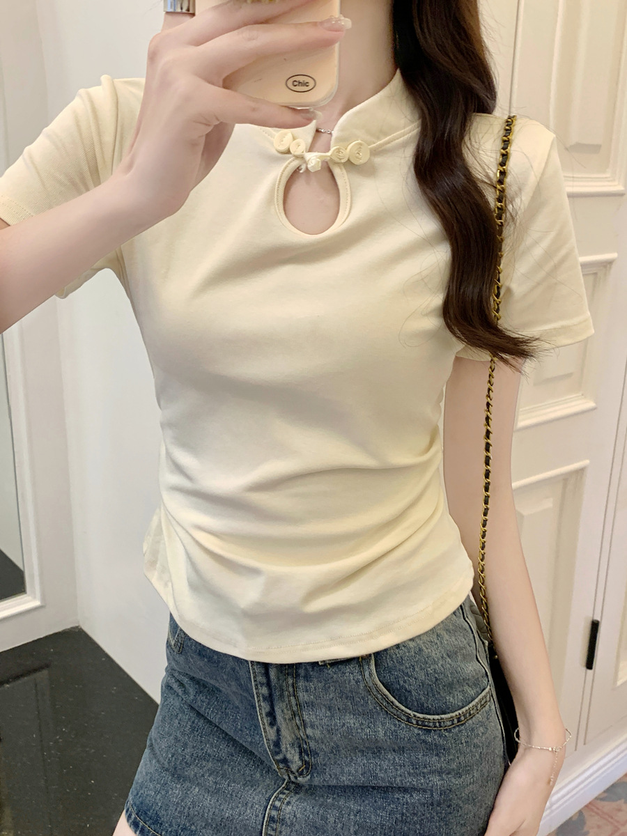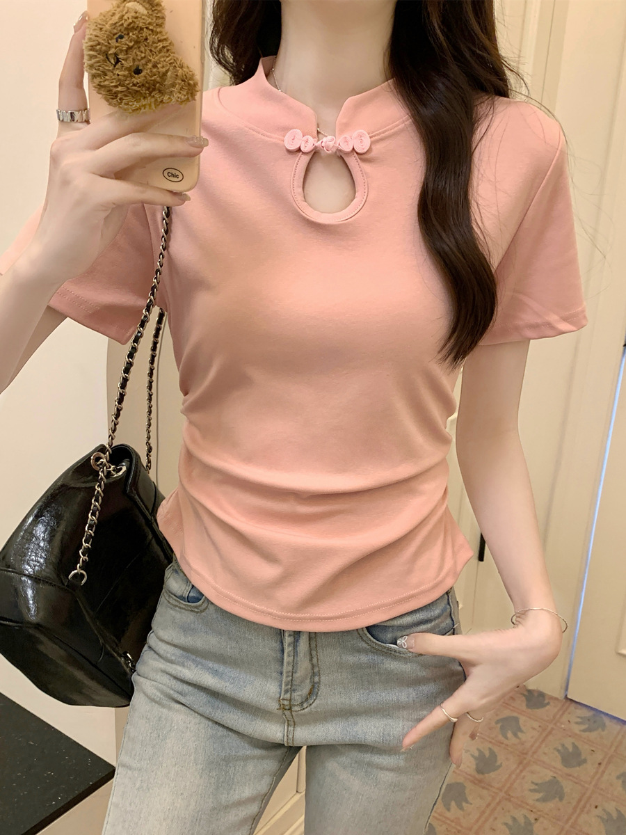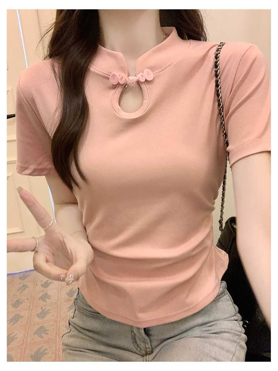 새로운 중국 스타일 할로우 버튼 짧은 소매 탑 여름 새로운 유행 인기 간단한 올 매치 캐주얼 솔리드 컬러 티셔츠