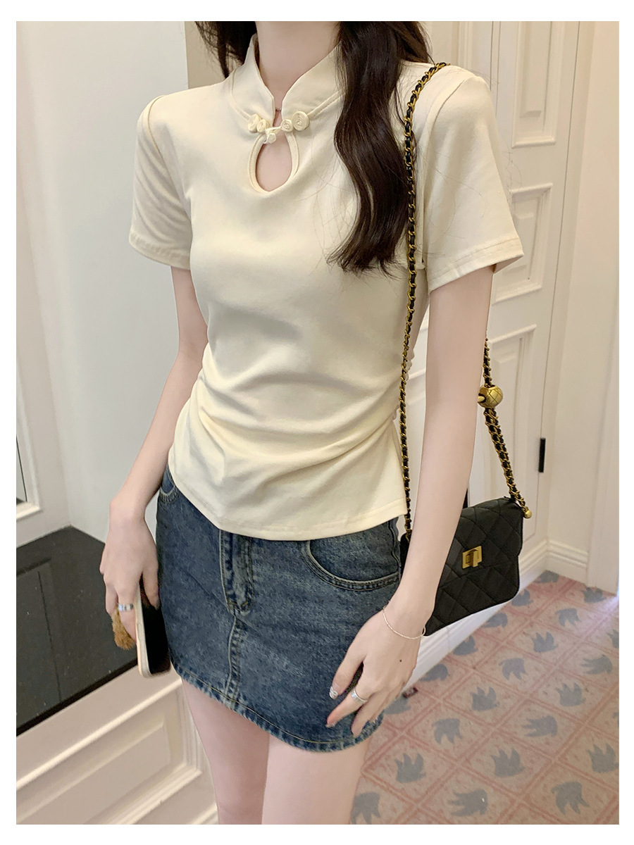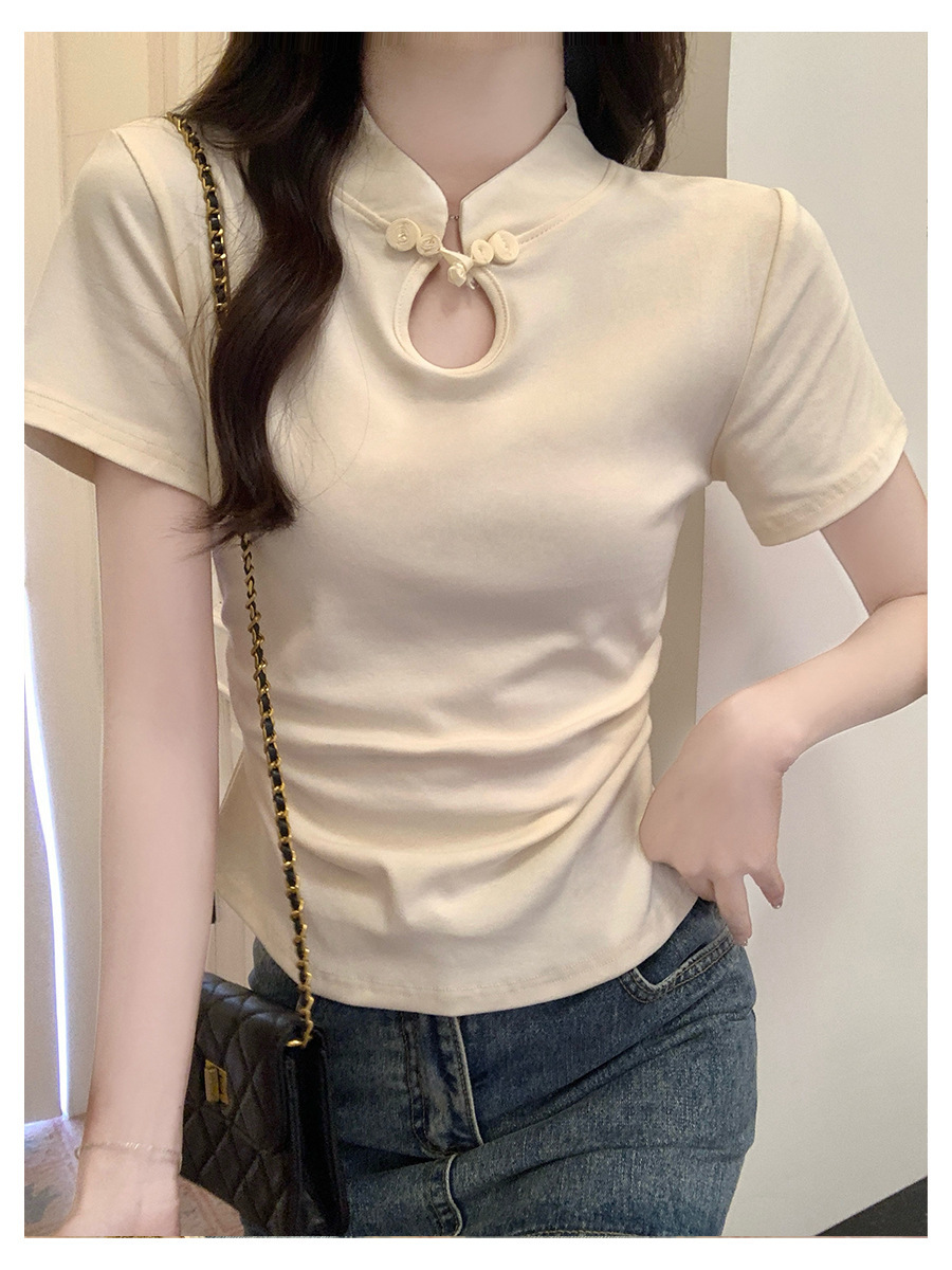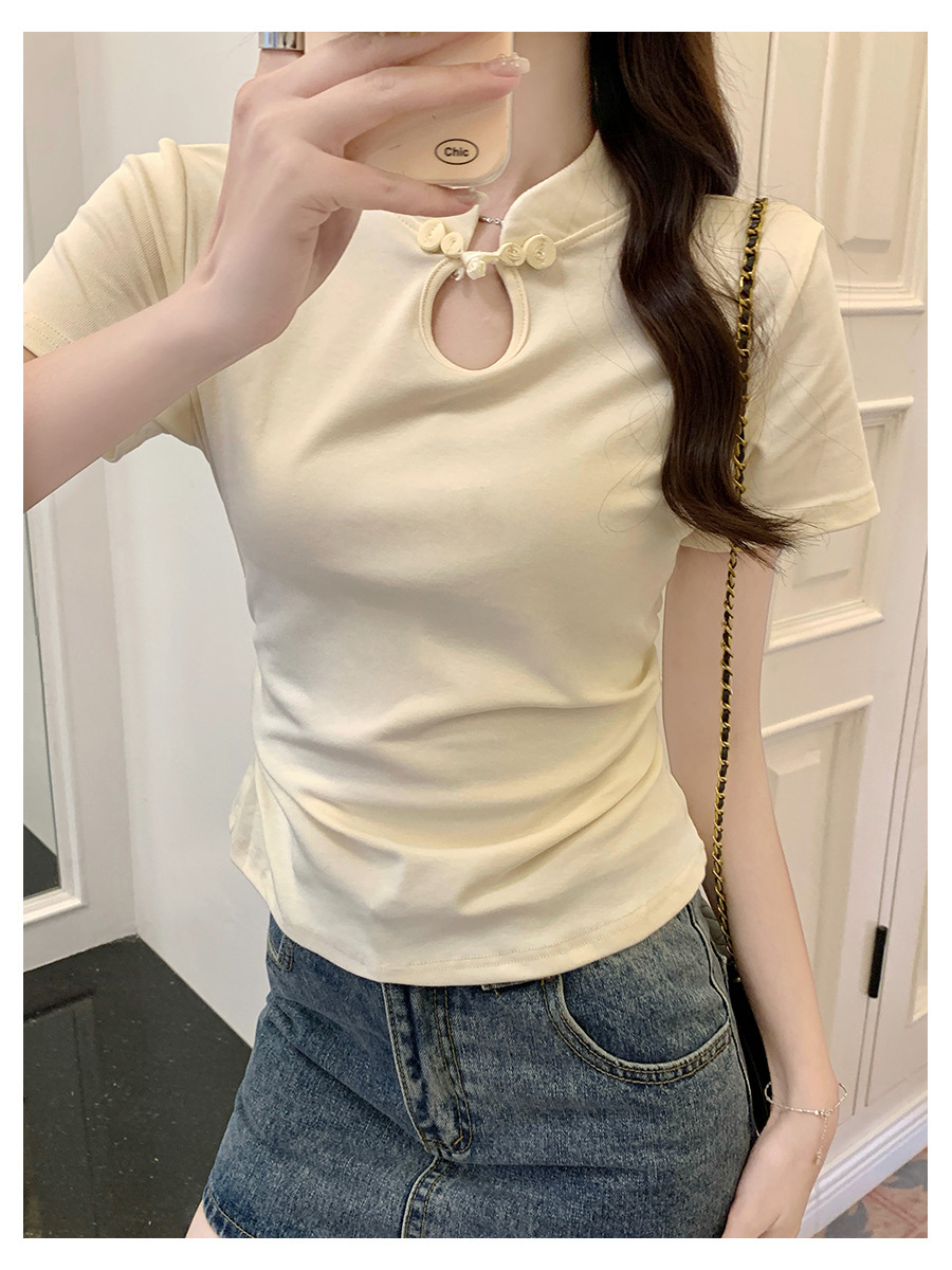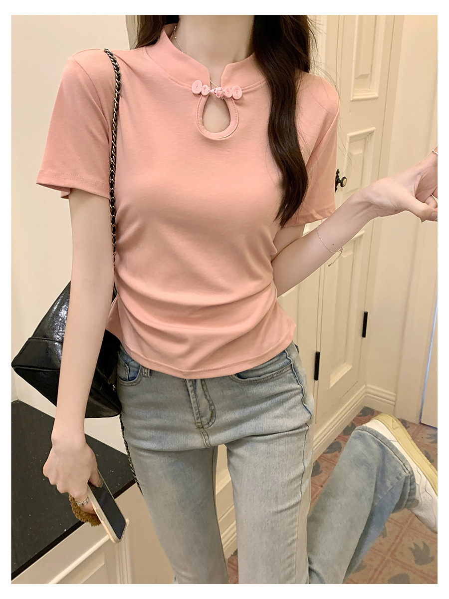 새로운 중국 스타일 할로우 버튼 짧은 소매 탑 여름 새로운 유행 인기 간단한 올 매치 캐주얼 솔리드 컬러 티셔츠