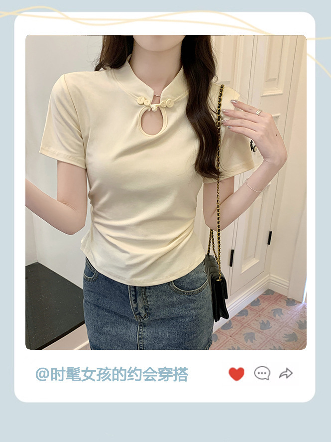 새로운 중국 스타일 할로우 버튼 짧은 소매 탑 여름 새로운 유행 인기 간단한 올 매치 캐주얼 솔리드 컬러 티셔츠스토어 가기