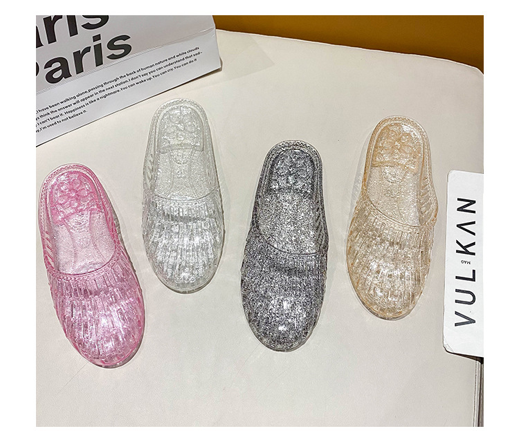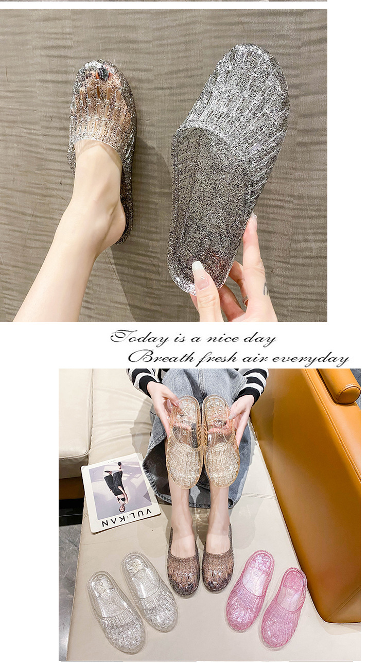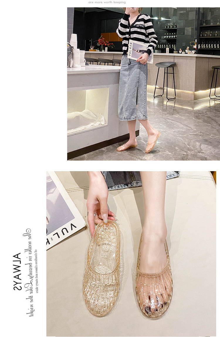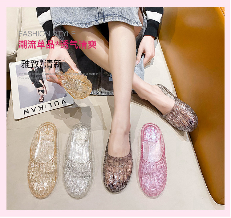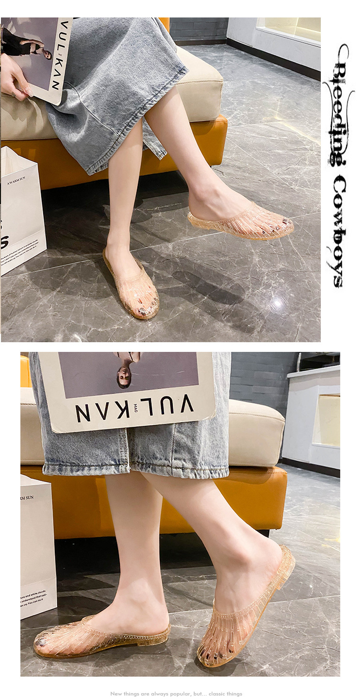 여름 새로운 투명 플랫 바닥 바오터우 샌들 및 슬리퍼 외부 착용 미끄럼 방지 할로우 홀 신발 여성용 학생 크리스탈 하프 슬리퍼