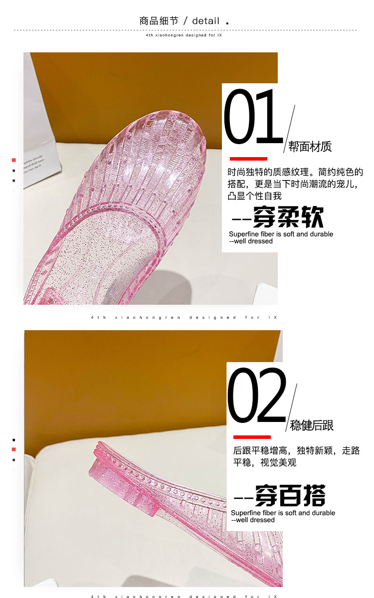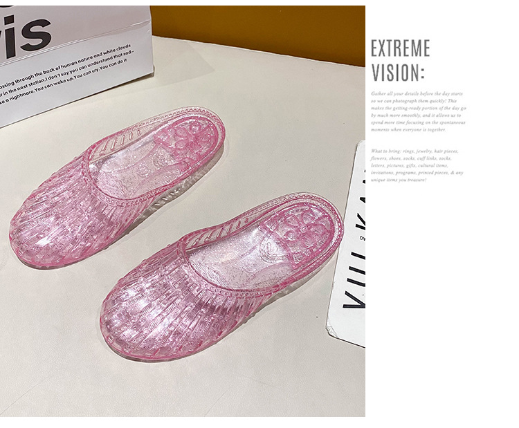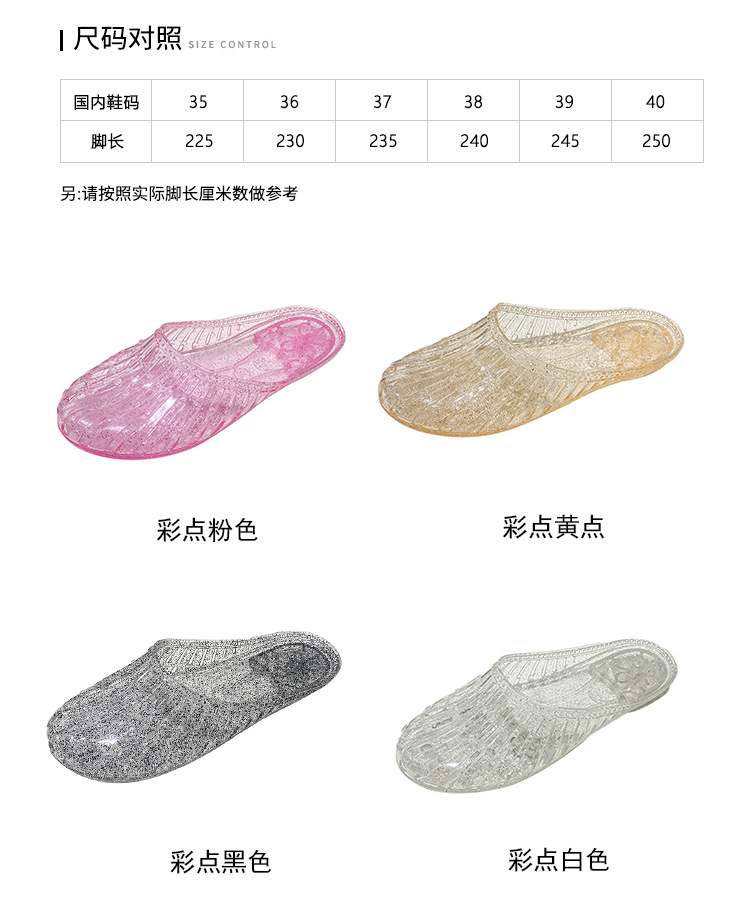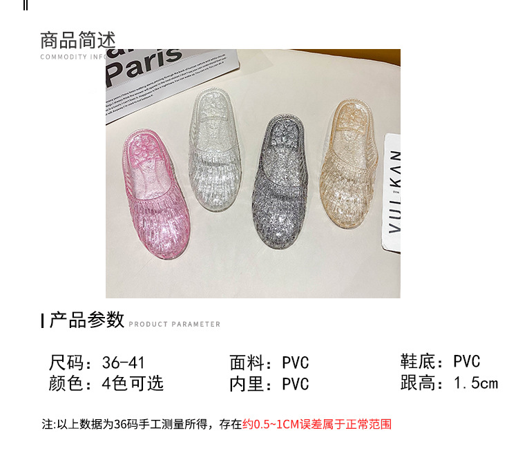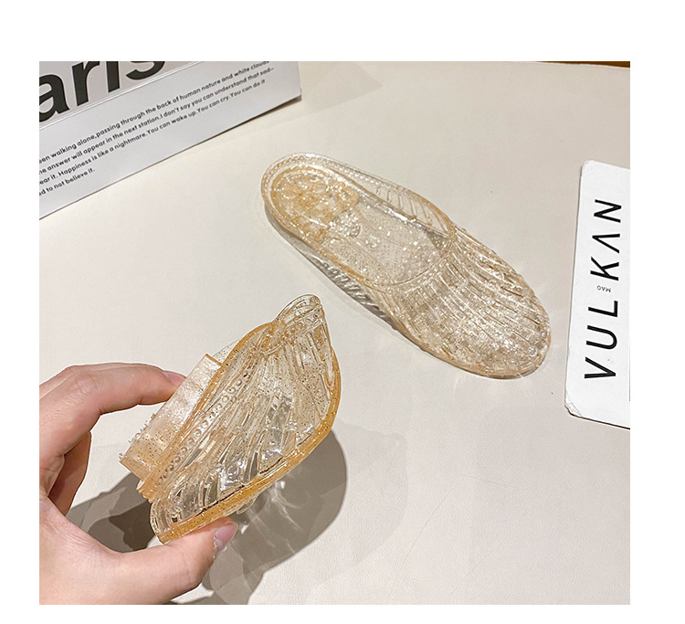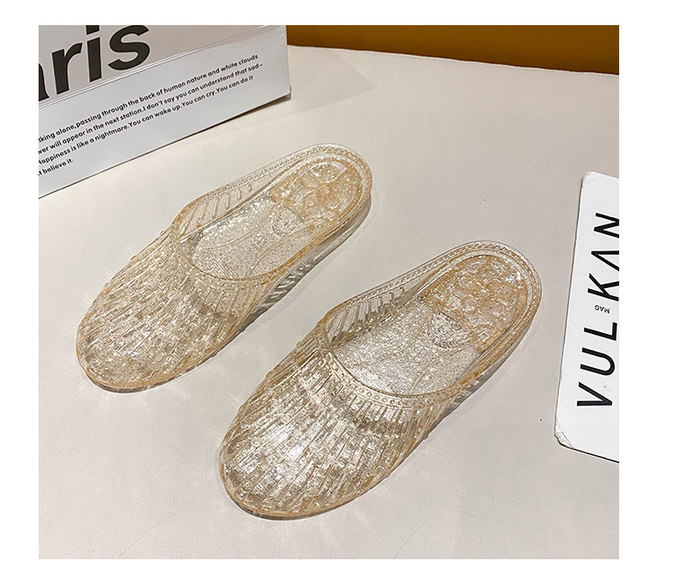여름 새로운 투명 플랫 바닥 바오터우 샌들 및 슬리퍼 외부 착용 미끄럼 방지 할로우 홀 신발 여성용 학생 크리스탈 하프 슬리퍼