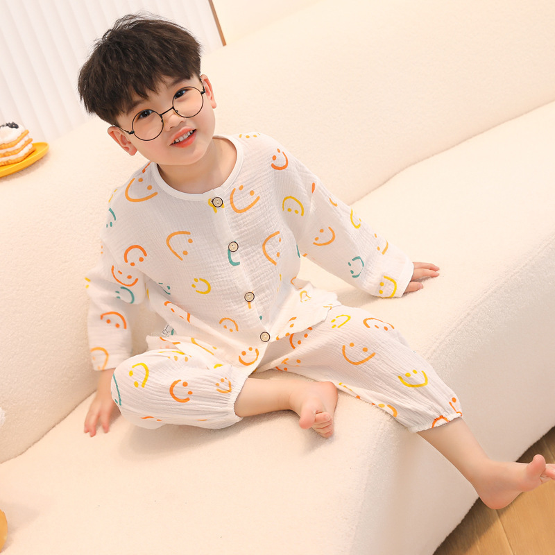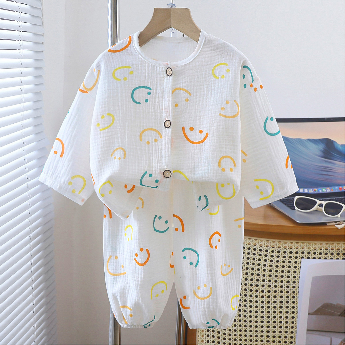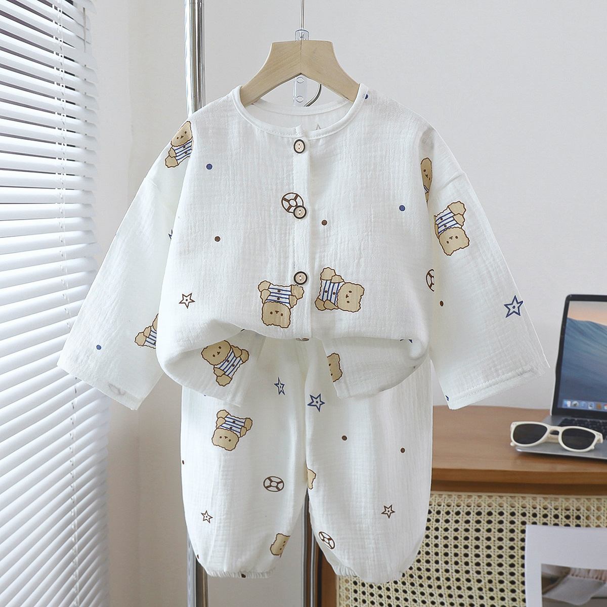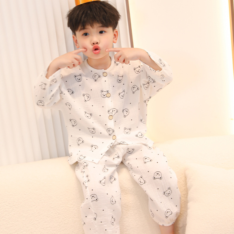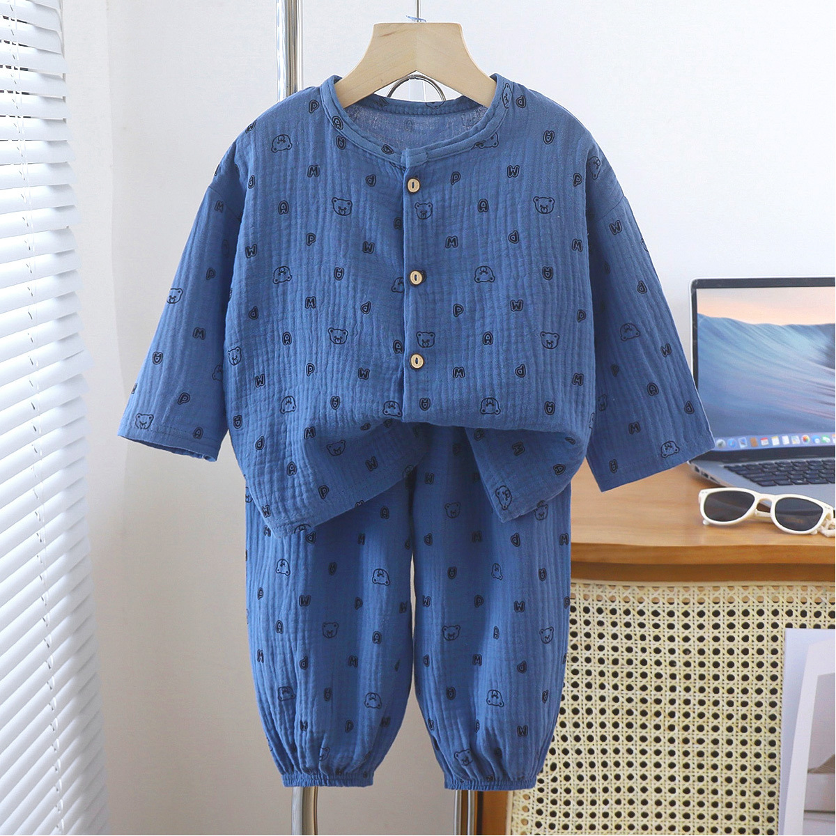 어린이 더블 레이어 코튼 거즈 긴팔 잠옷 여름 새로운 캐주얼 코튼 거즈 정장 소년과 소녀 도매스토어 가기
