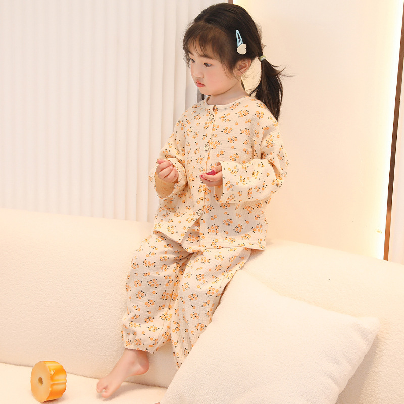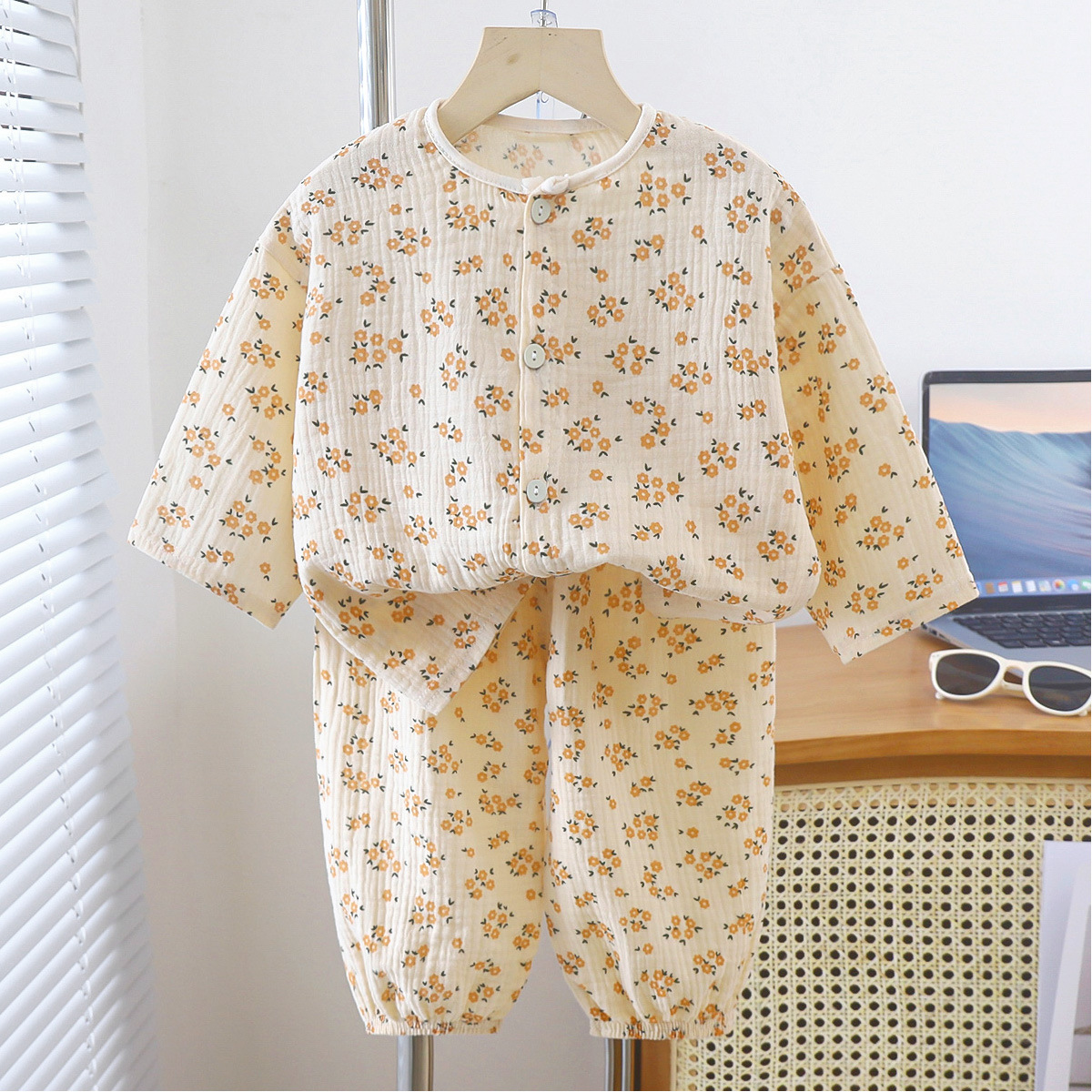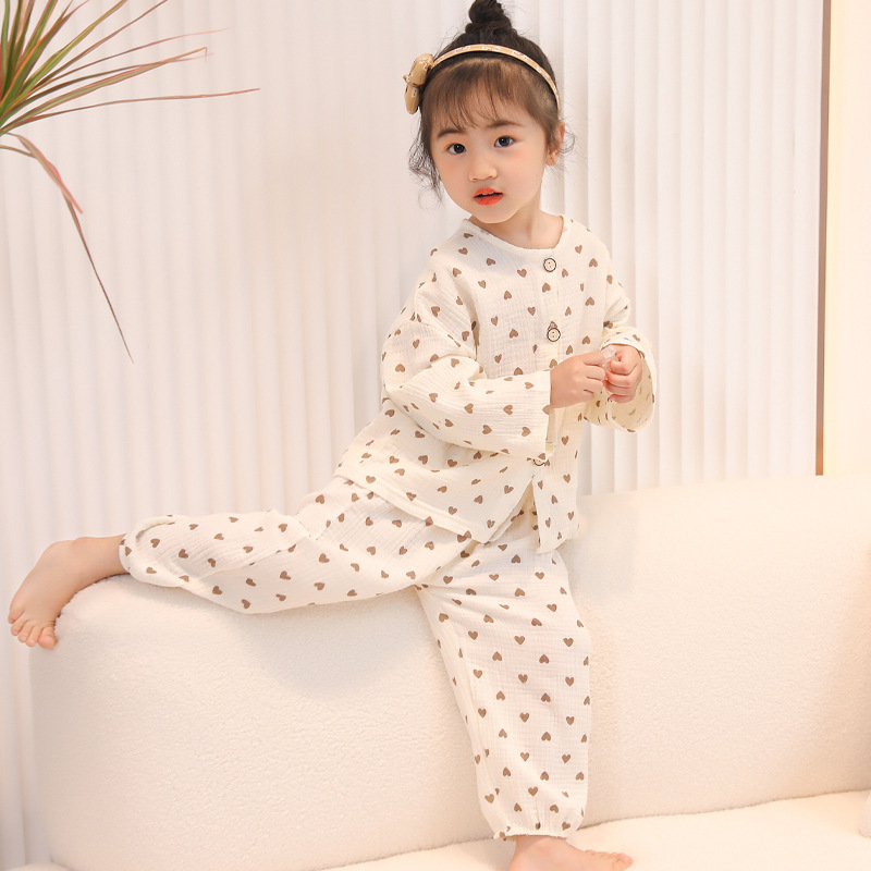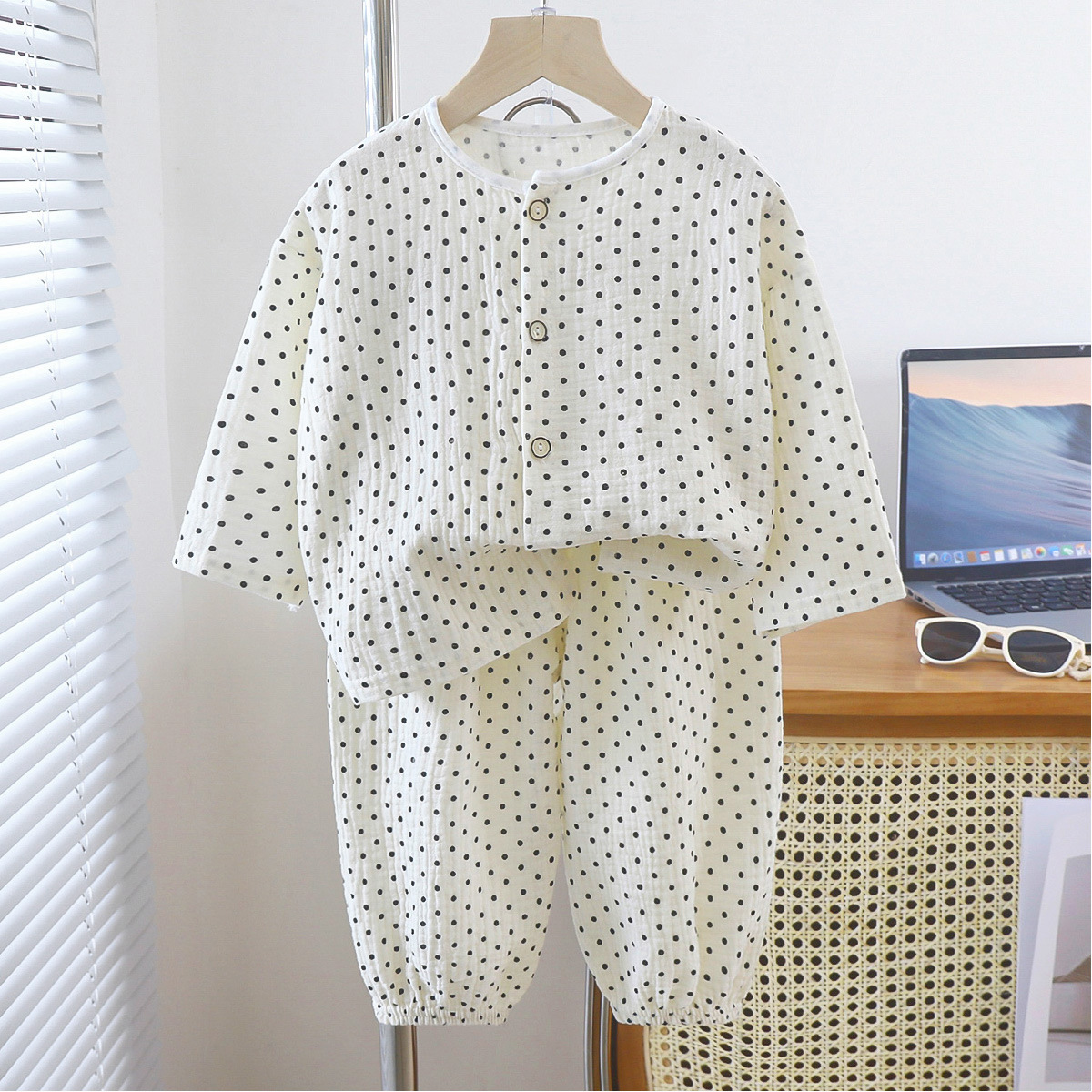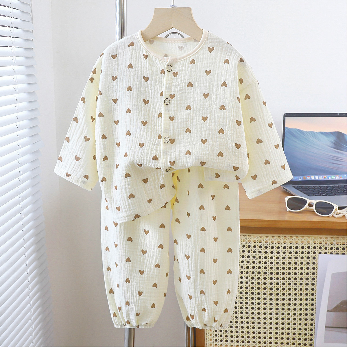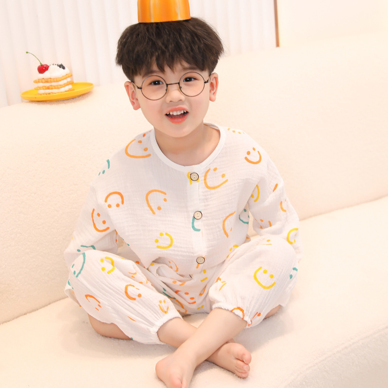 어린이 더블 레이어 코튼 거즈 긴팔 잠옷 여름 새로운 캐주얼 코튼 거즈 정장 소년과 소녀 도매스토어 가기