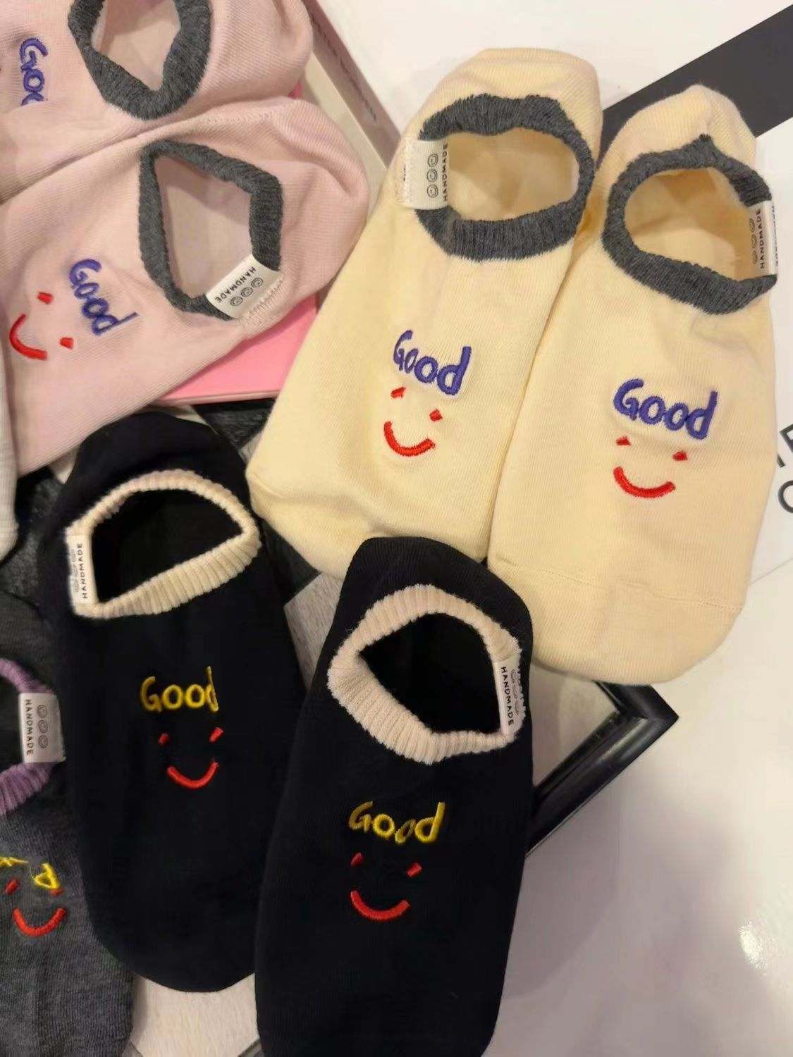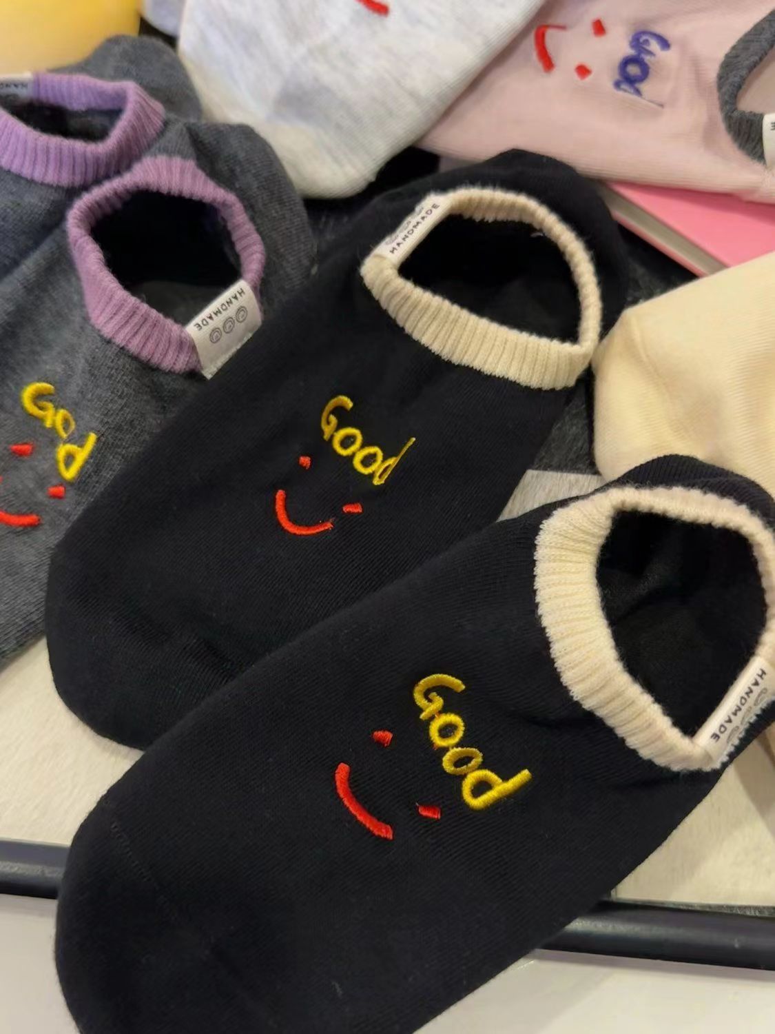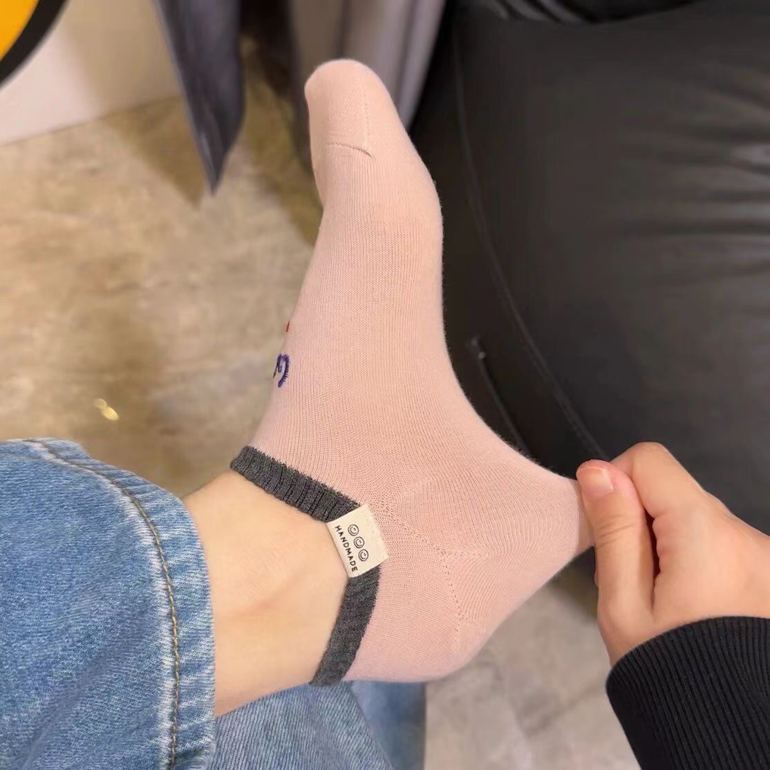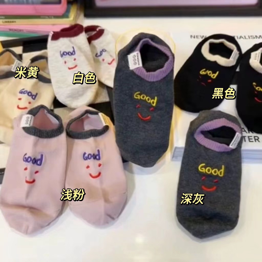 2024 년 봄과 여름 쇼트 양말 여성의 새로운 올 매치 양말 여성 자수 스마일리 편지는 귀여운 보이지 않는 달콤한 보트 양말을 벗어나지 않습니다.스토어 가기