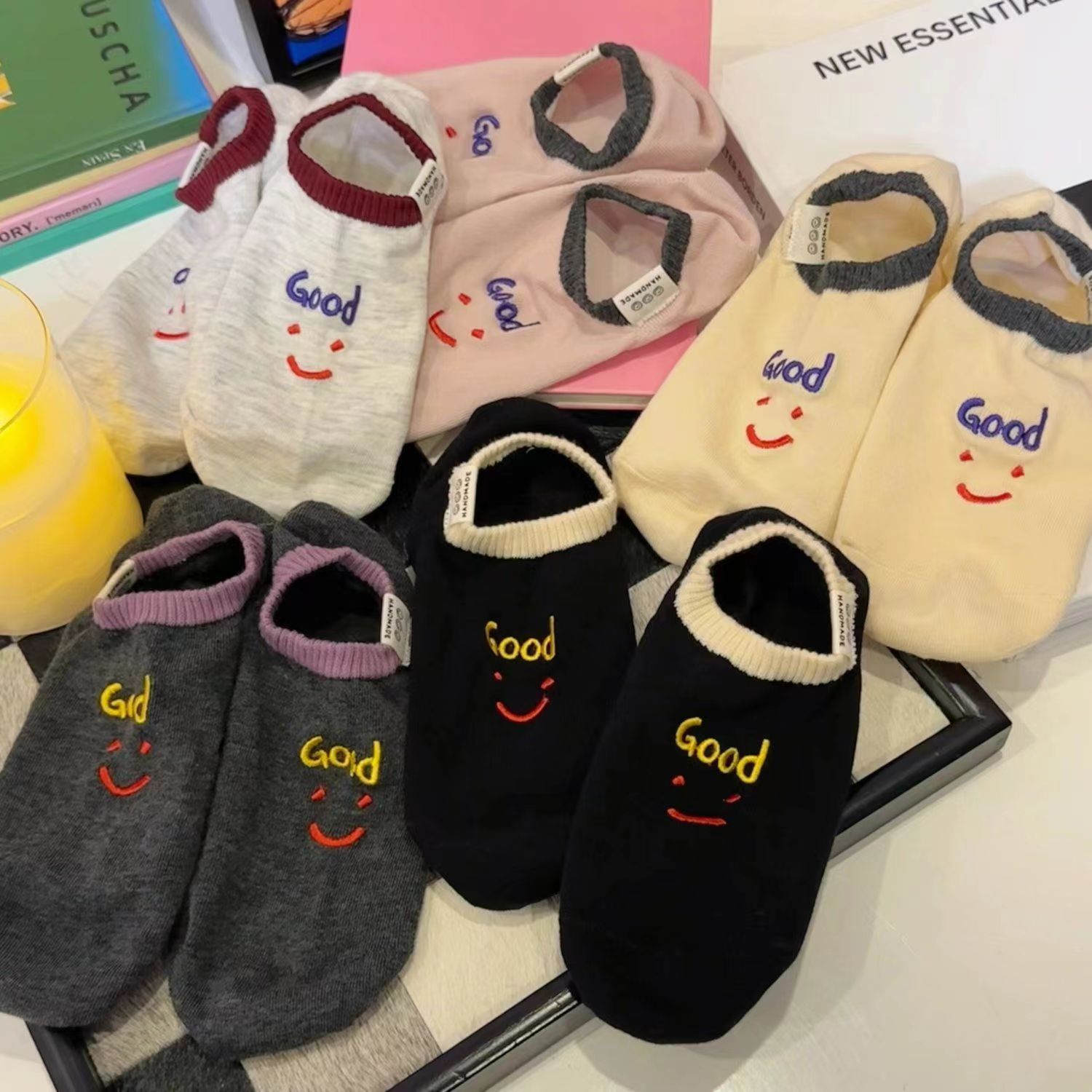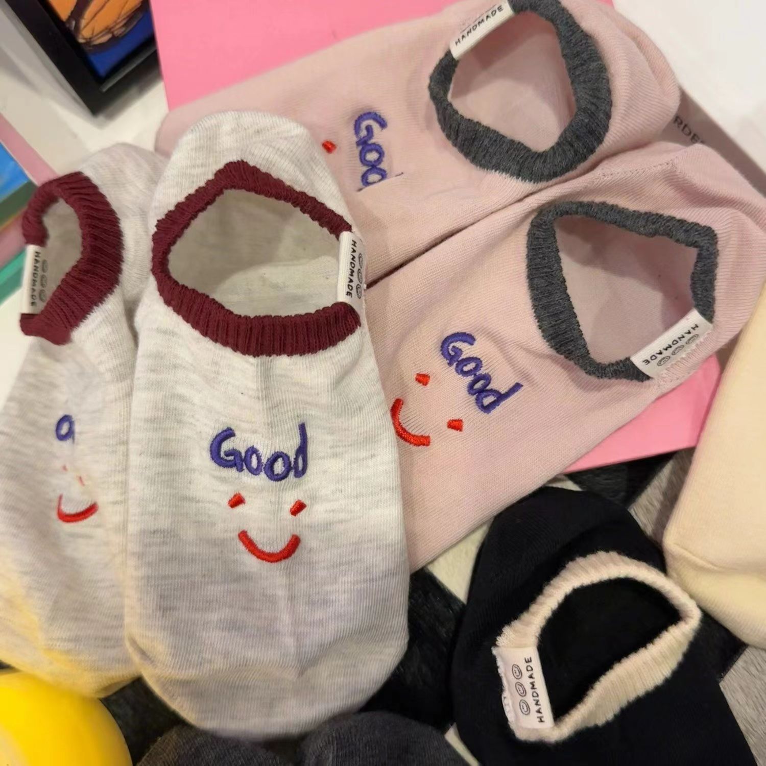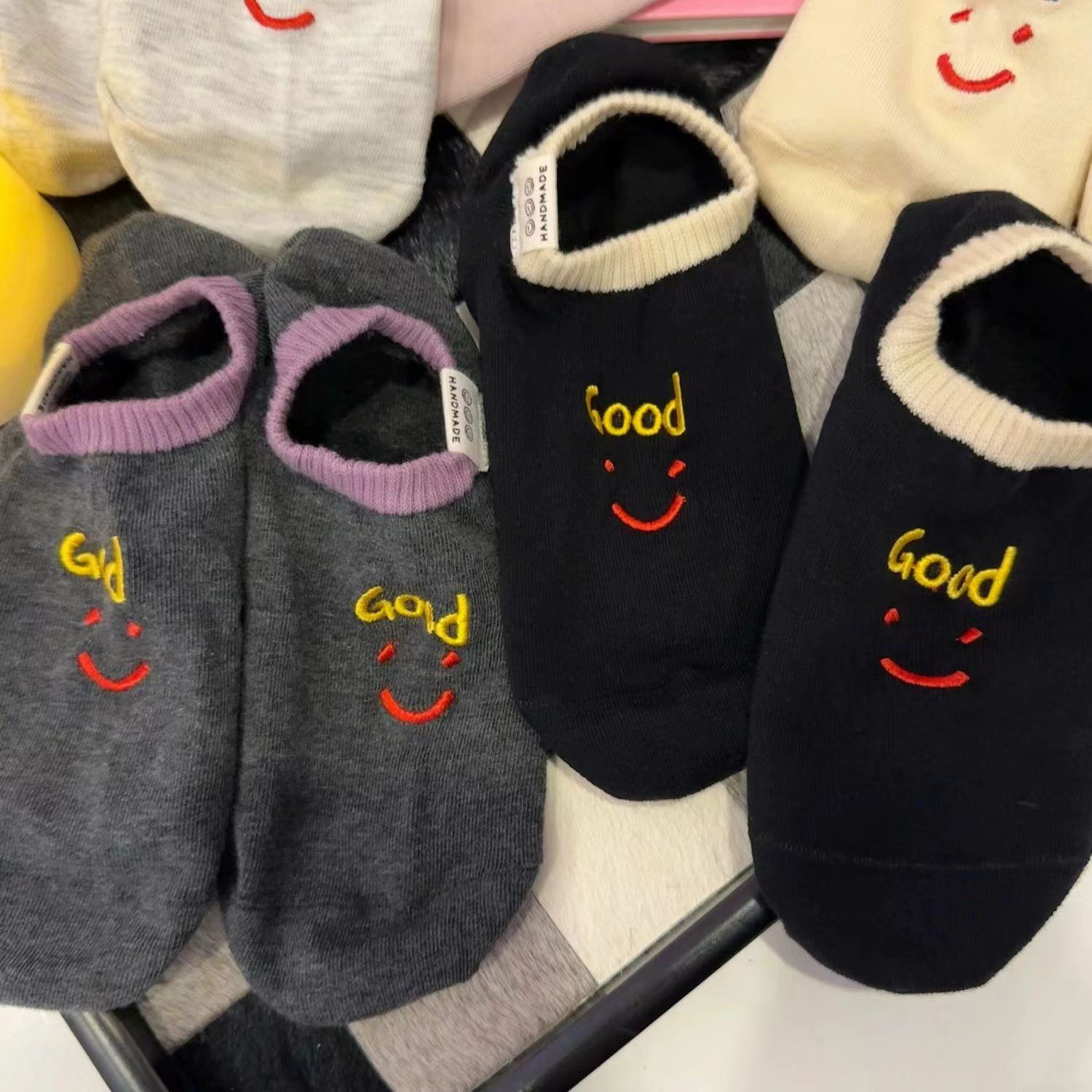 2024 년 봄과 여름 쇼트 양말 여성의 새로운 올 매치 양말 여성 자수 스마일리 편지는 귀여운 보이지 않는 달콤한 보트 양말을 벗어나지 않습니다.스토어 가기