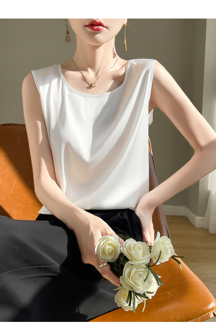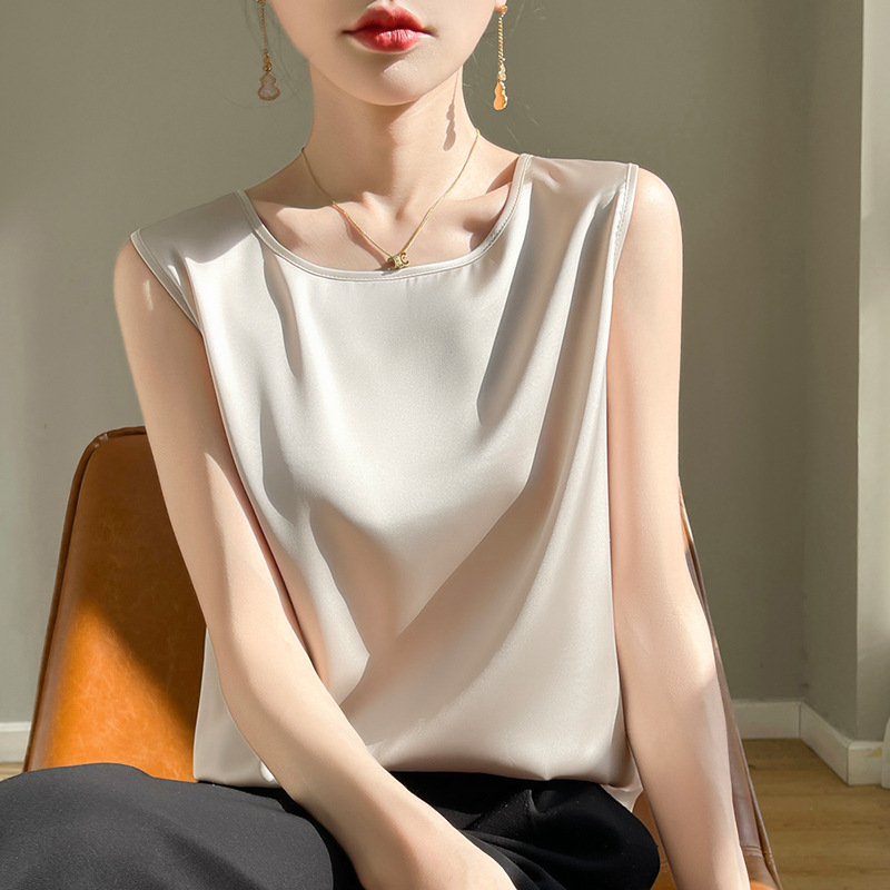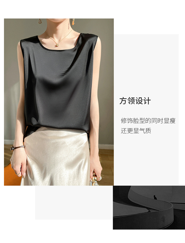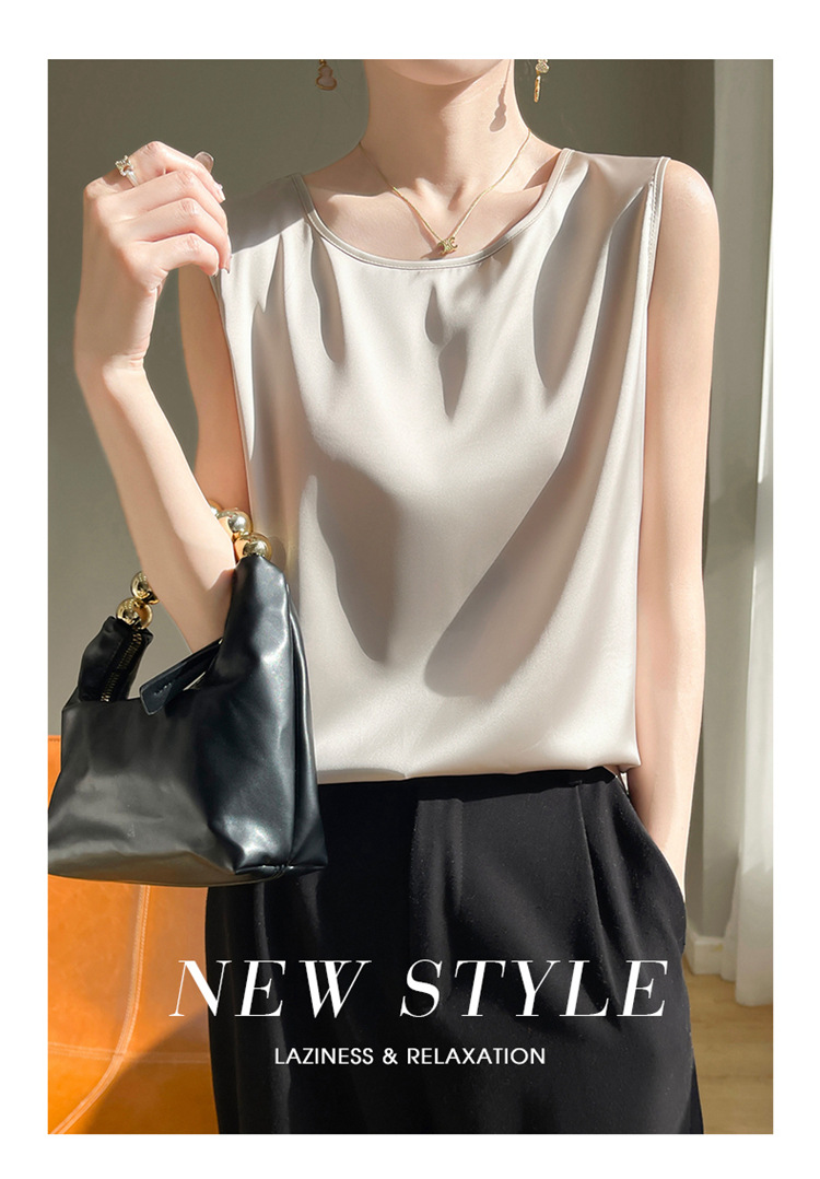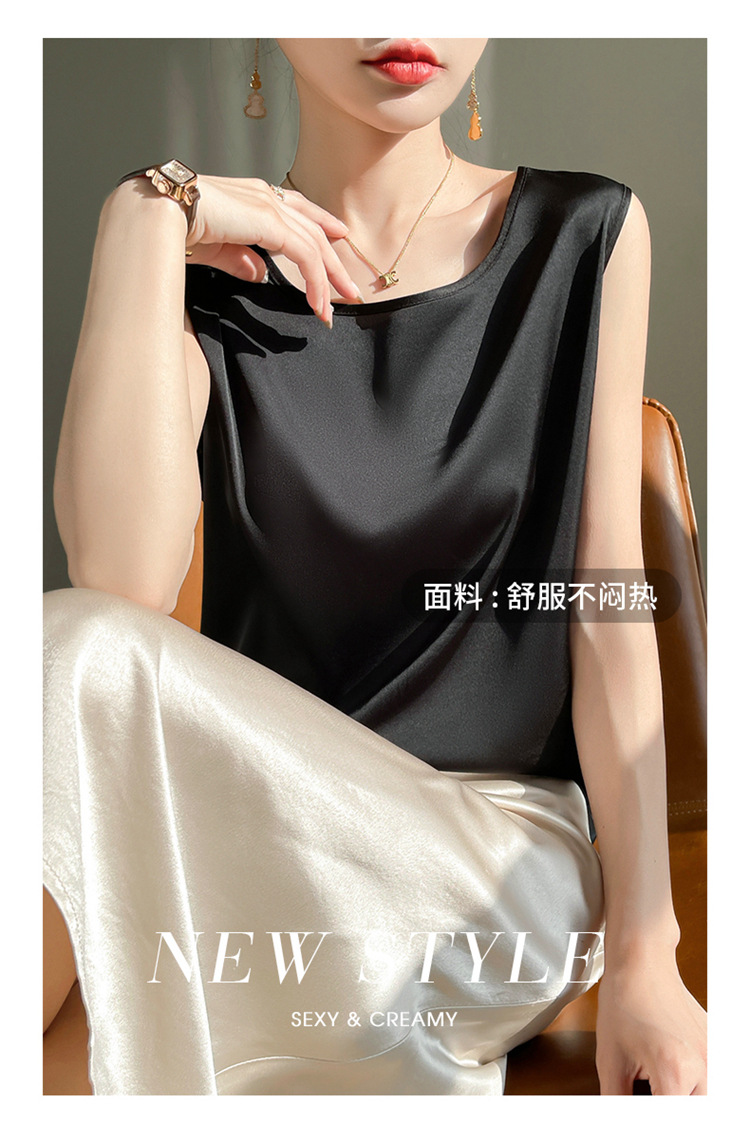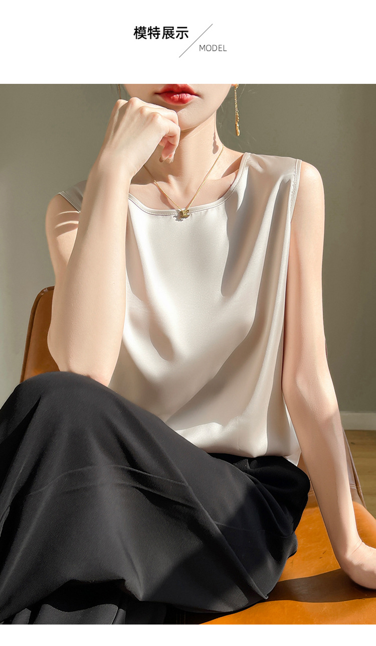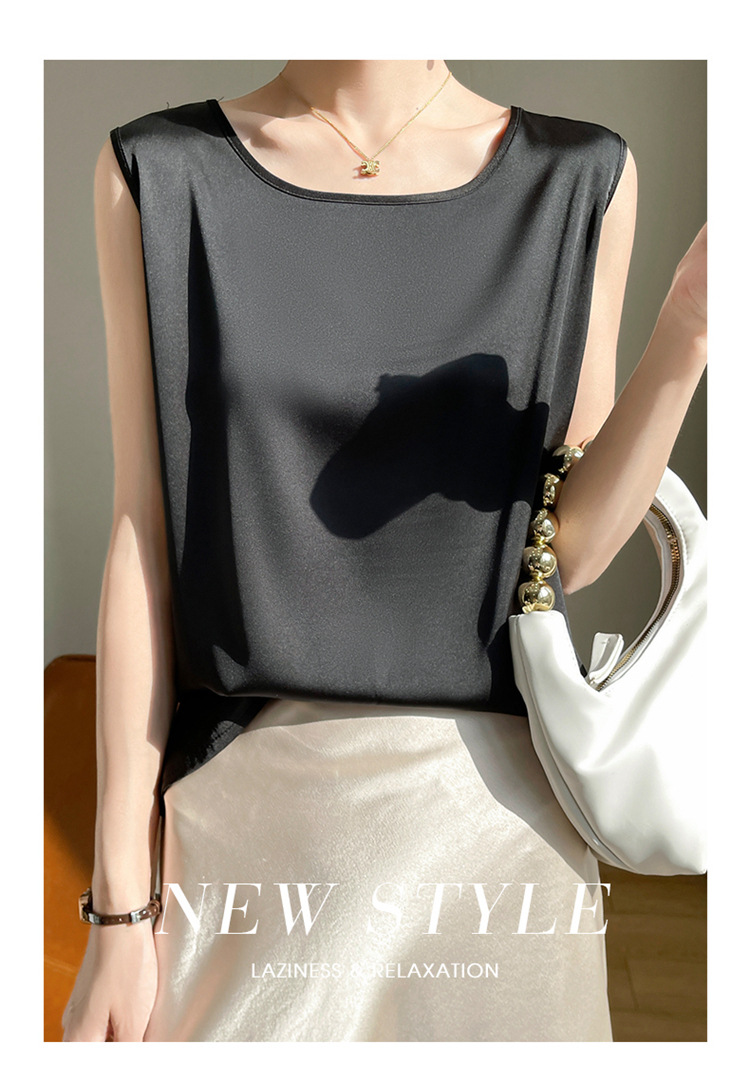 2024 여름 느슨한 단색 심플 올 매치 아세트산 사틴 부드러운 통기성 U 칼라 민소매 조끼스토어 가기