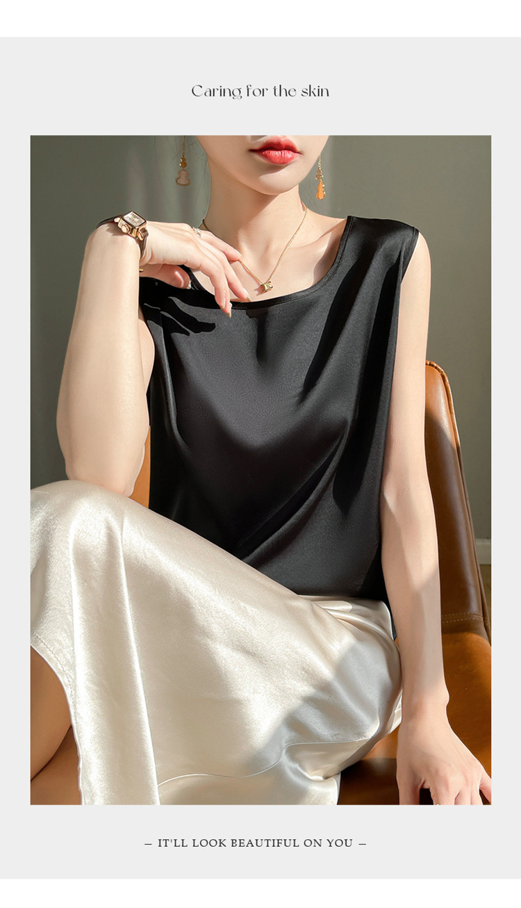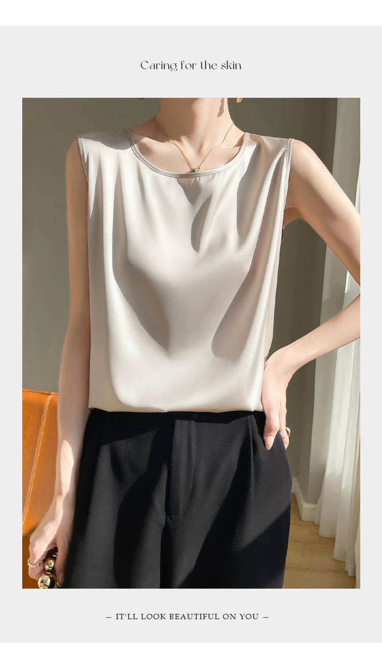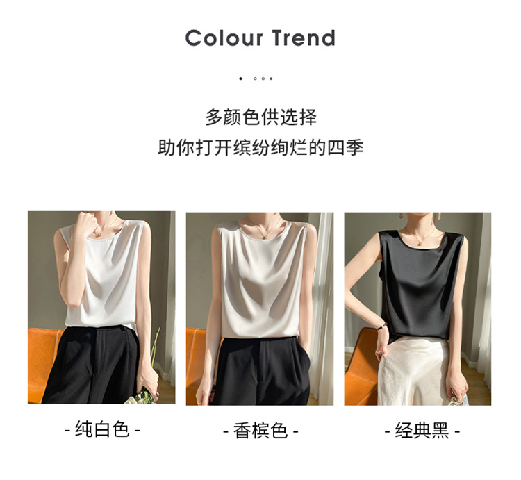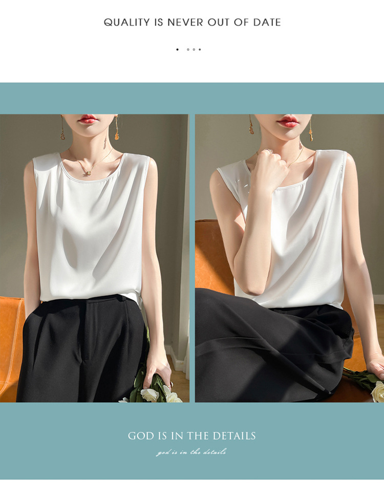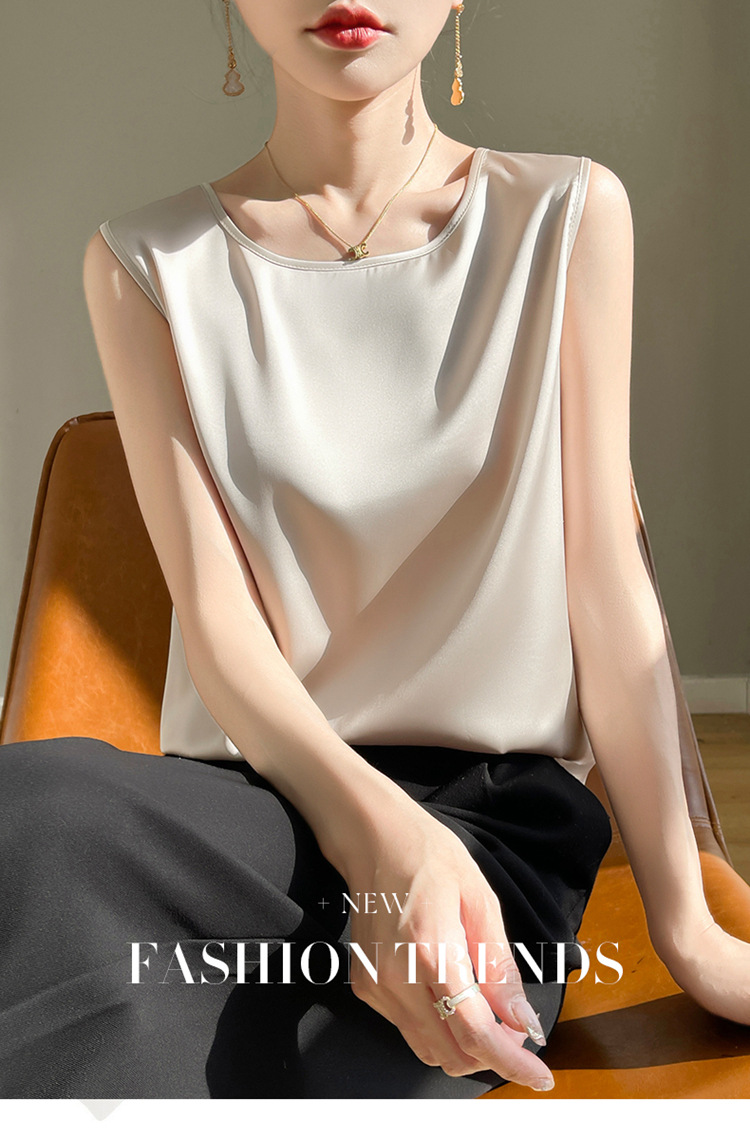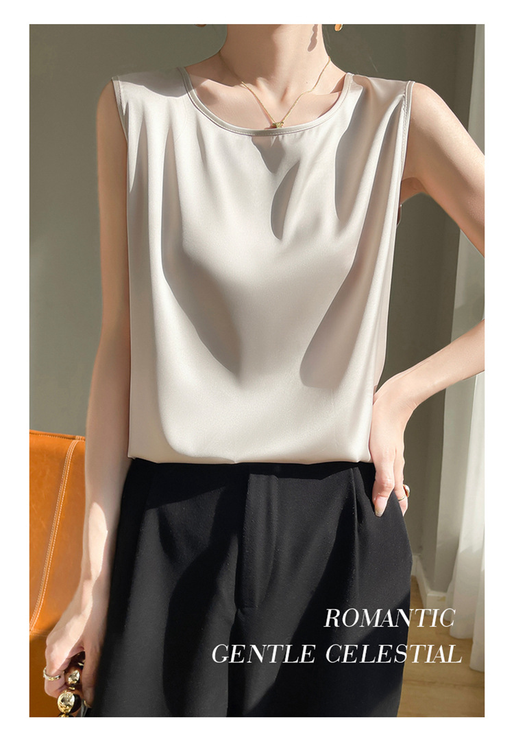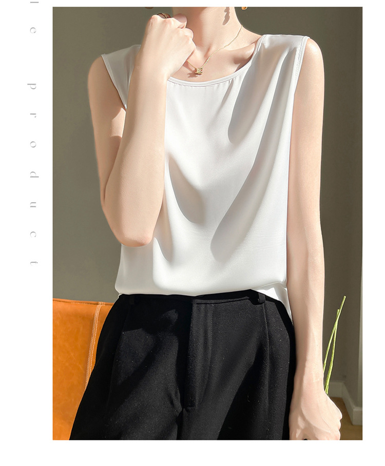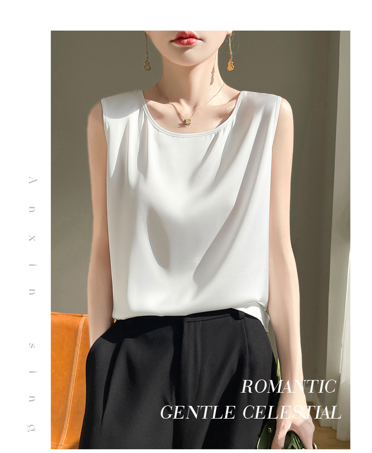2024 여름 느슨한 단색 심플 올 매치 아세트산 사틴 부드러운 통기성 U 칼라 민소매 조끼스토어 가기