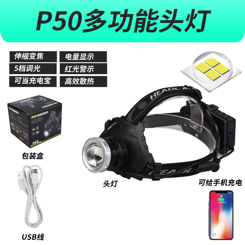 外贸新品P50 P70强光头灯伸缩调焦 USB输入输出户外照明露营