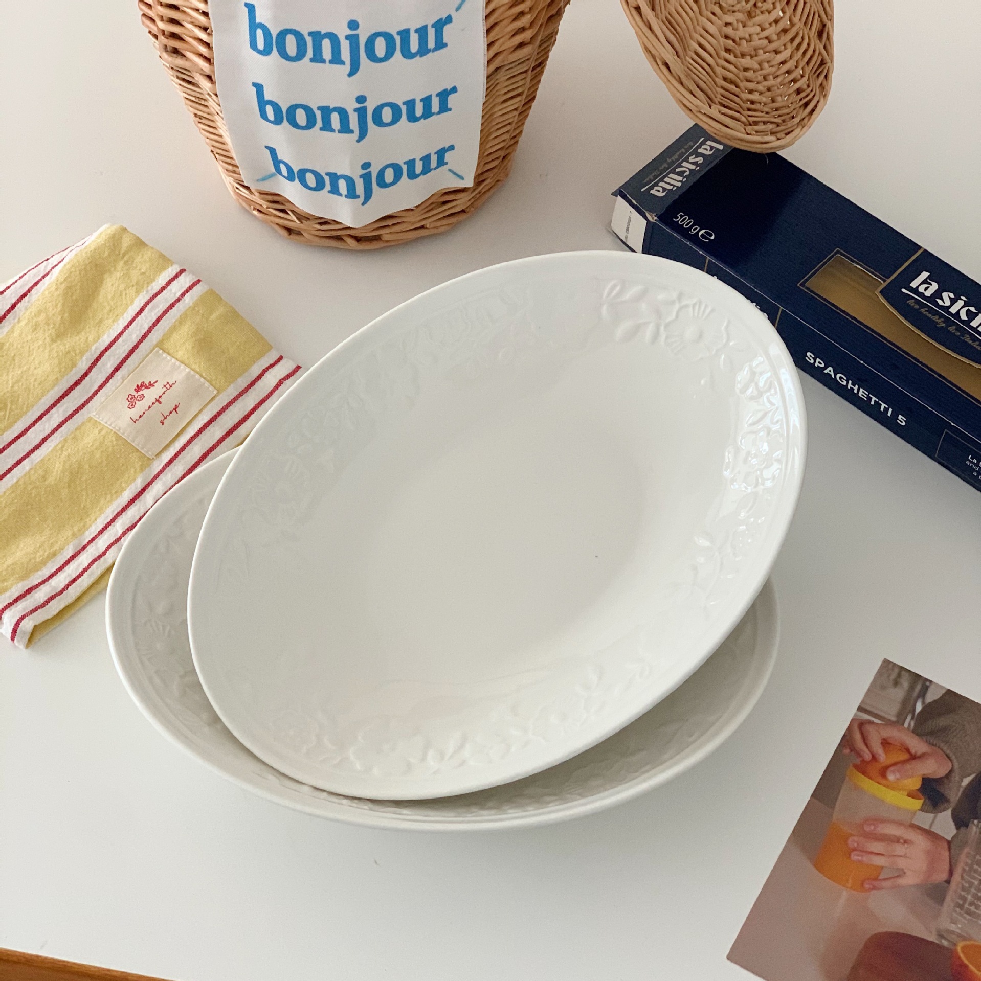 레트로 양각 타원형 인스 스타일 순백색 세라믹 접시 생선 접시 가정용 접시 아침식사 접시 케이크 접시스토어 가기