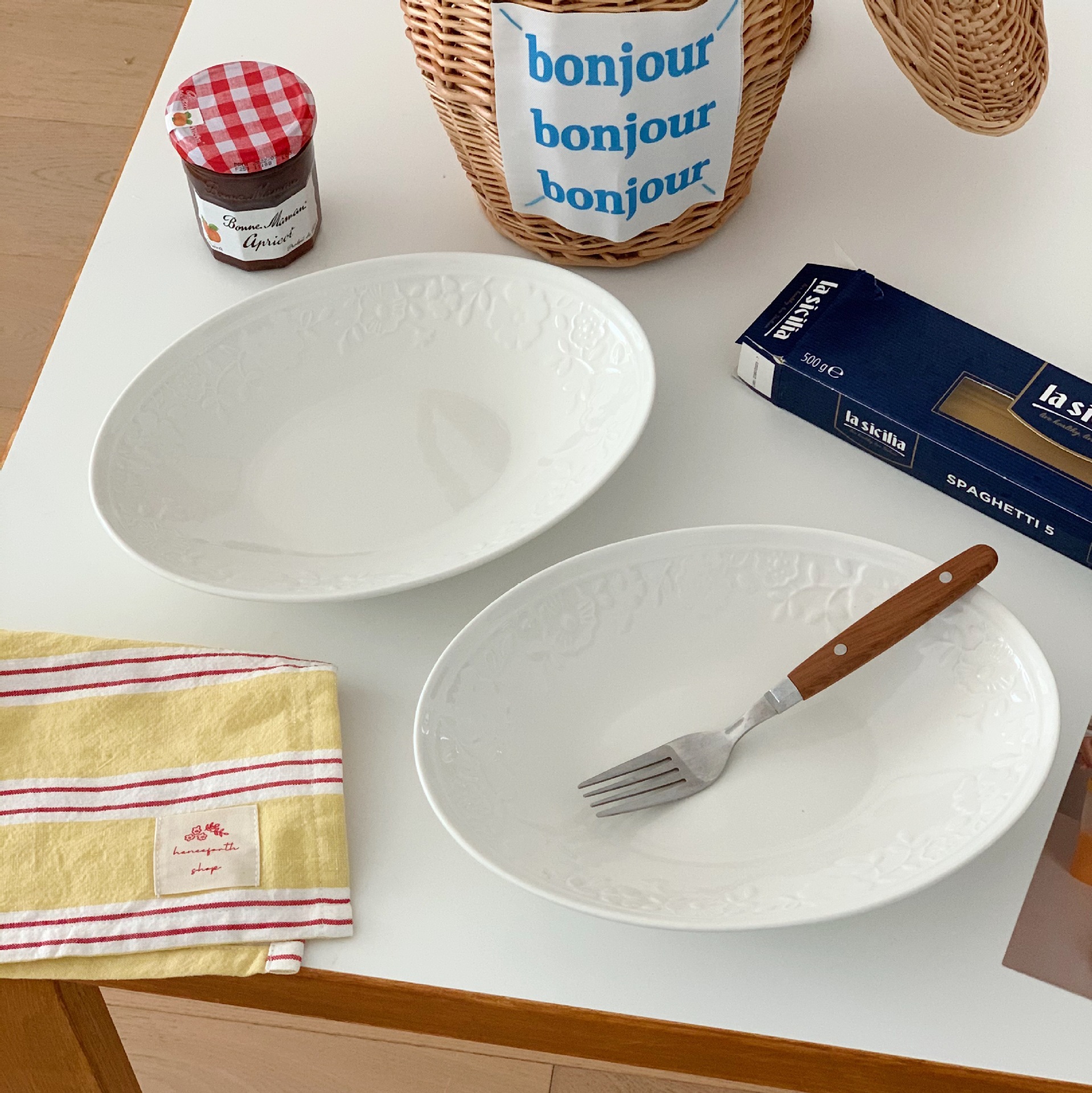 레트로 양각 타원형 인스 스타일 순백색 세라믹 접시 생선 접시 가정용 접시 아침식사 접시 케이크 접시