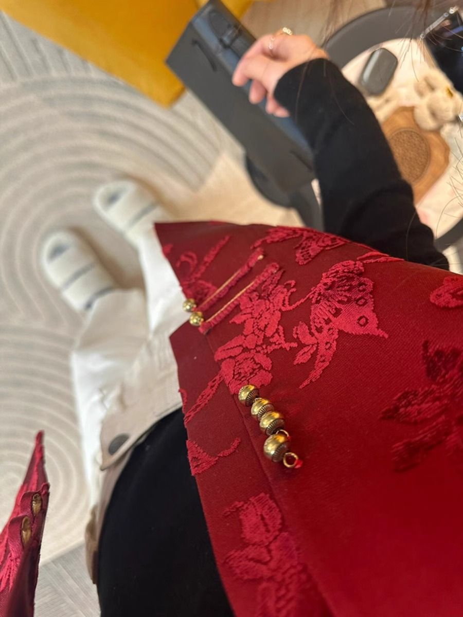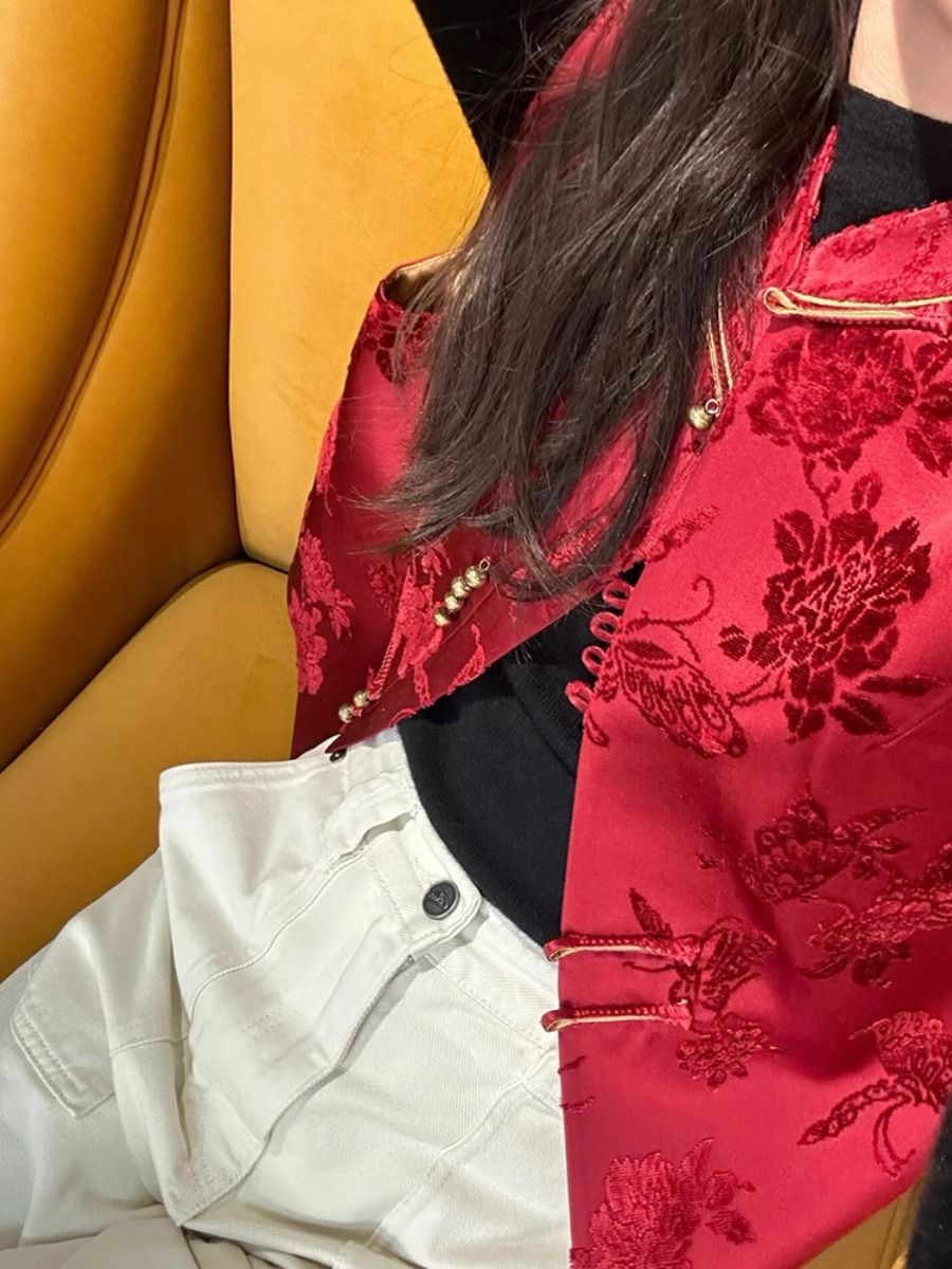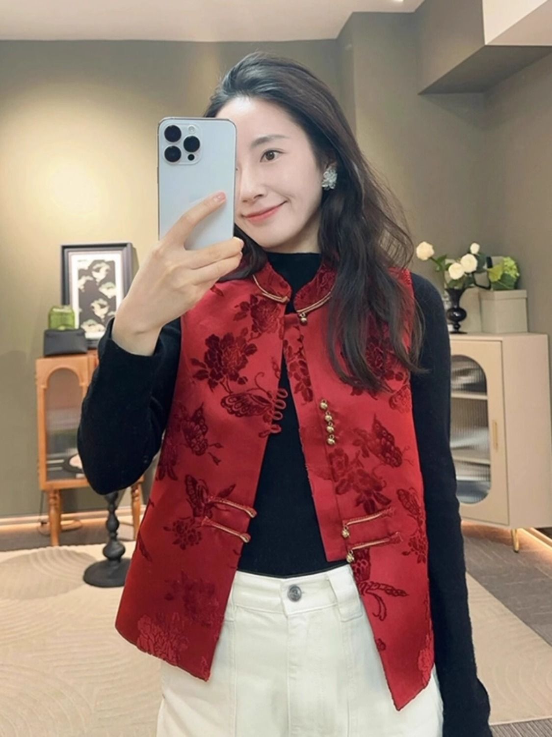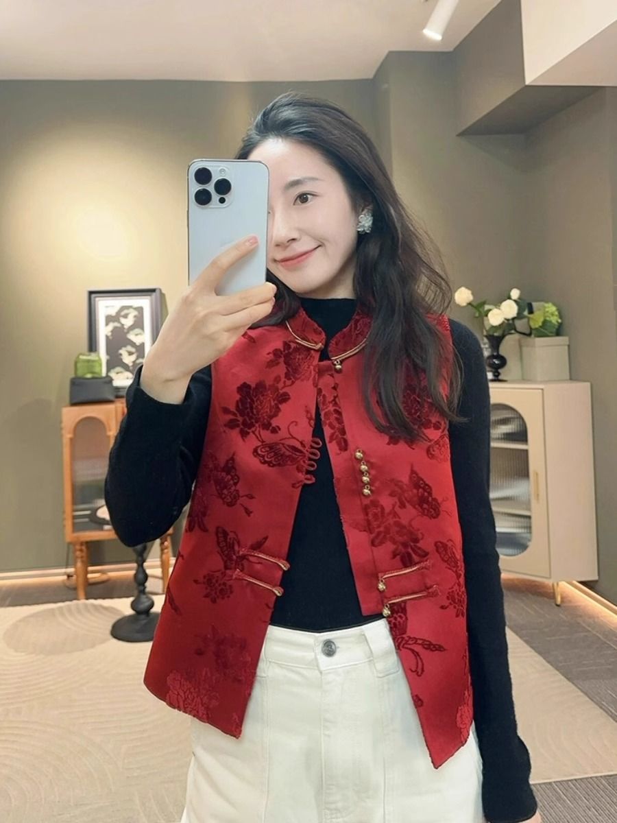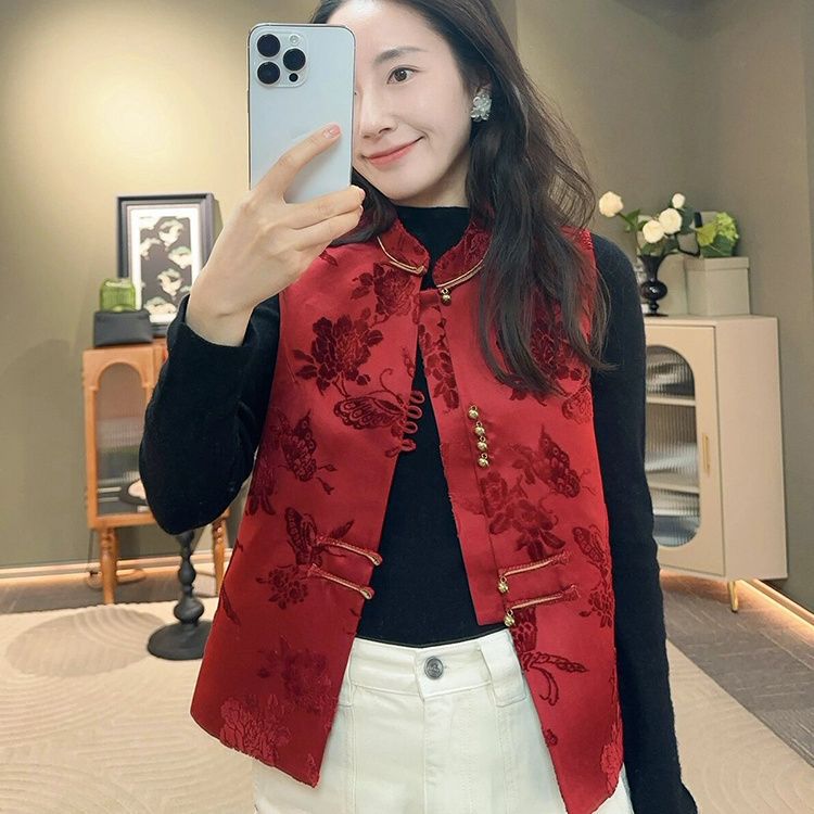 중국 여성 의류 레트로 레드 웨어 조끼 2024 코트 뉴 탕 세트 하이 엔드 앤티크 버클 플시 커버 탑스토어 가기