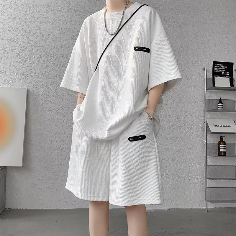아메리칸 스타일 시티 보이 캐주얼 스포츠 세트 남자 하이 엔드 와플 반팔 티셔츠 자카드 5 점 바지 투피스 세트