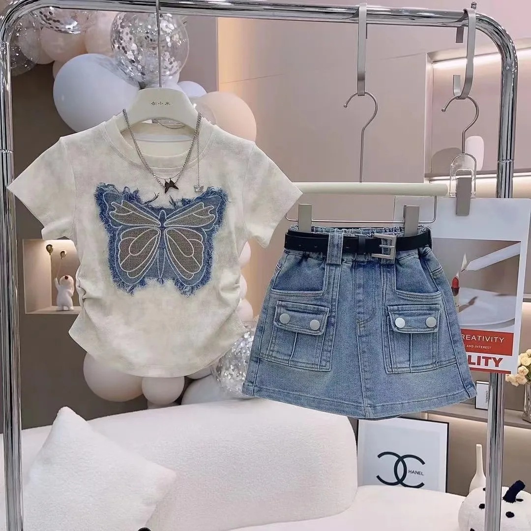 2025 새로운 여자 여름 정장 아기 소녀 새로운 데님 스커트 어린이 스타일 반팔 티셔츠 투피스 세트 유행스토어 가기