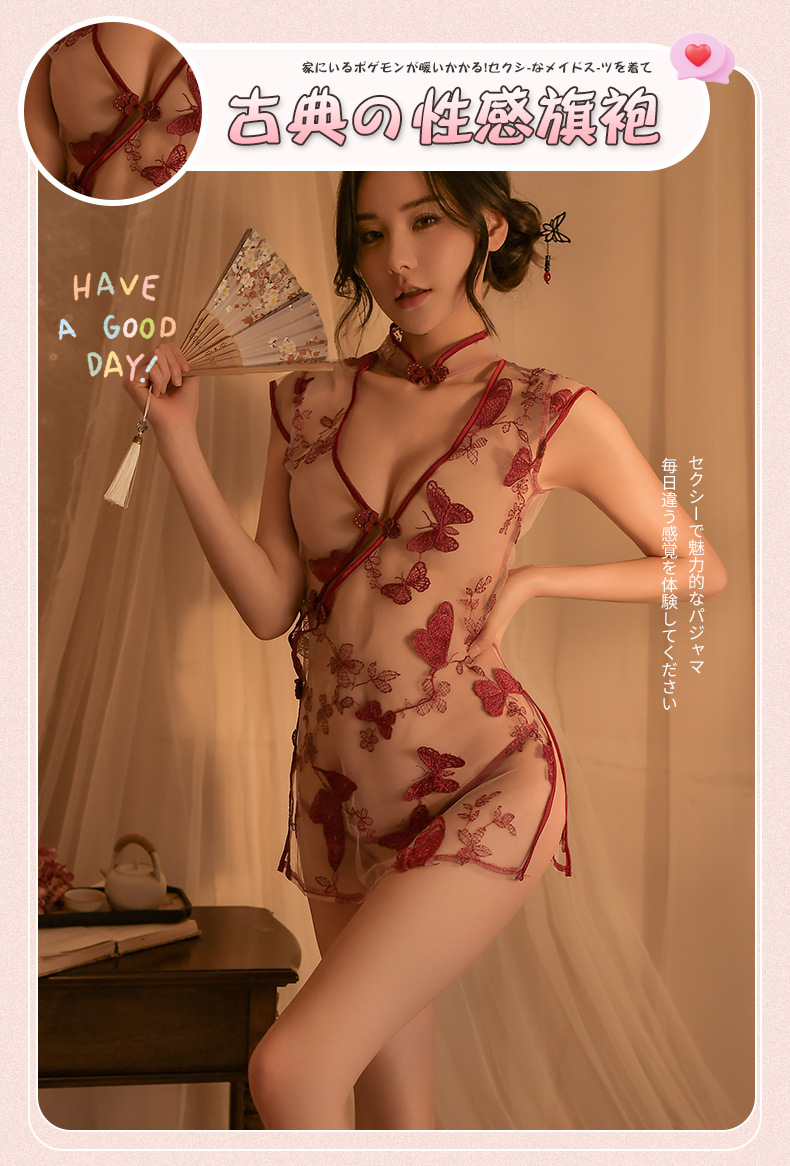 밤 재미 란제리 여름 섹시한 관점 잠옷 유혹 복고풍 중공 나비 수용성 수 놓은 치파오 유니폼스토어 가기