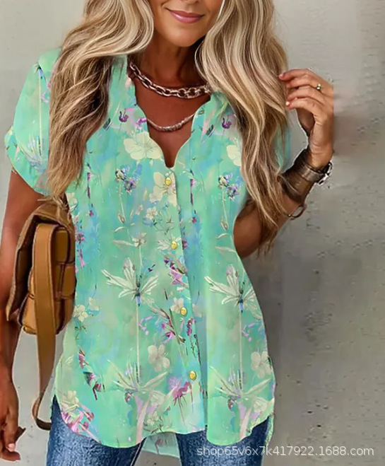 2024 새로운 국경 간 대외 무역 유럽과 미국 여성 의류 명소 아마존 V 넥 봄과 여름 짧은 소매 단색 느슨한 탑 T 혈액