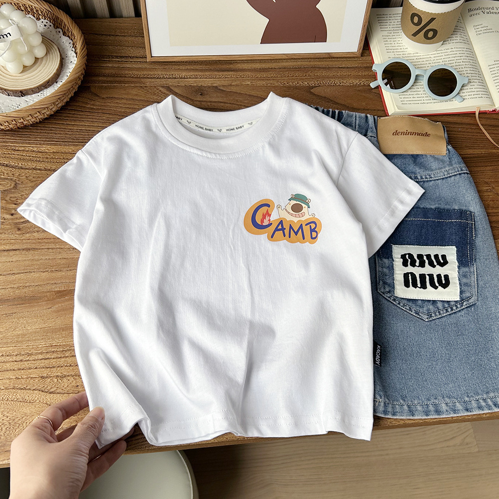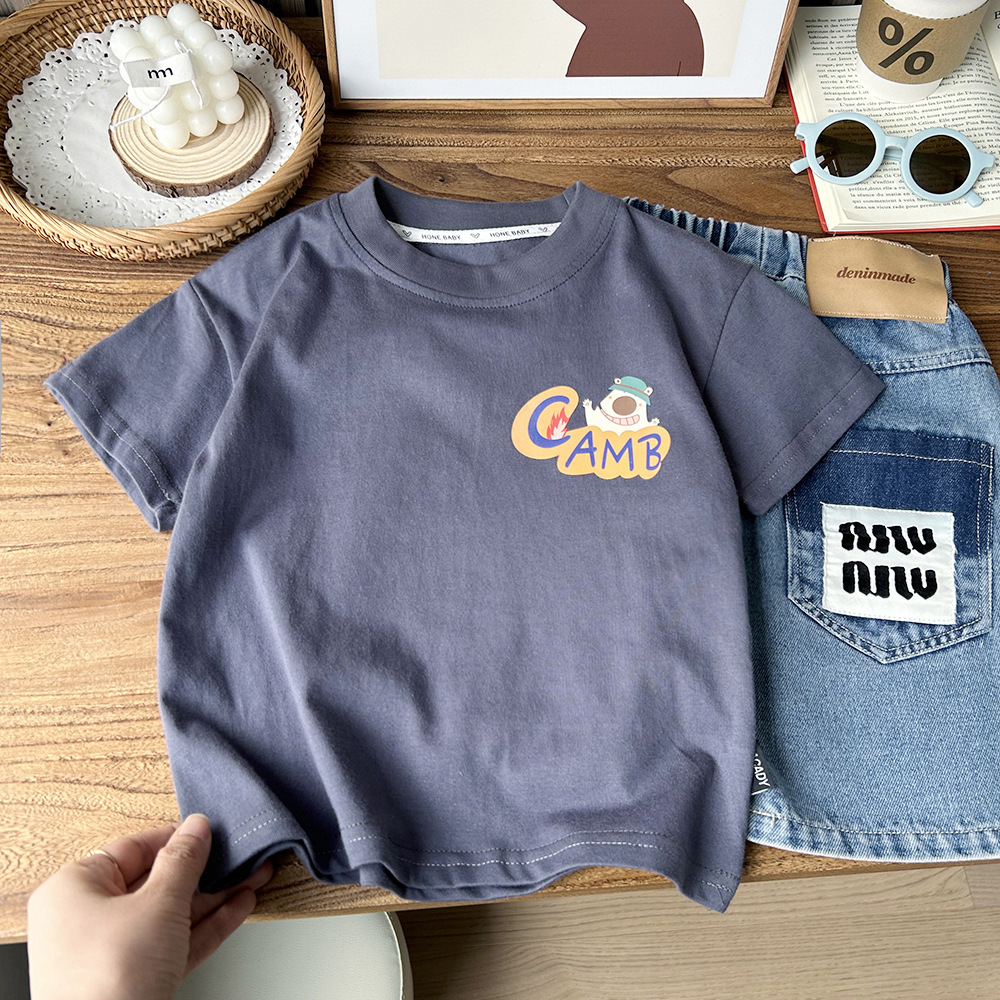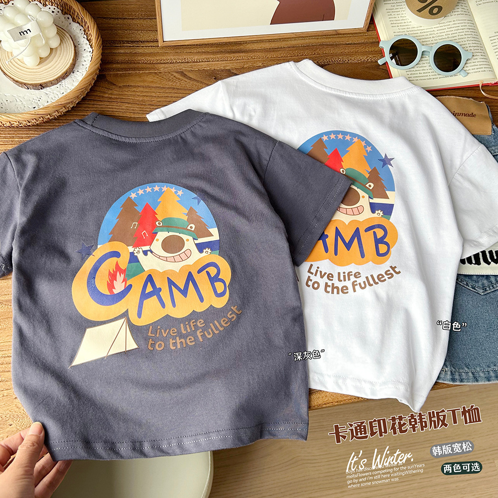 2024 여름 한국 아동복 큰 소년 만화 둥근 목 반팔 티셔츠 아이들의 얇은 느슨한베이스 셔츠스토어 가기