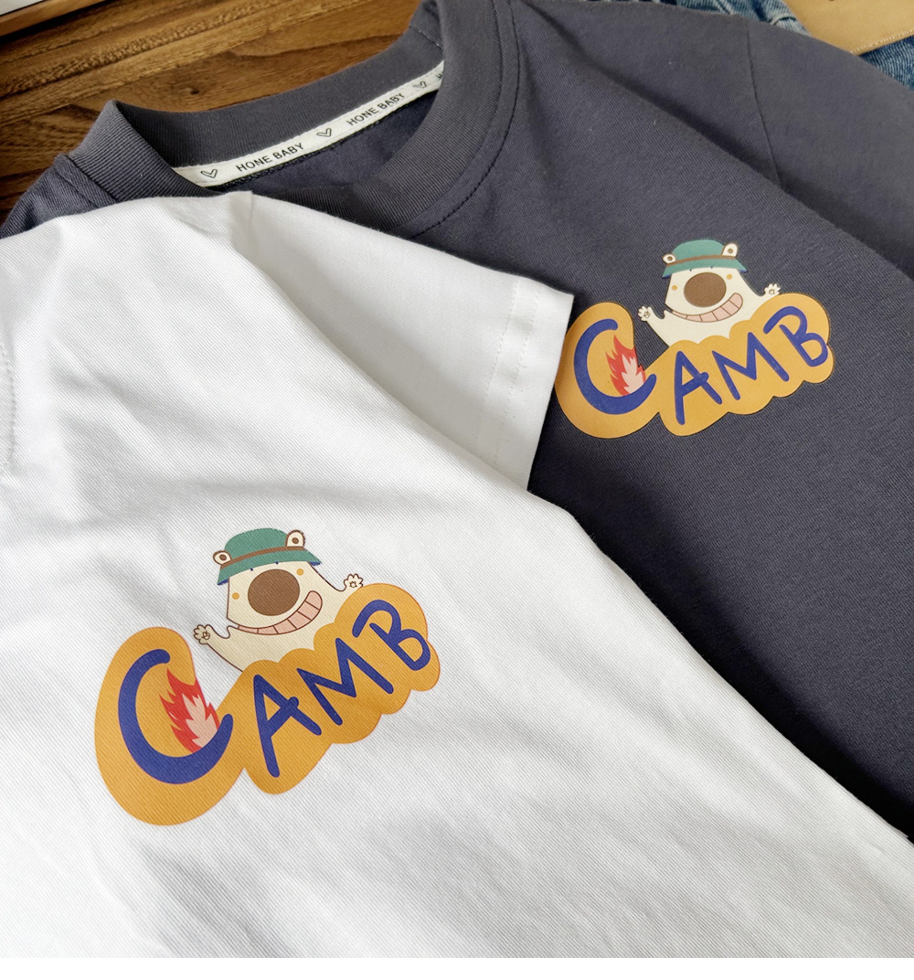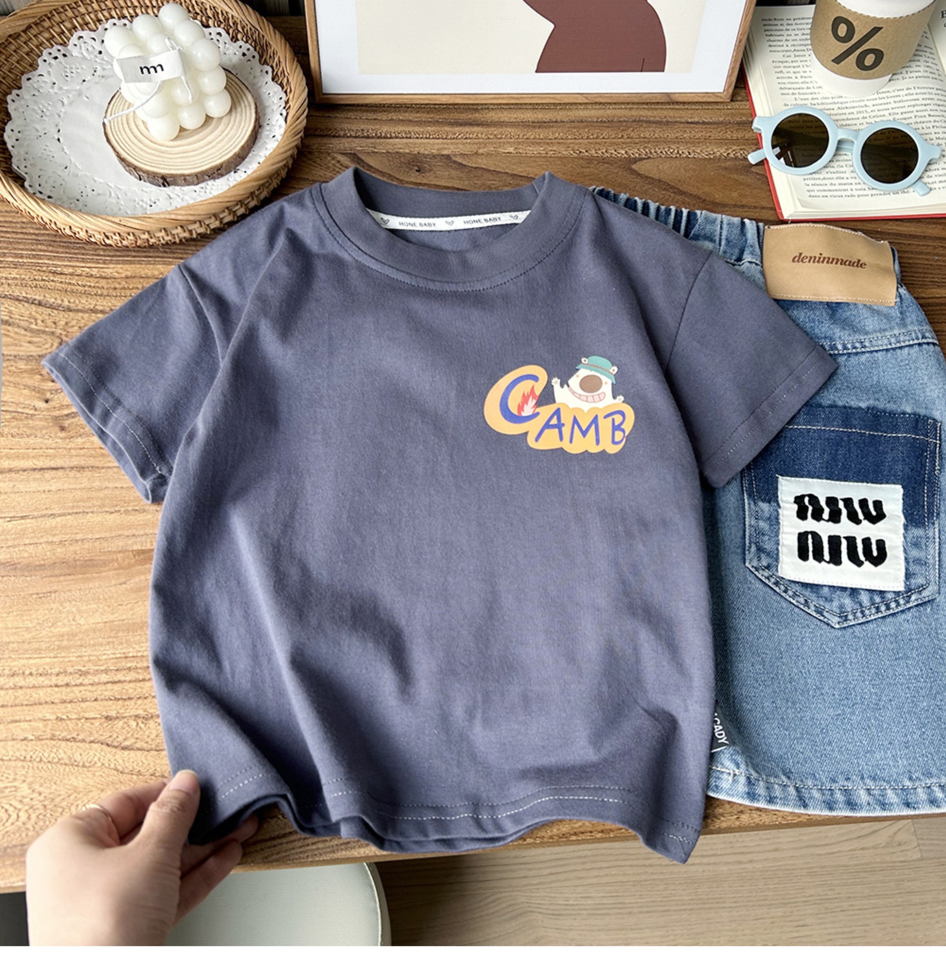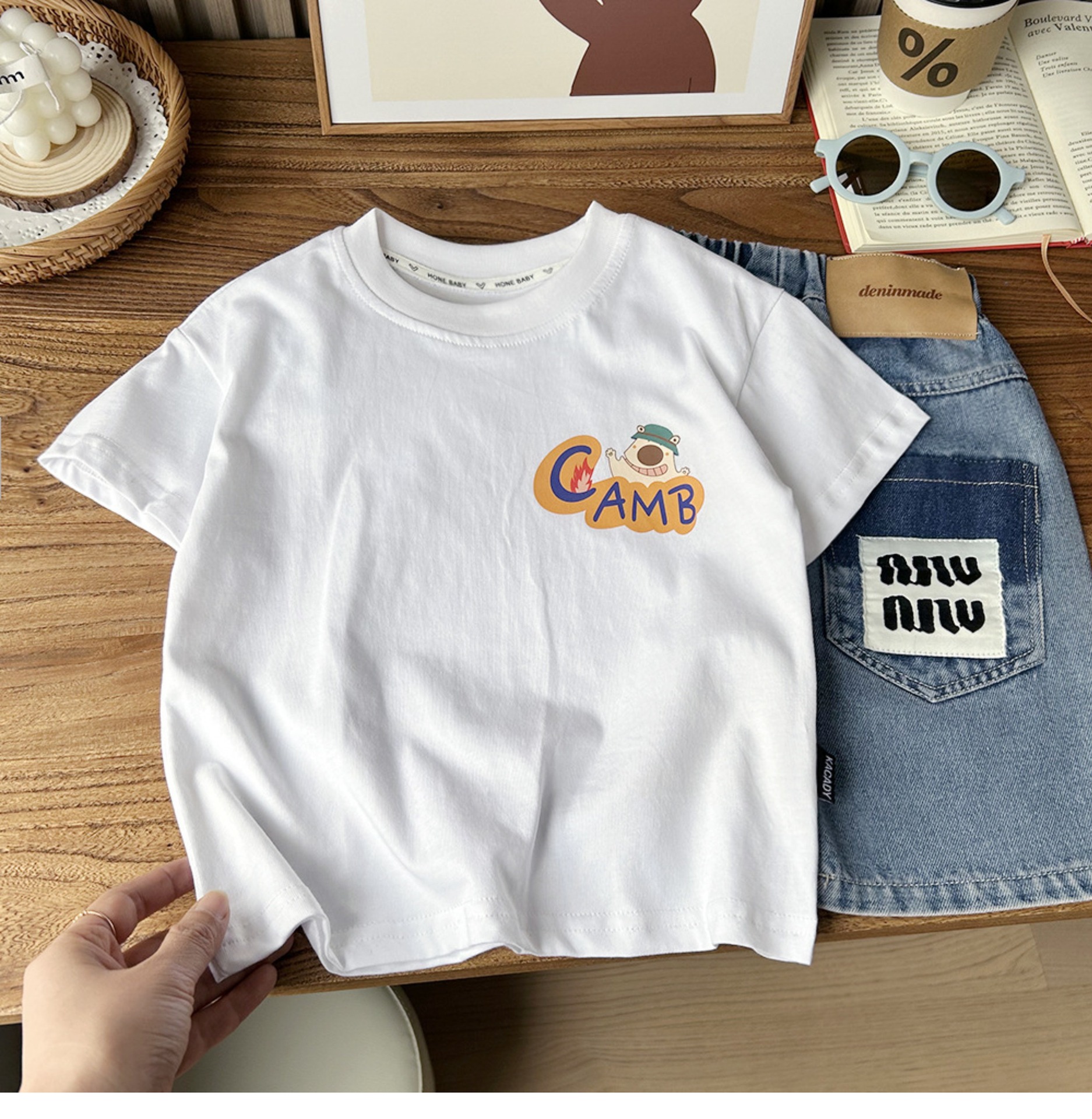 2024 여름 한국 아동복 큰 소년 만화 둥근 목 반팔 티셔츠 아이들의 얇은 느슨한베이스 셔츠스토어 가기