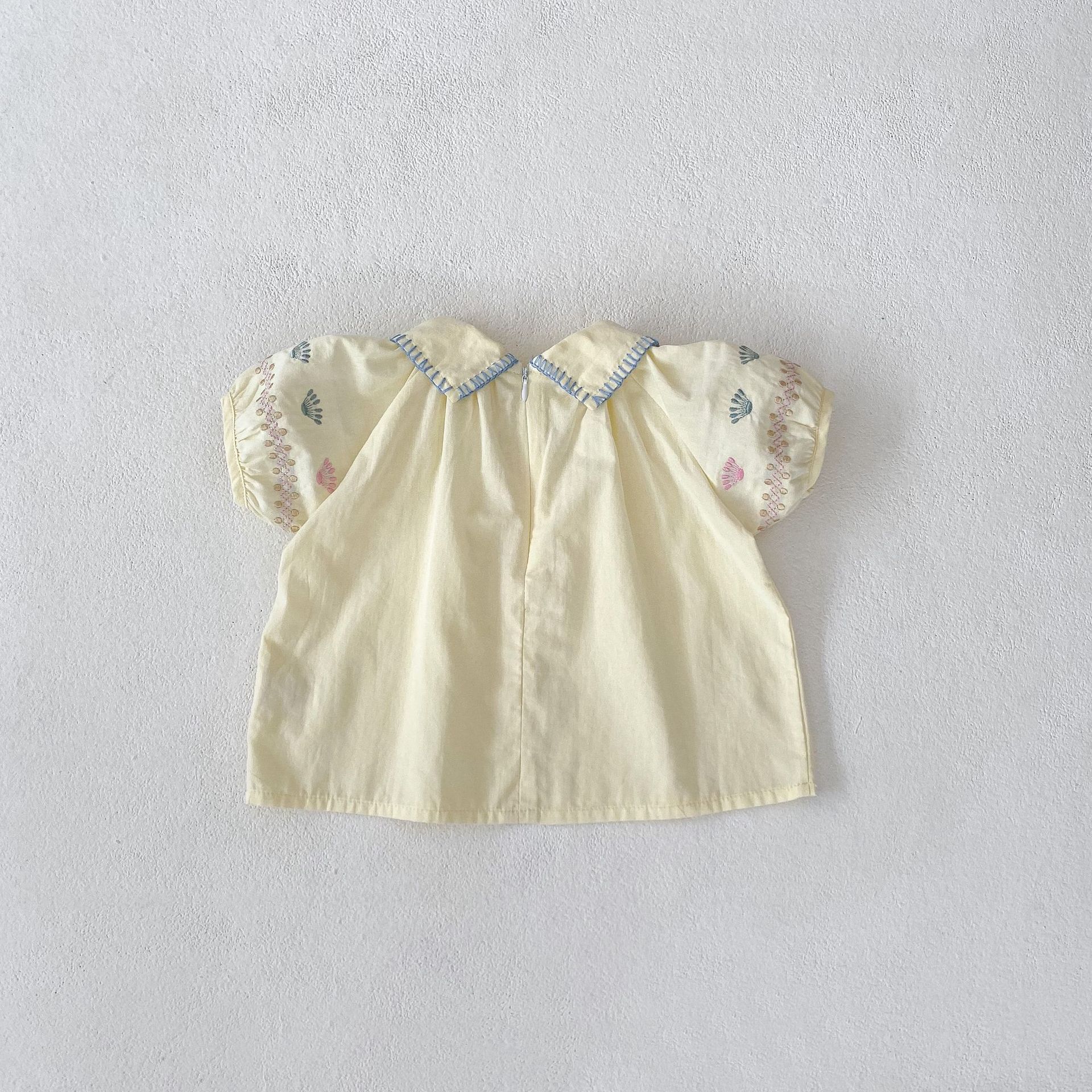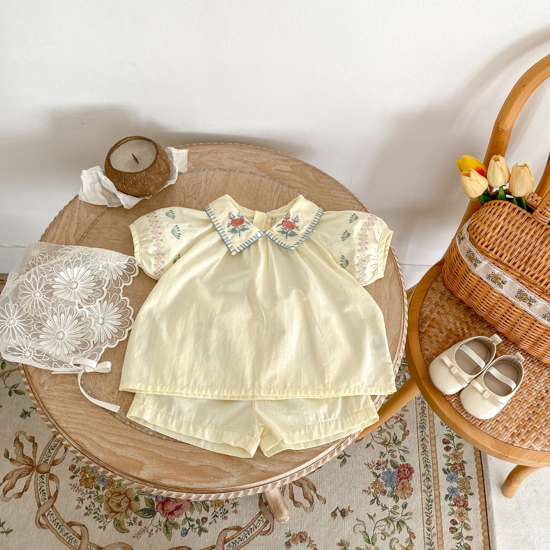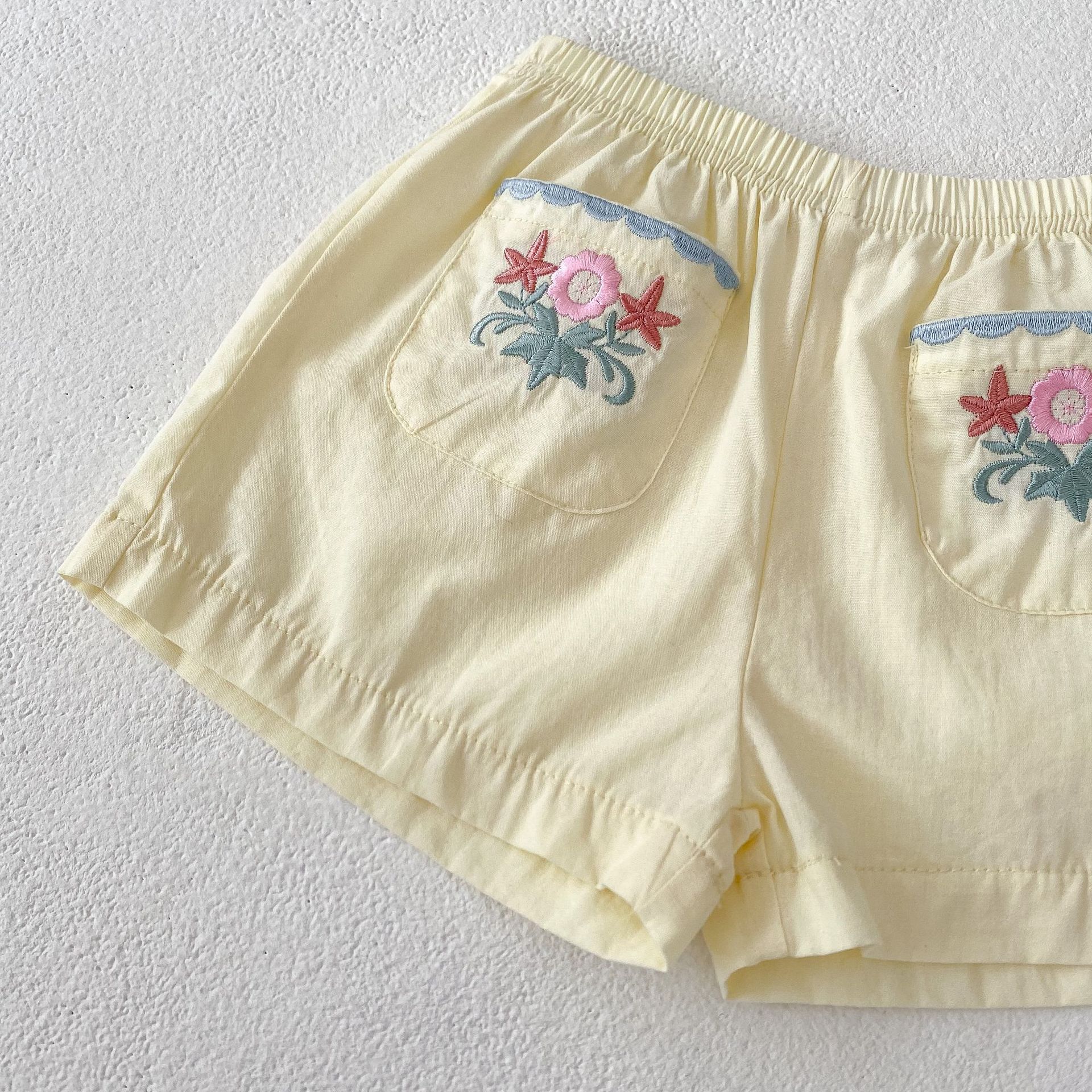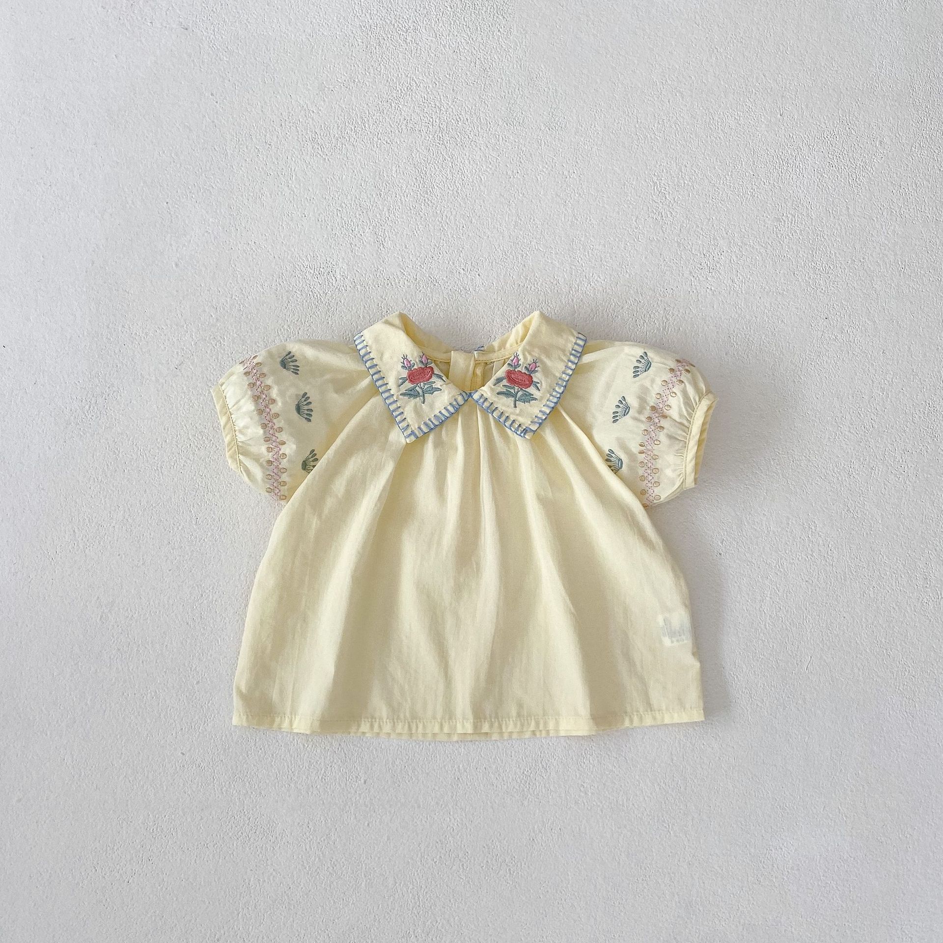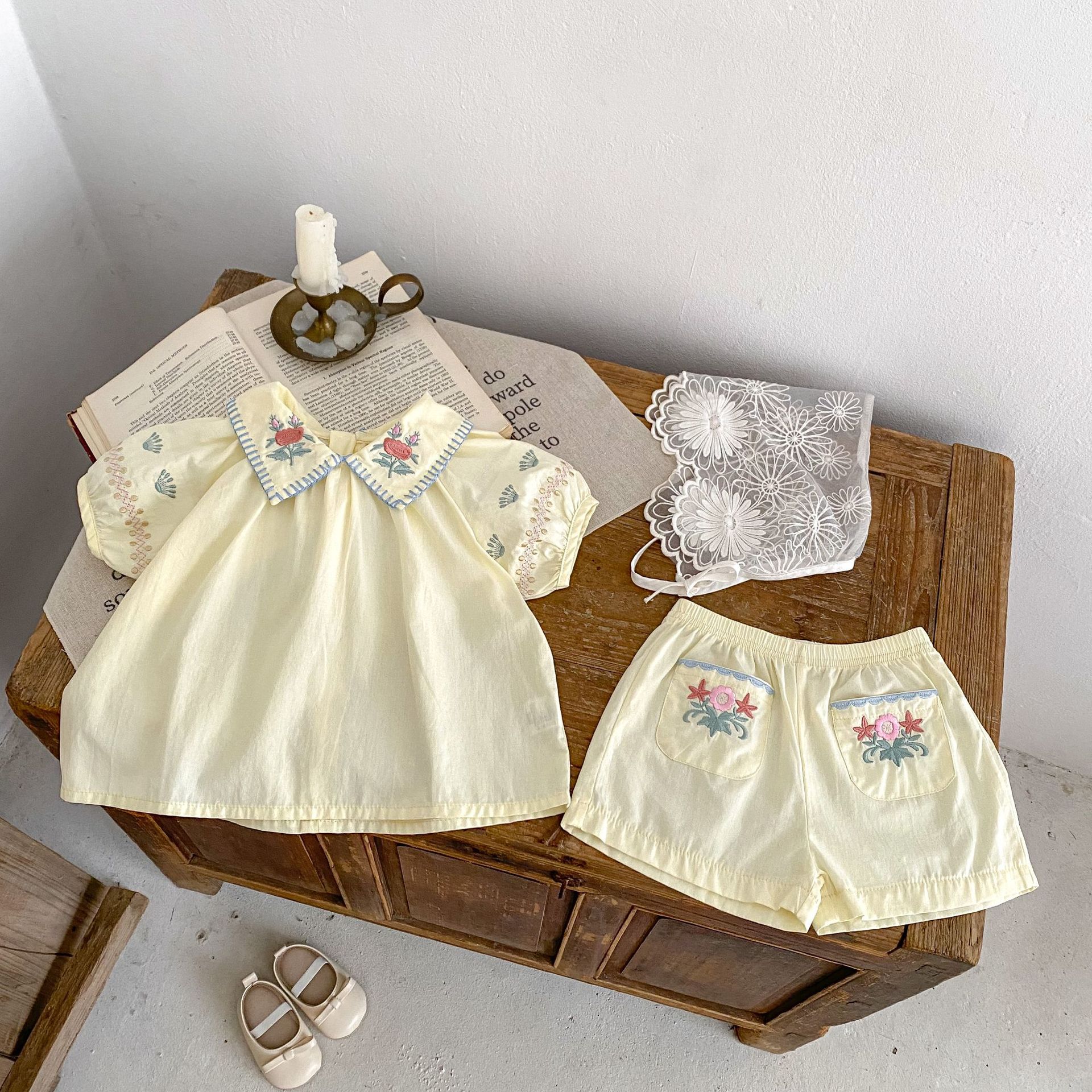 2025 여름 새 스타일 0-3 세 아기 소녀 꽃 수 놓은 옷깃 반팔 탑 + 얇은 반바지 2 피스 슈트스토어 가기