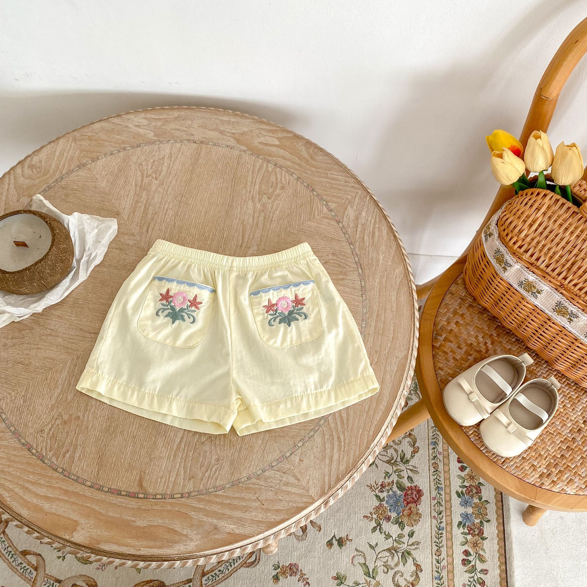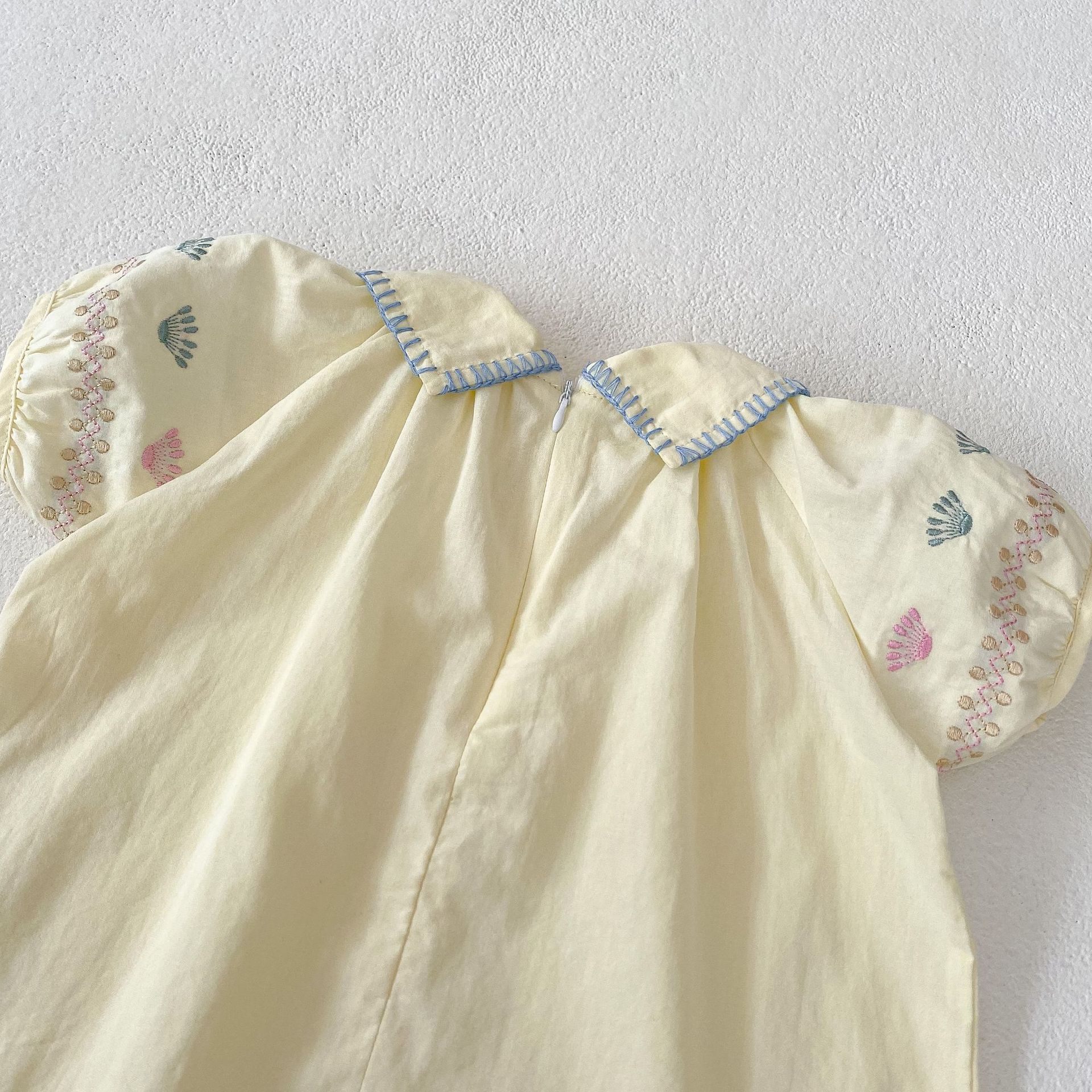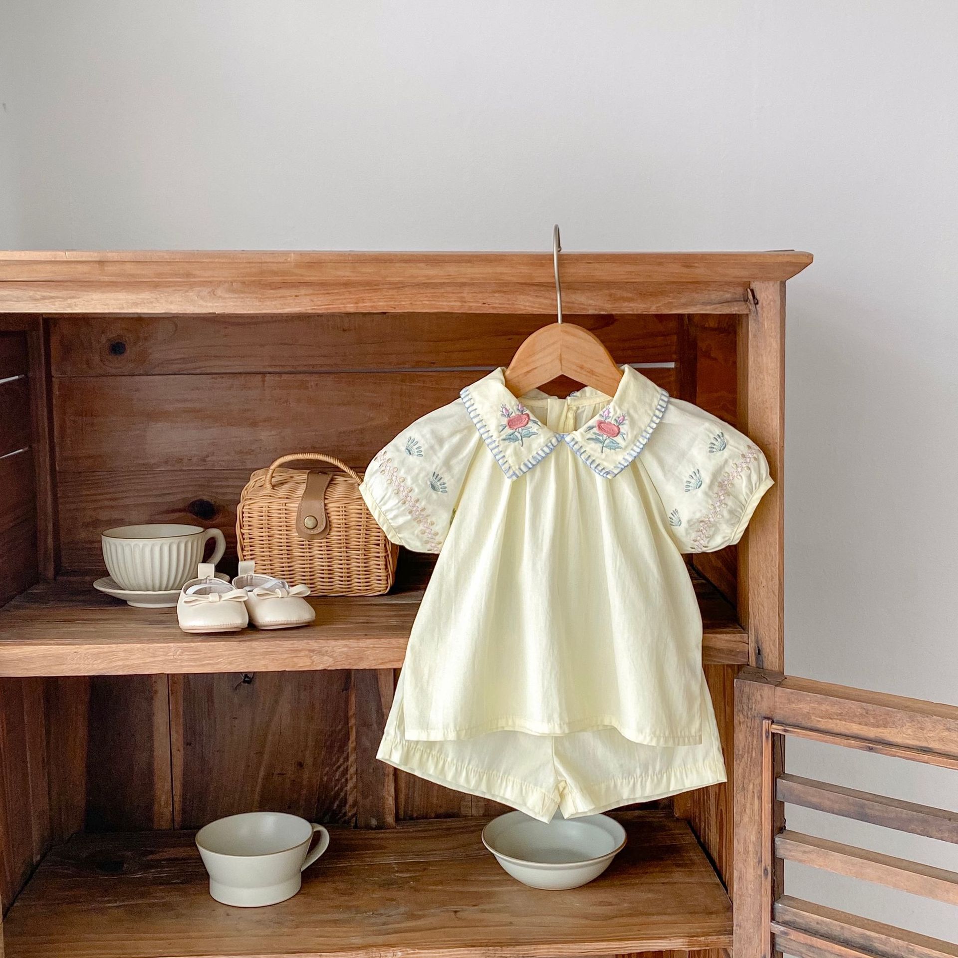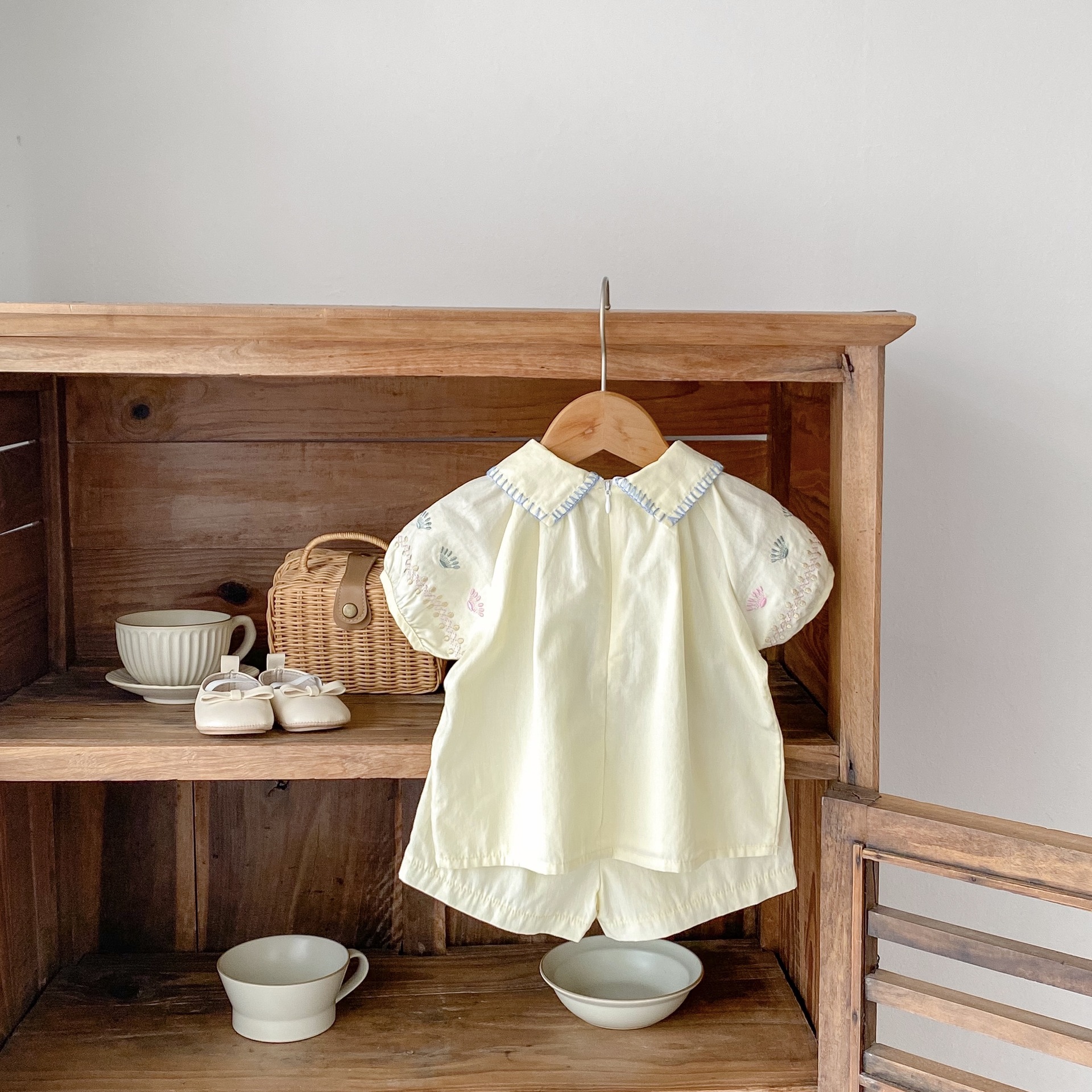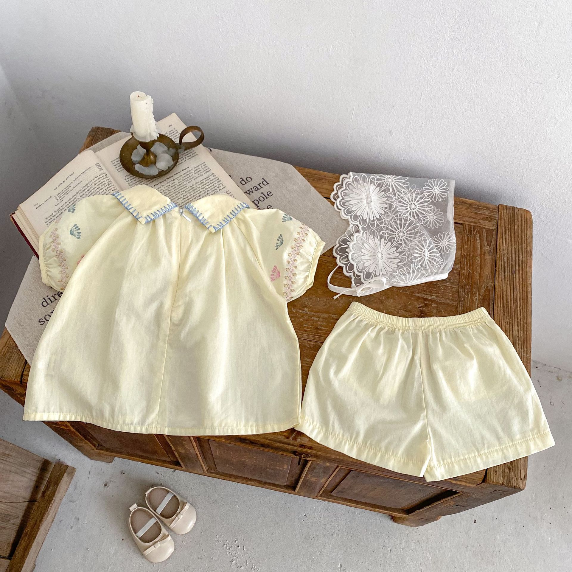 2025 여름 새 스타일 0-3 세 아기 소녀 꽃 수 놓은 옷깃 반팔 탑 + 얇은 반바지 2 피스 슈트스토어 가기
