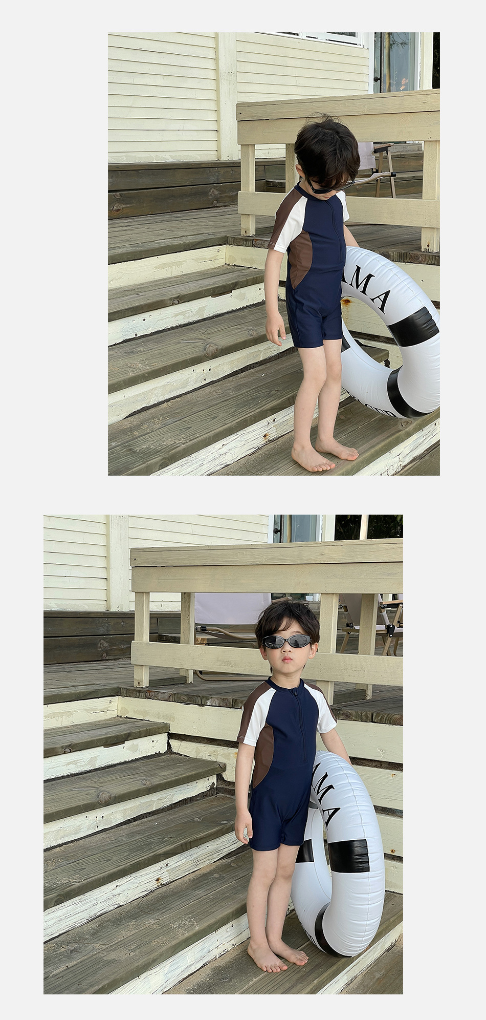 신형 수영복 중소형 어린이 소년 한국식 흑백 컬러 블록 반팔 선 스크린 빠른 건조 여름 수영복