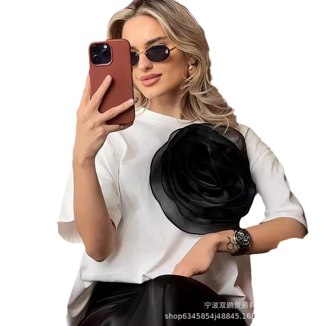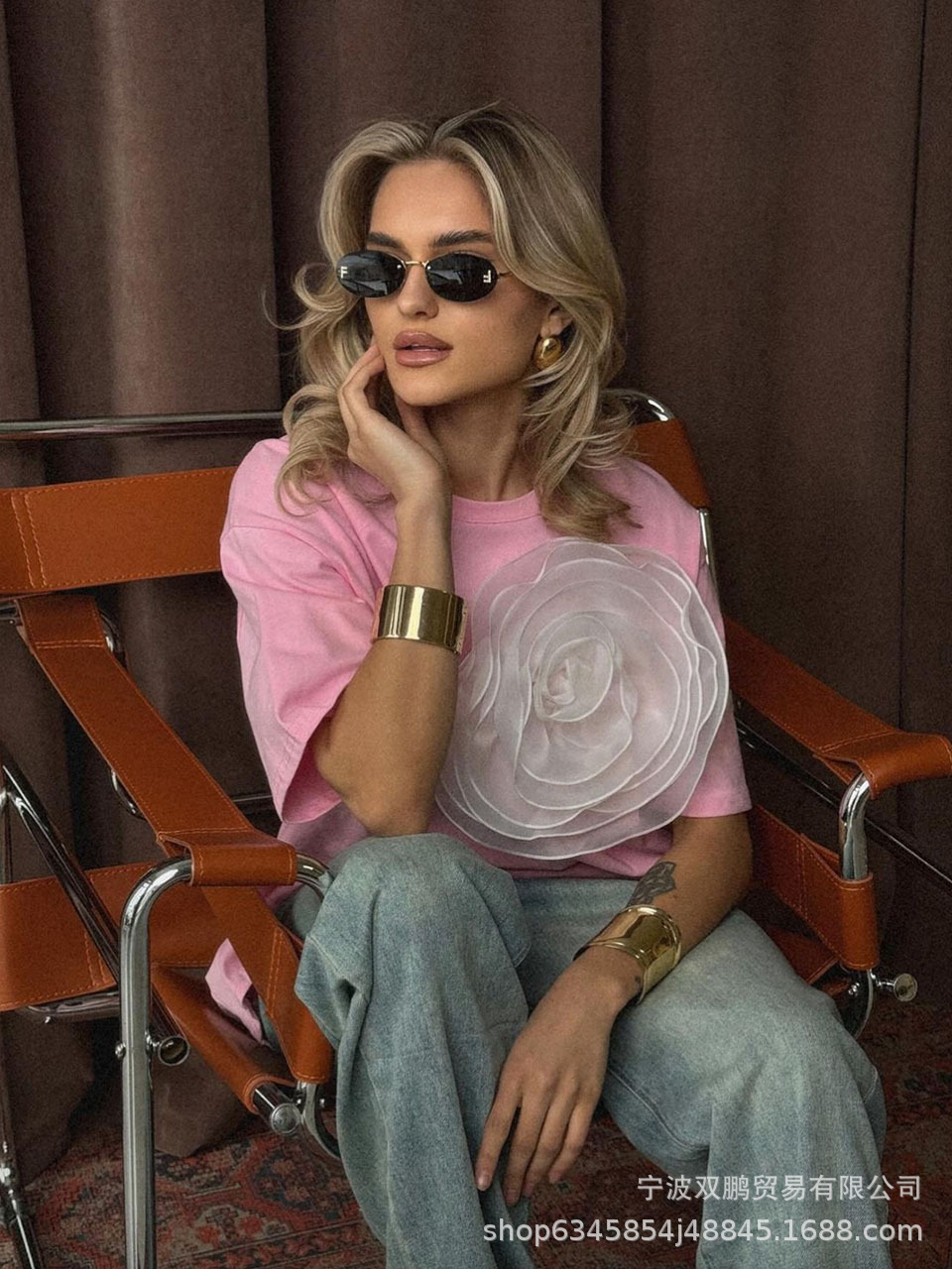 2025 국경 간 뜨거운 판매 유럽과 미국의 ins 스타일 느슨한 티셔츠 여성 입체 메쉬 동백 순수 코튼 반팔 탑