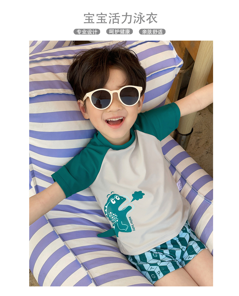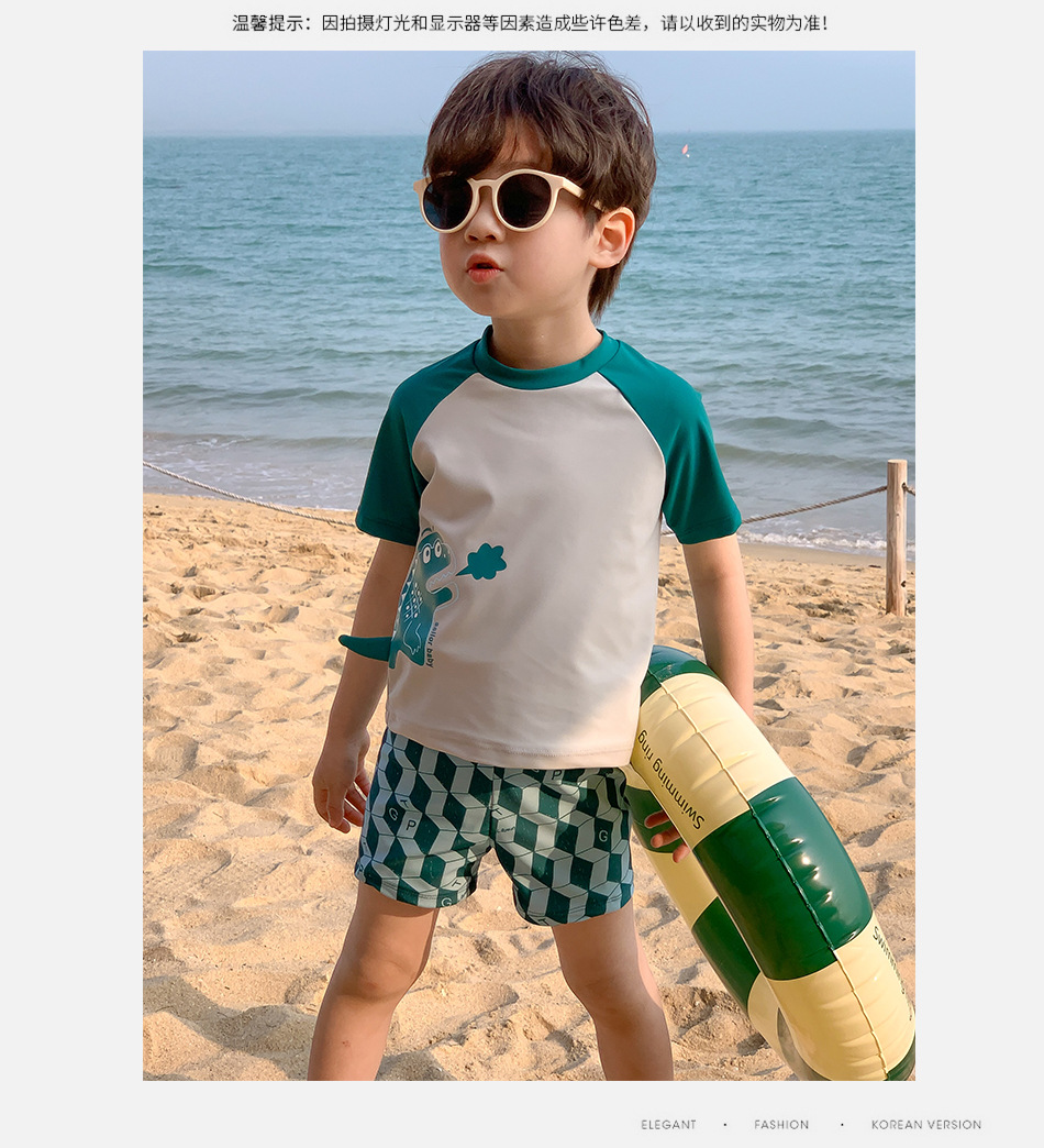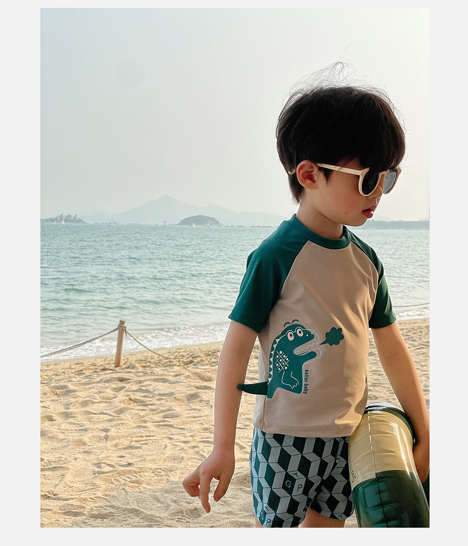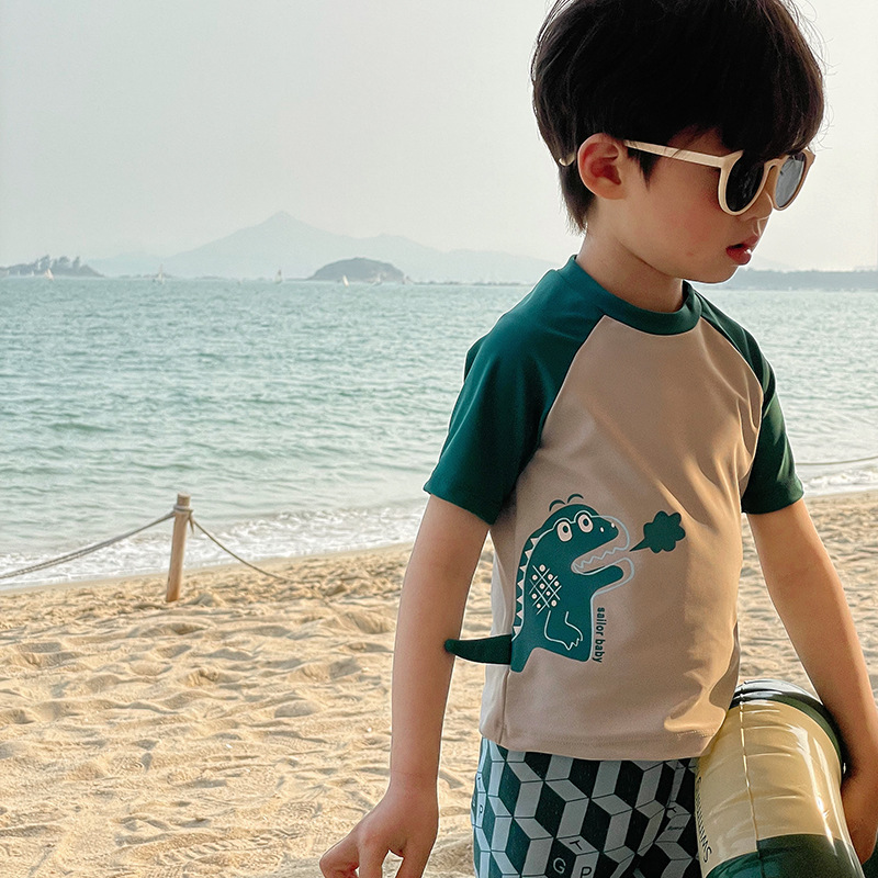 신형 수영복 중소형 어린이 소년의 귀여운 만화 공룡 분할 반팔 자외선 차단 빠른 건조 여름 수영복스토어 가기