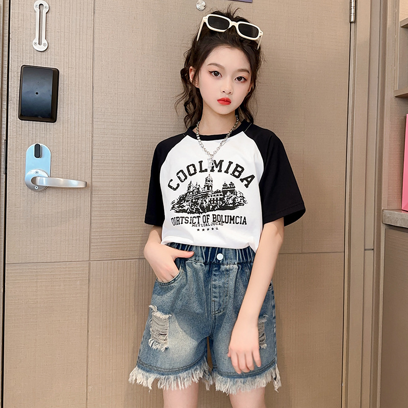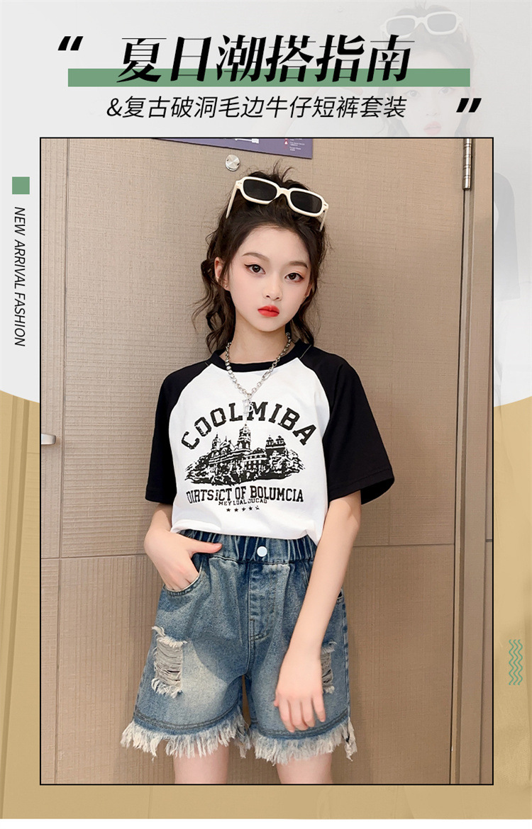소녀 여름 세트 2024 새로운 어린이 데님 반바지 여름 최고 얇은 소녀 여름 핫 세트 트렌디스토어 가기