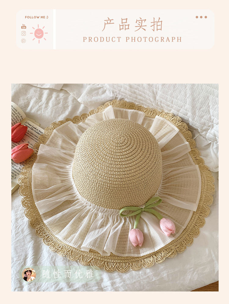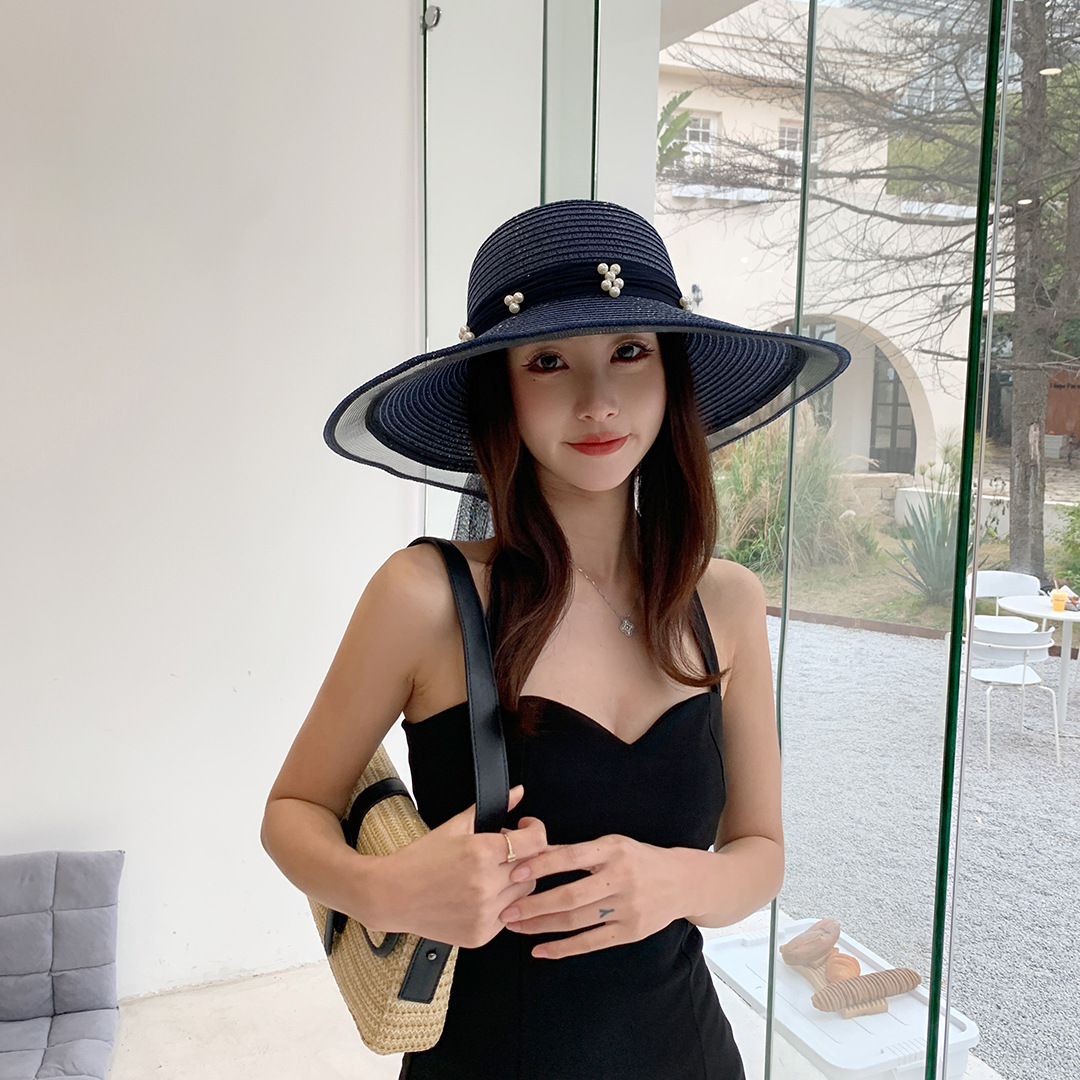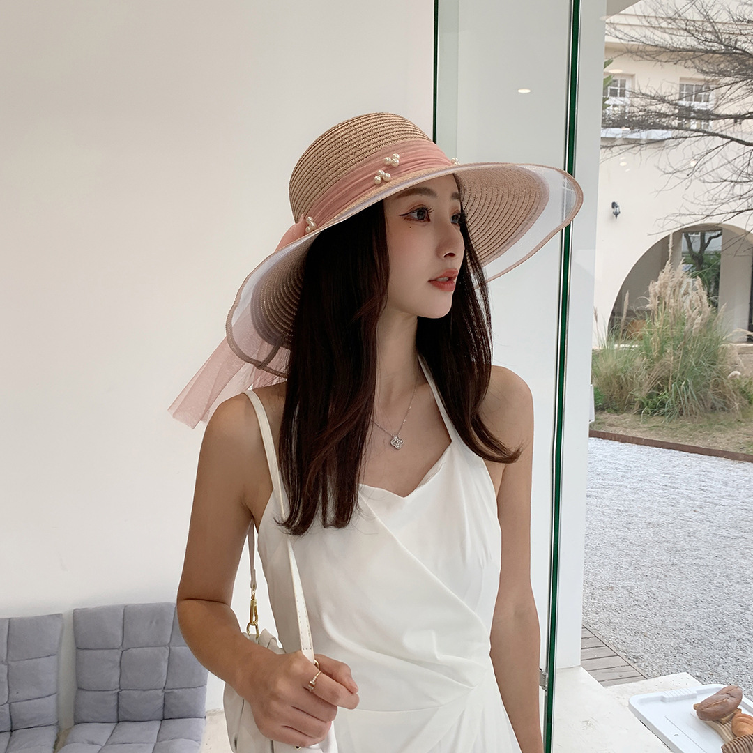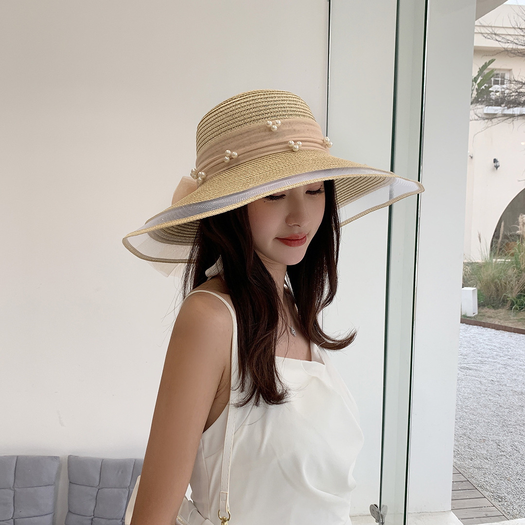 여성용 여름 야외 해변 모자, 큰 챙 튤립 모자, 진주 리본 자외선 차단 모자, 리본 밀짚모스토어 가기