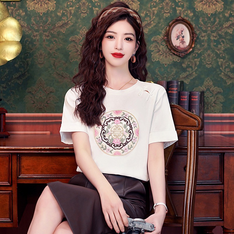 한국 스타일 민족 스타일 자수 중공 버튼 반팔 티셔츠 여성 봄과 가을 새로운 우아한 세련된 내부 탑스토어 가기