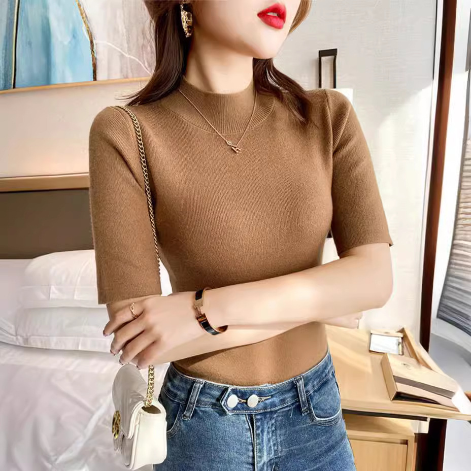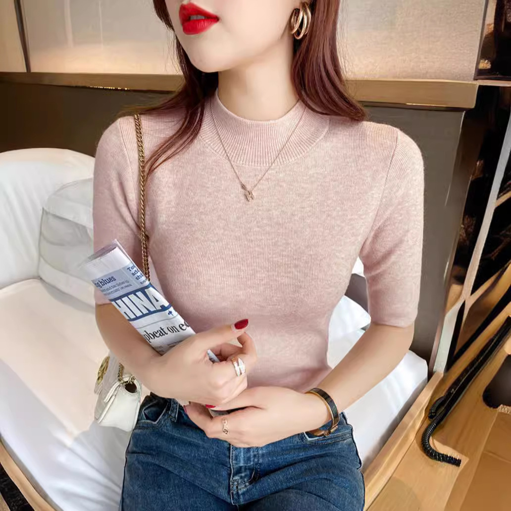 프랑스 스타일 블랙 하프 터틀넥 코어 스핀 원사 니트 반팔 티셔츠 여성용 봄과 여름 슬림 핏 내베이스 스웨터 탑스토어 가기