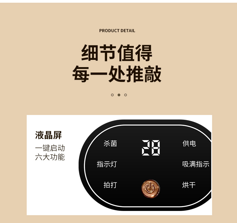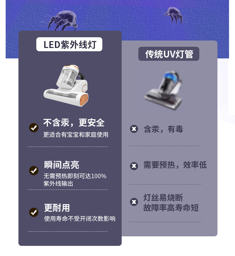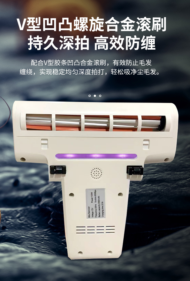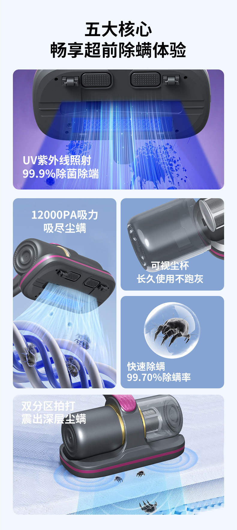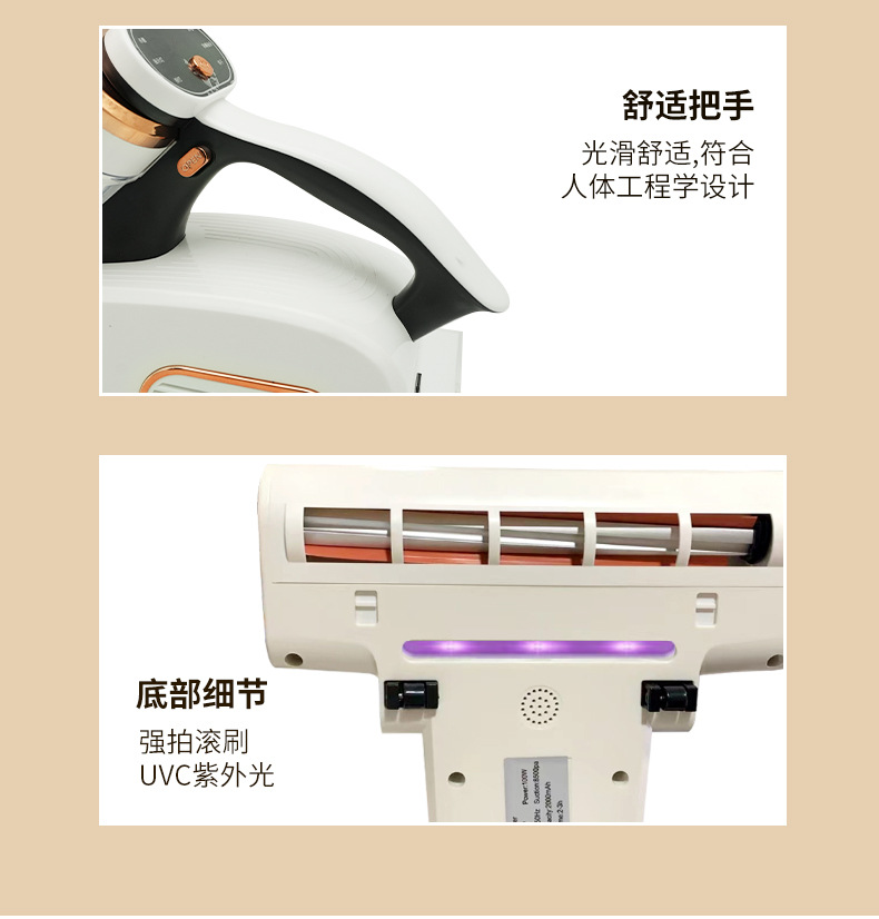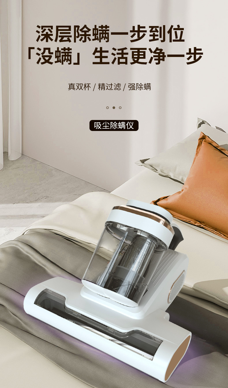 产品卖点:飓风强吸、强劲除螨、高频震拍、UV杀菌