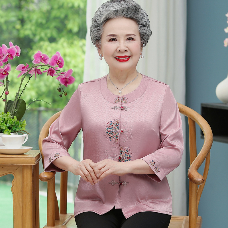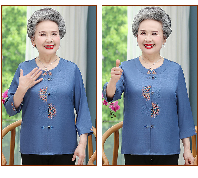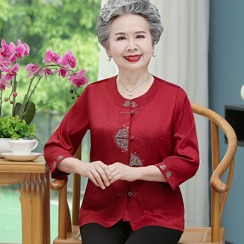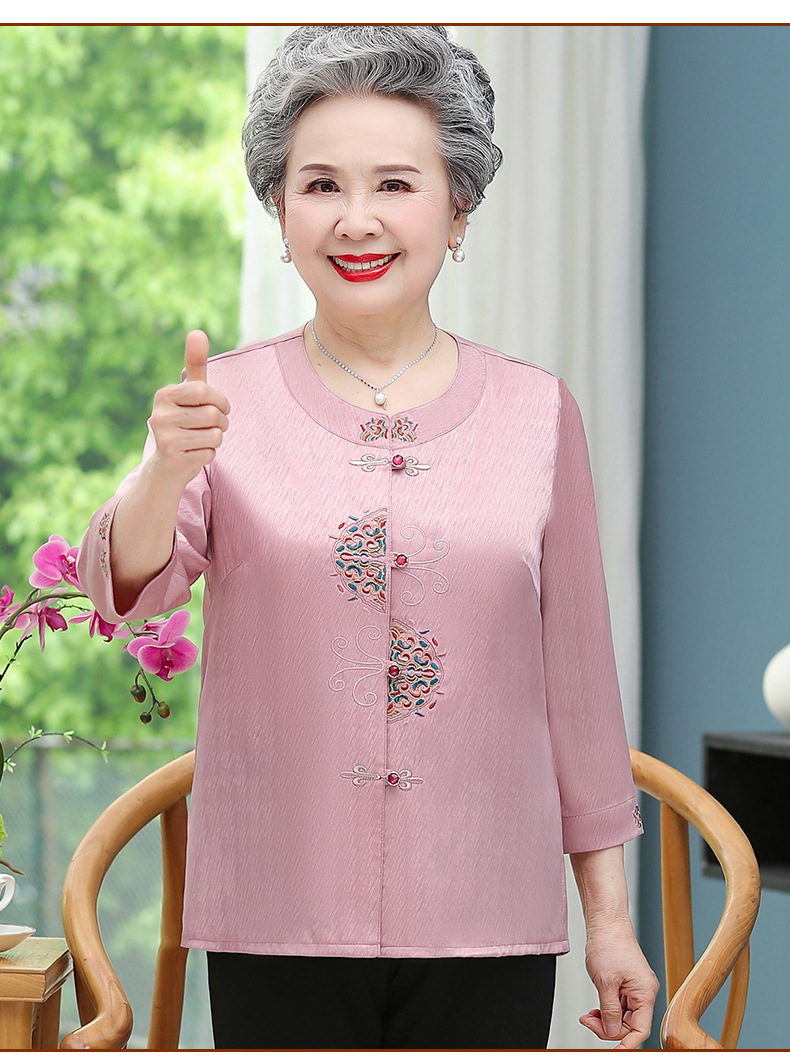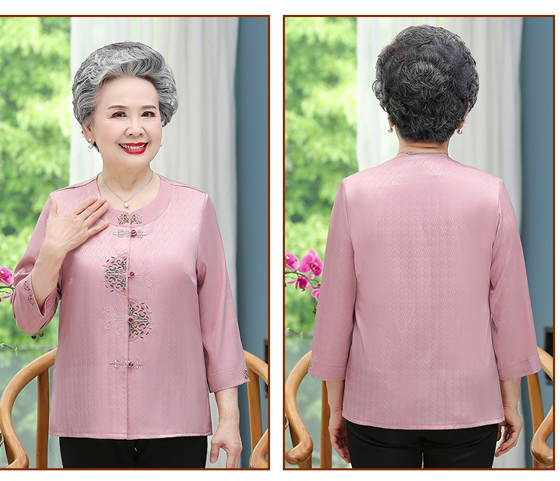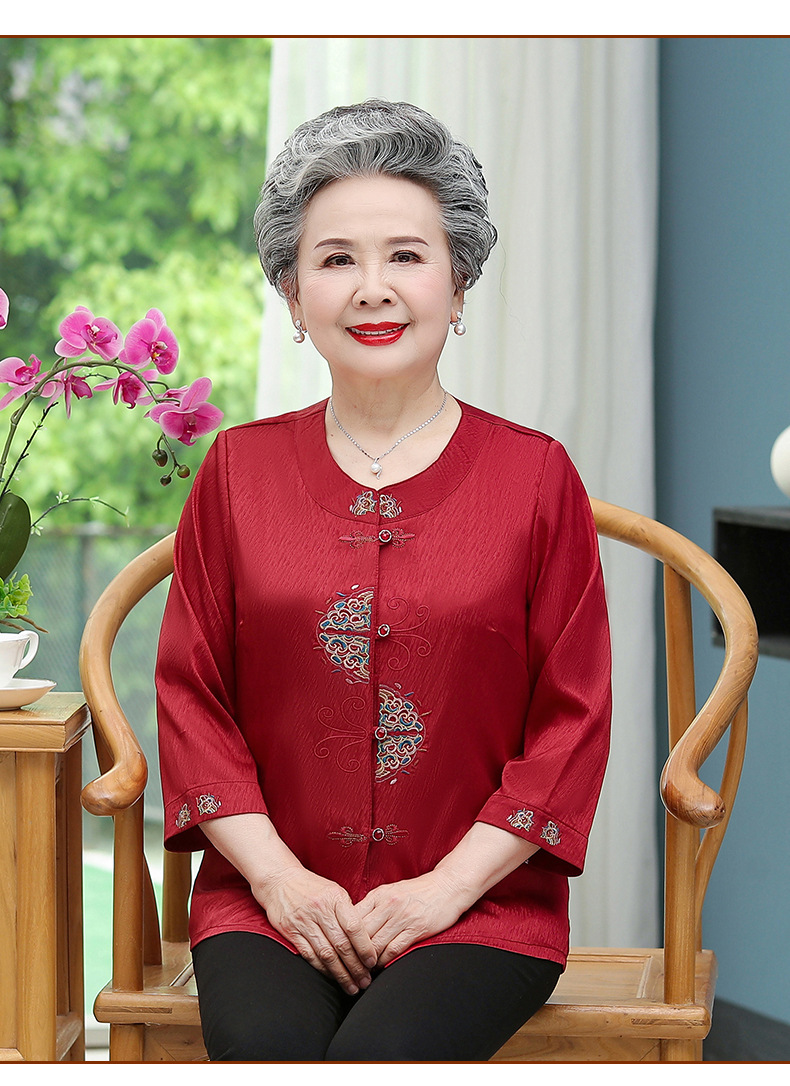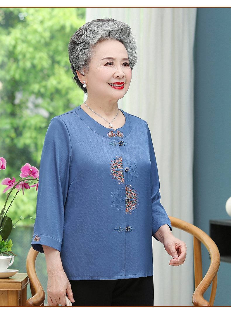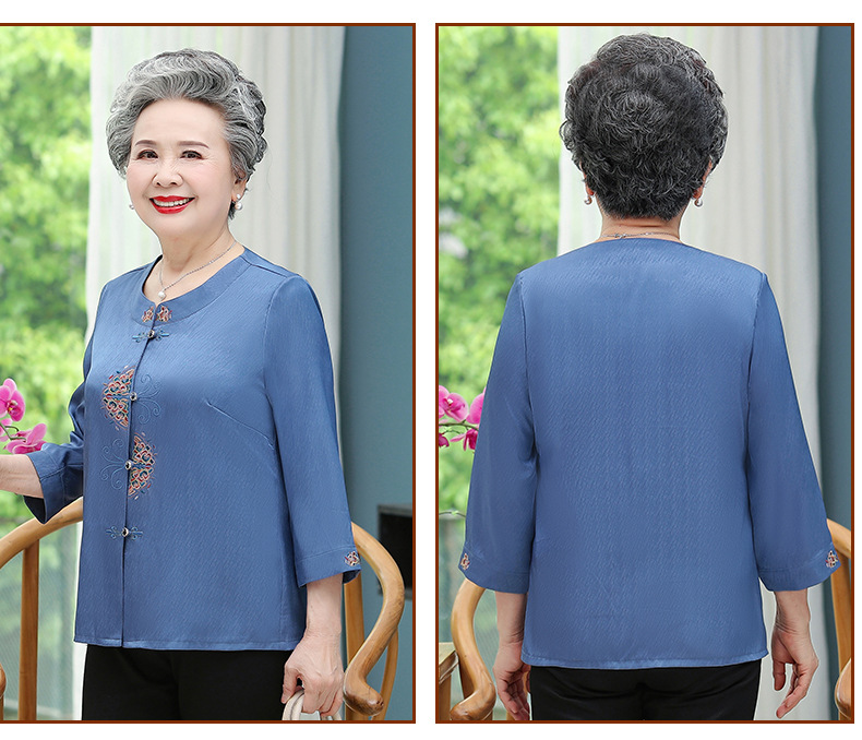 중년 및 노인 어머니 여름 의류 7 소매 복고풍 셔츠 탑 80 세 할머니의 중국식 카디건 셔츠